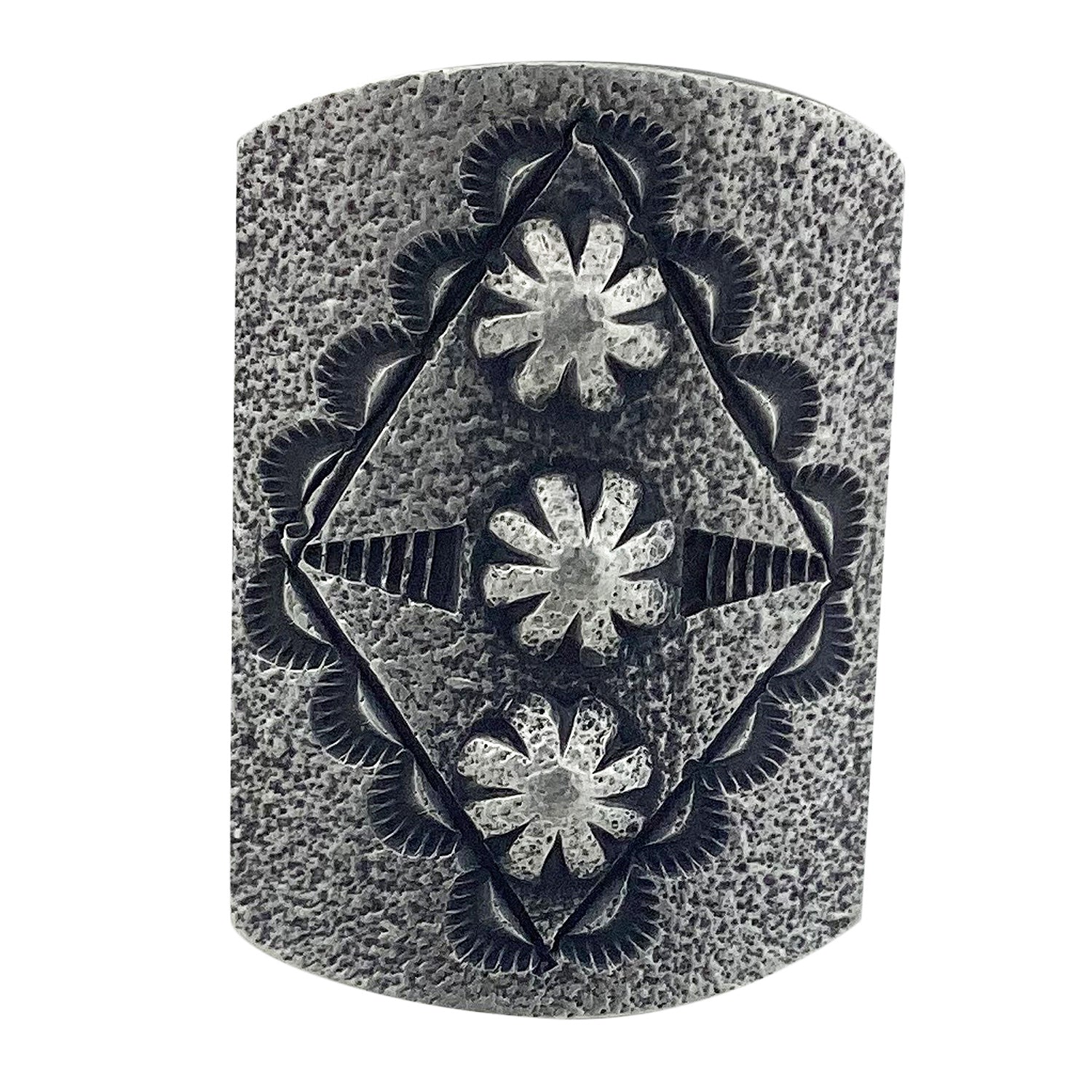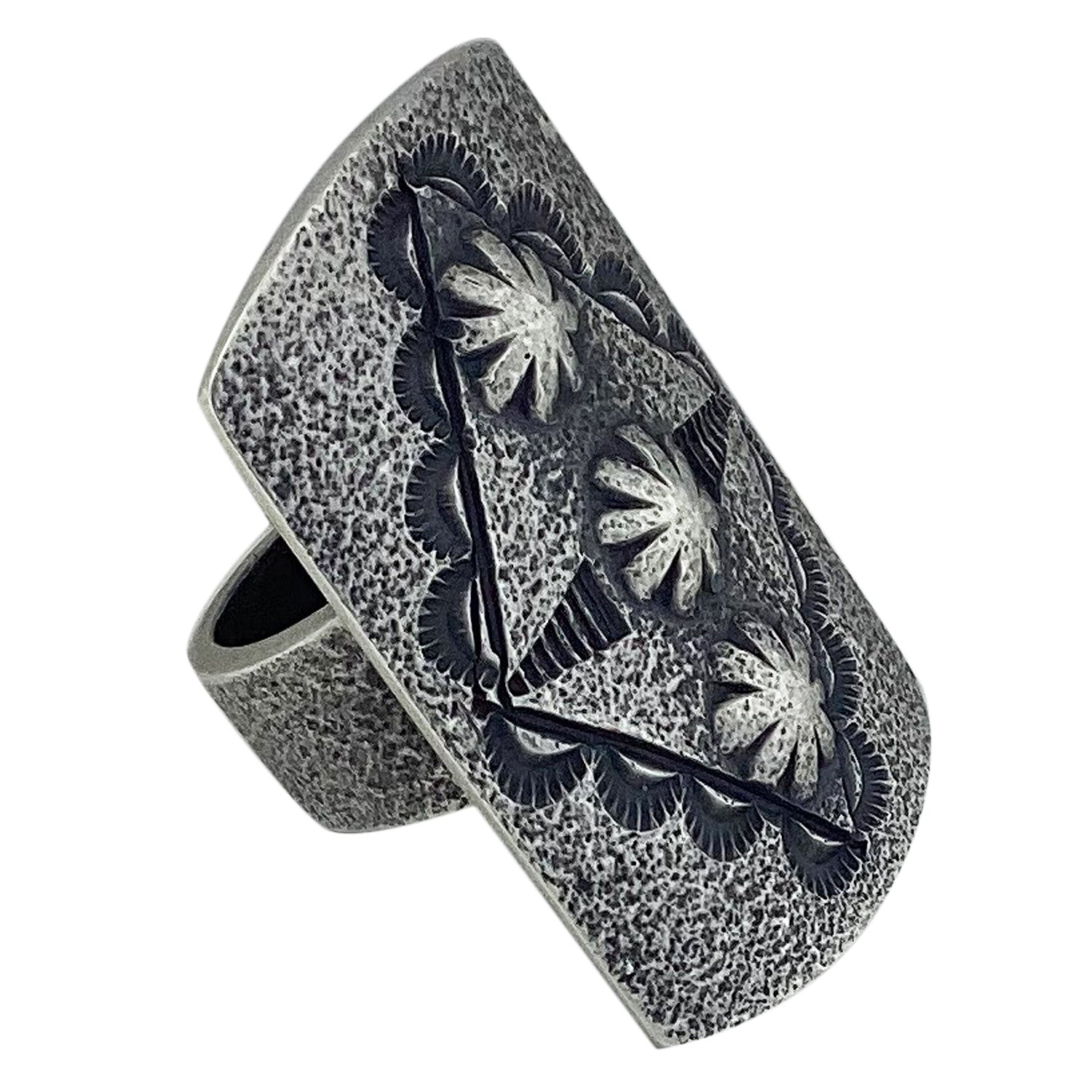 Navajo silversmith Monty Claw creates his work from the heart. Monty desires his work to be the best and he makes sure everything he creates is perfect. This big ring is filled with an explosion of bump out stars, three down the wide center. A great everyday piece for those of you who want an all silver piece without any turquoise. The silver shows off a combination of dark and shiny polished. Enjoy adding another talented and young Navajo silversmith to your collection.