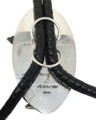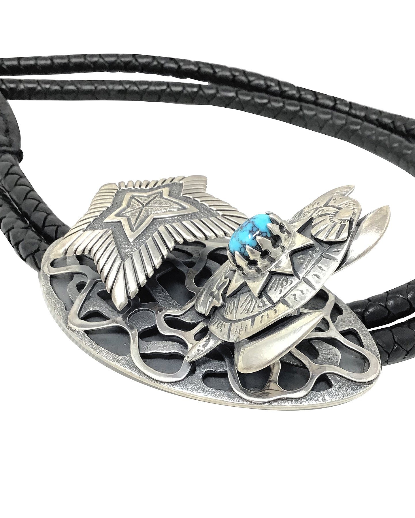The ocean is a mystery and fascinating to so many of us. Especially the creatures that call it home. Nothing might be as recognizable as the large sea turtle. Navajo award-winning artist Monty Claw captures that iconic creature in this one-of-a-kind bolo. The turtle swims next to floating ocean growth along with a unique starfish. A rich piece of spider web turquoise finds a home on the turtle's back. Wear this bolo to show off your love of contemporary Native American art. Monty completes the bolo tie with handmade tips and a braided leather bolo cord.