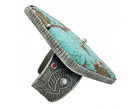 Not every jewelry artist wants the challenge of such a huge rock. However, Monty Claw is no ordinary artist and has turned the rock into a piece of wearable art. The stone is huge and weighs over 1000 carats. It is a piece of Number Eight Turquoise that showcases that legendary golden honey spider web matrix against a rich blue color. Monty carves a piece of tufa stone to create the perfect silver setting. You will find the silver filled with a water scene that includes carved dragonflies along with other colorful shells and coral. Monty brings the silver and stone together with a strip of inlay coral across the collectible Number Eight stone. This is going to be the biggest cuff in your collection, and probably the most striking. Enjoy adding this unique Native American work to your collection.
