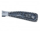 Navajo silversmith Monty Claw talks about watching his father as a young boy. The inspiration, tools and techniques have followed him into adulthood. He talked to us about attempting to make a knife as a boy. That led to us asking Monty to make one for the Trading Post. What we got back blew us all away. We never expected to get a knife that looked like it came from an experienced maker. The handle is beautifully done in his tufa cast style with multi-stone inlay on one side with a carved silver eagle on the other. A stainless steel blade that has a unique grind pattern fits securely into the sterling handle. This is the first in what we hope is a series of knifes from Monty, enjoy something a little different.