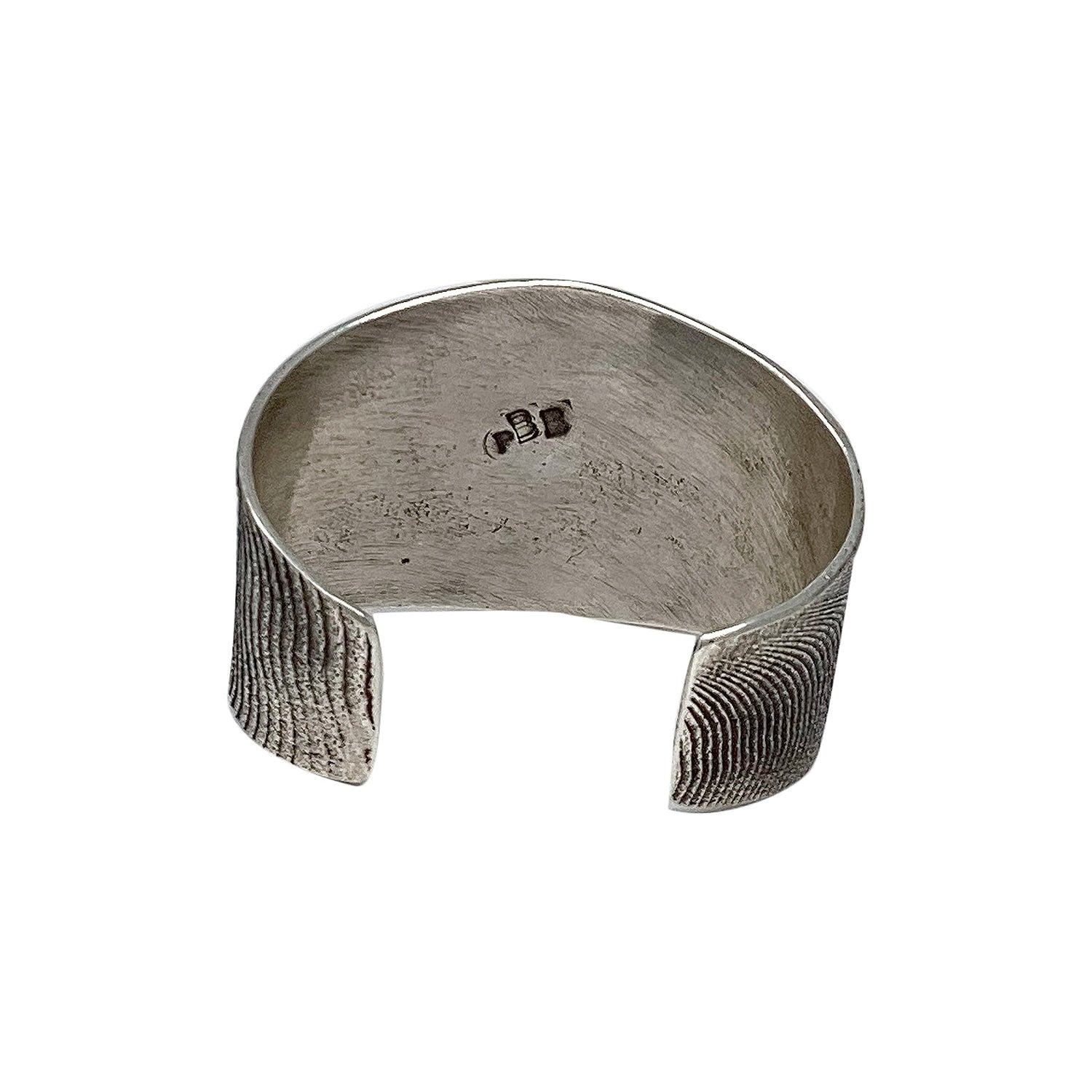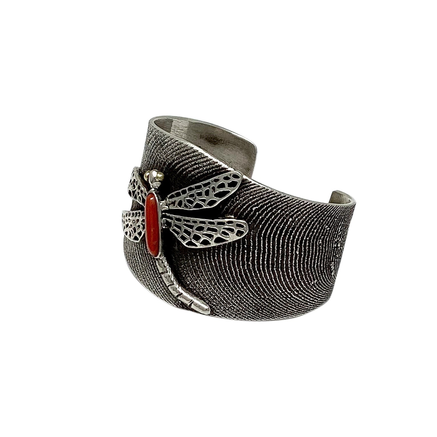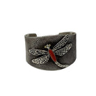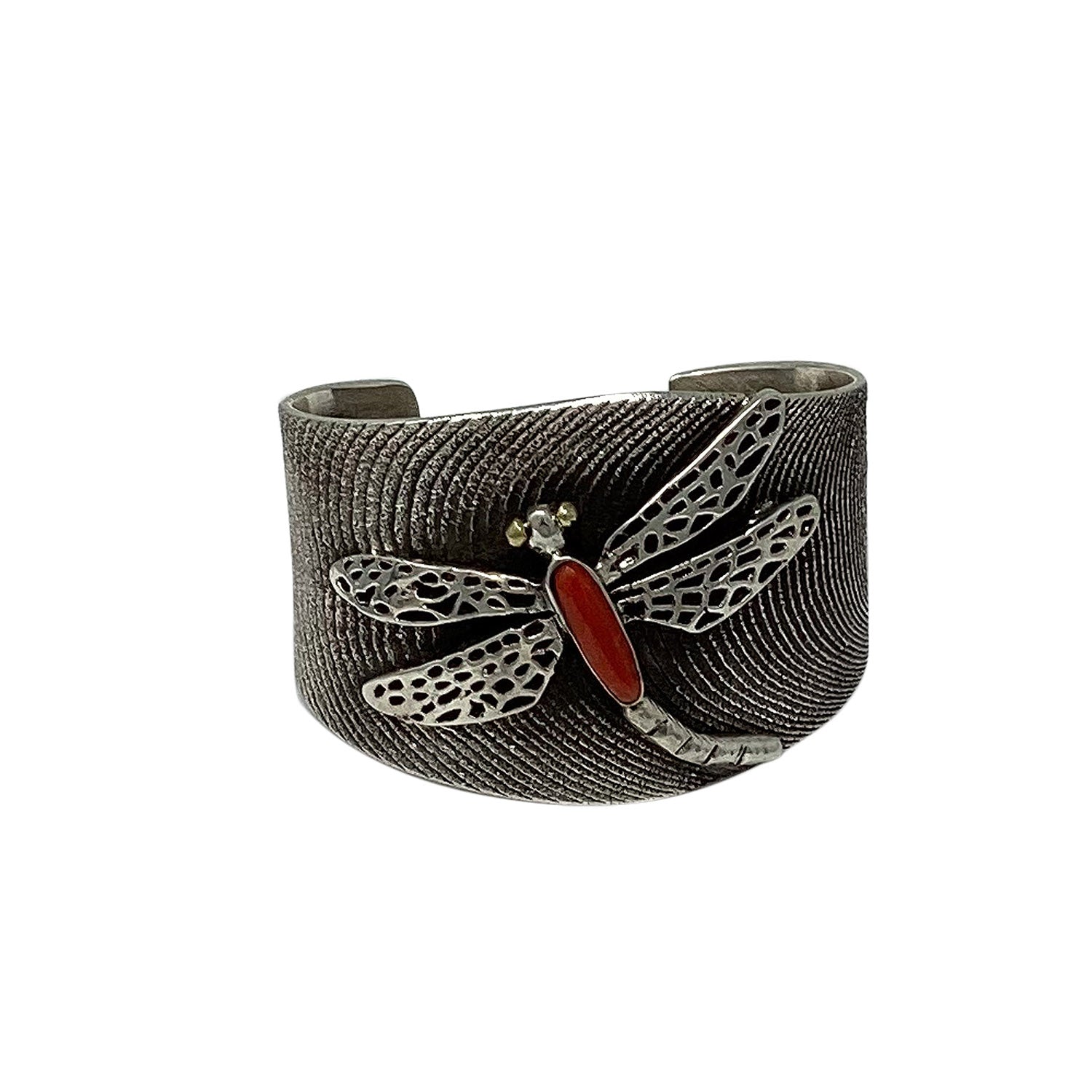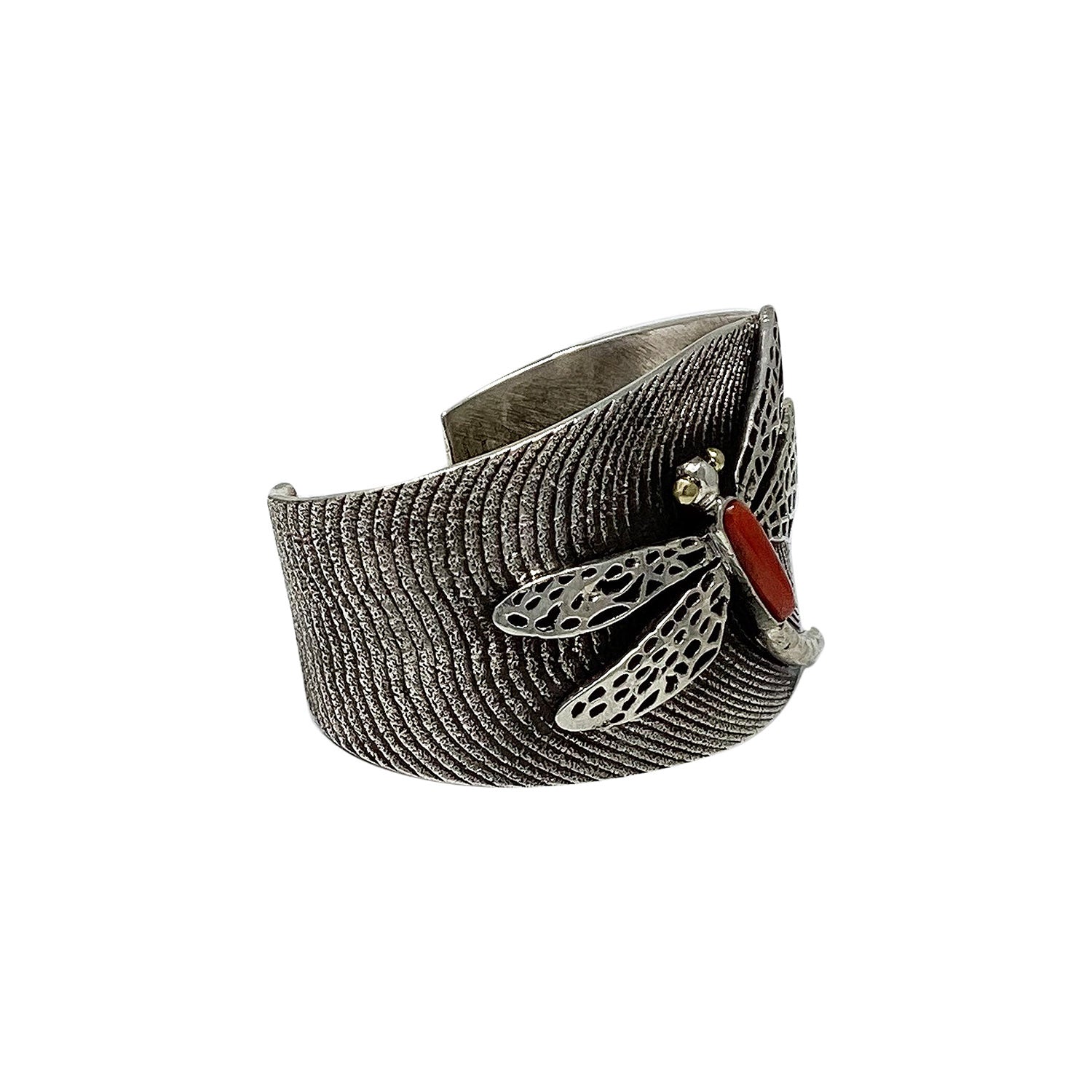 Navajo tufa artist Philander Begay made this great dragonfly bracelet. He has carved the magnificent wave designs and added an overlay dragonfly to bring this bracelet together. When you run your fingers across the top of the bracelet you feel an almost grainy sand texture, just one of the great attributes of tufa cast silver. Philander has filled the inside of the bracelet with a very smooth rustic finish. Set in the center of this piece of handmade art is a very beautiful and deep red coral stone as the center body of the dragonfly. Just a great bracelet that shows your appreciation of First American handmade wearable art, plus it looks wonderful on.