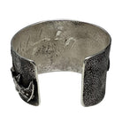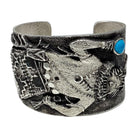 In the Hopi culture the Kachina lived with the people and would help them make decisions during migration to the Four Corners. The Kachinas would eventually leave the people here alone to make their own decisions. During ceremonies dancers will dress in a Kachina costume to bring back the spirit of the Kachina to help lead again. Navajo artist Philander Begay retells the story of the Kachina dancer on the high Hopi mesas in this magnificent cuff. He designs the piece by carving the design into tufa stone that he collects from the Hopi area. A wonderful way to show your appreciation of Hopi & Navajo cultures.