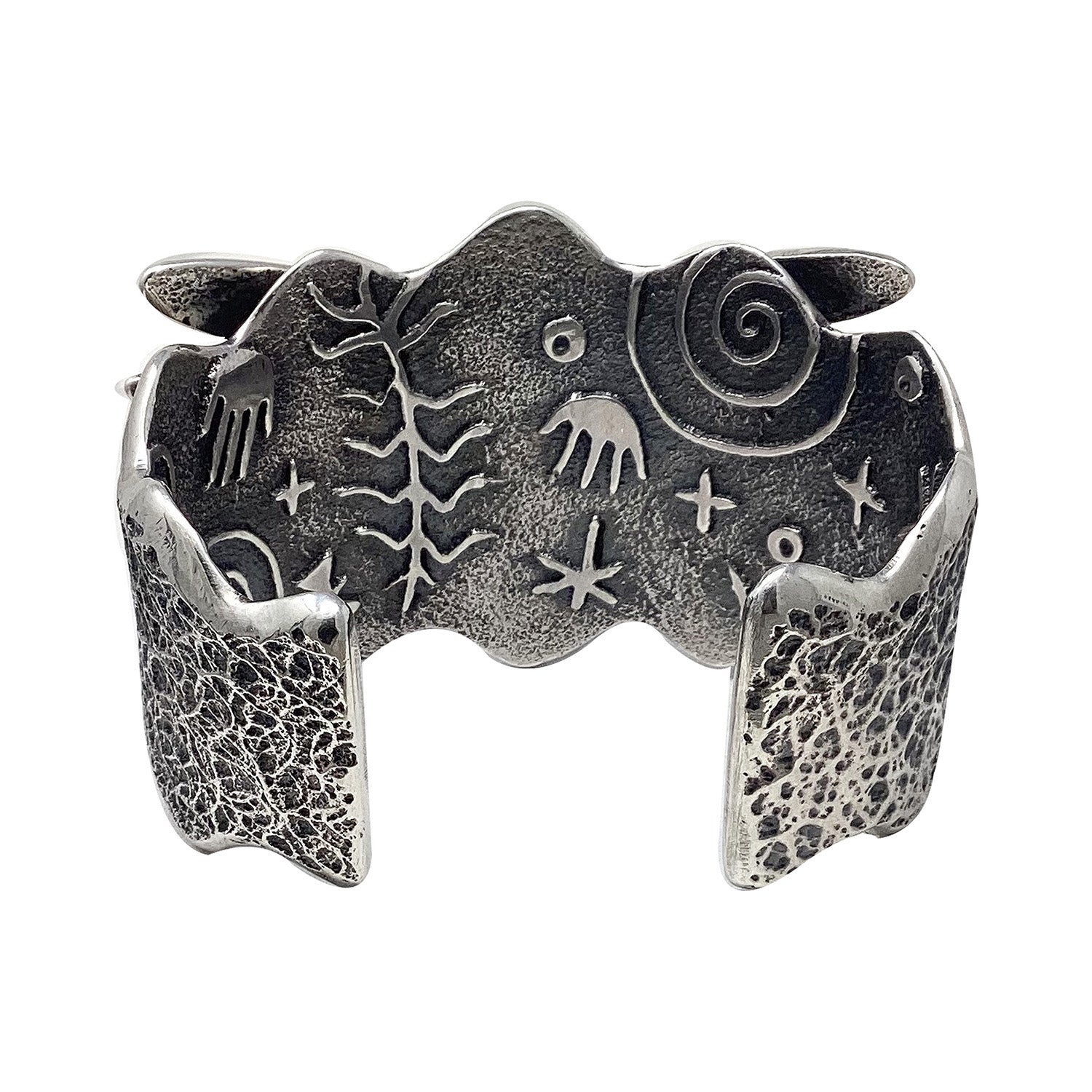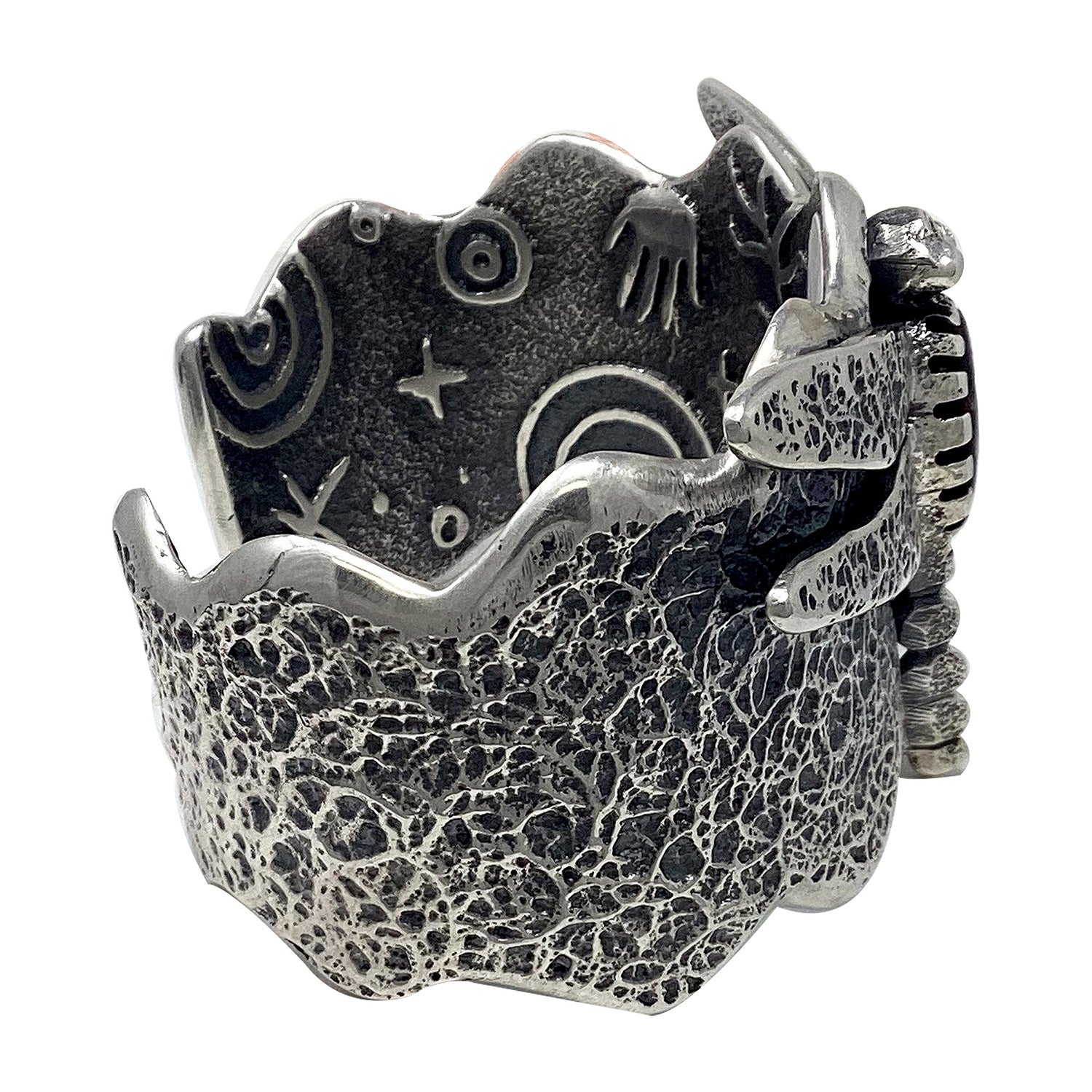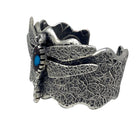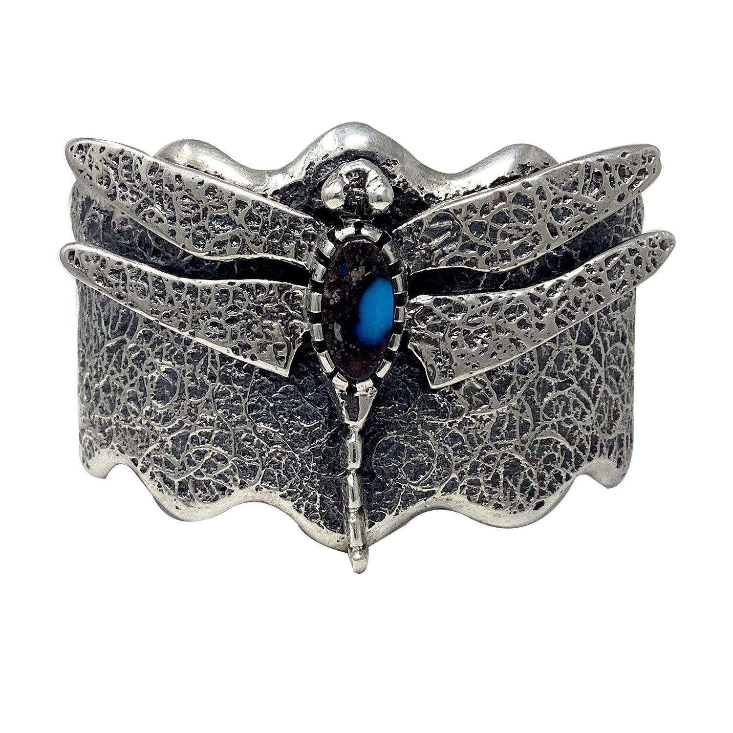 Navajo tufa artist Philander Begay made this great dragonfly bracelet. He has carved the magnificent wave designs and added an overlay dragonfly to bring this bracelet together. When you run your fingers across the top of the bracelet you feel an almost grainy sand texture, just one of the great attributes of tufa cast silver. Philander has filled the inside of the bracelet with a southwest design. Set in the center of this piece of handmade art is a very beautiful and deep blue Bisbee Turquoise stone as the center body of the dragonfly. Just a great bracelet that shows your appreciation of First American handmade wearable art, plus it looks wonderful on.