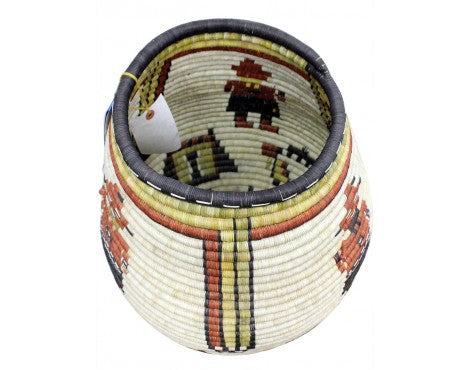 Hopi coil basket weaving isn't something you learn overnight. All of the weavers we have baskets from grew up in a house that wove baskets, something that was introduced to them from an early age. You will find these basket weavers on the Second Mesa. We have an interview with Irene Lamayaktewa who talked a little bit about the colors you find and the materials in coil basket. "We make the coil basket from straw and yucca that we pick from areas around Hopi. Many of the colors are from the yucca plant, yellow comes from yucca being harvested in winter, the white is summer, and the green can be picked any time of the year. Also, we will use sunflower for the black and Hopi Tea (hohocy) for the red." Make sure you look through our online collection. We have both baskets and plaques.