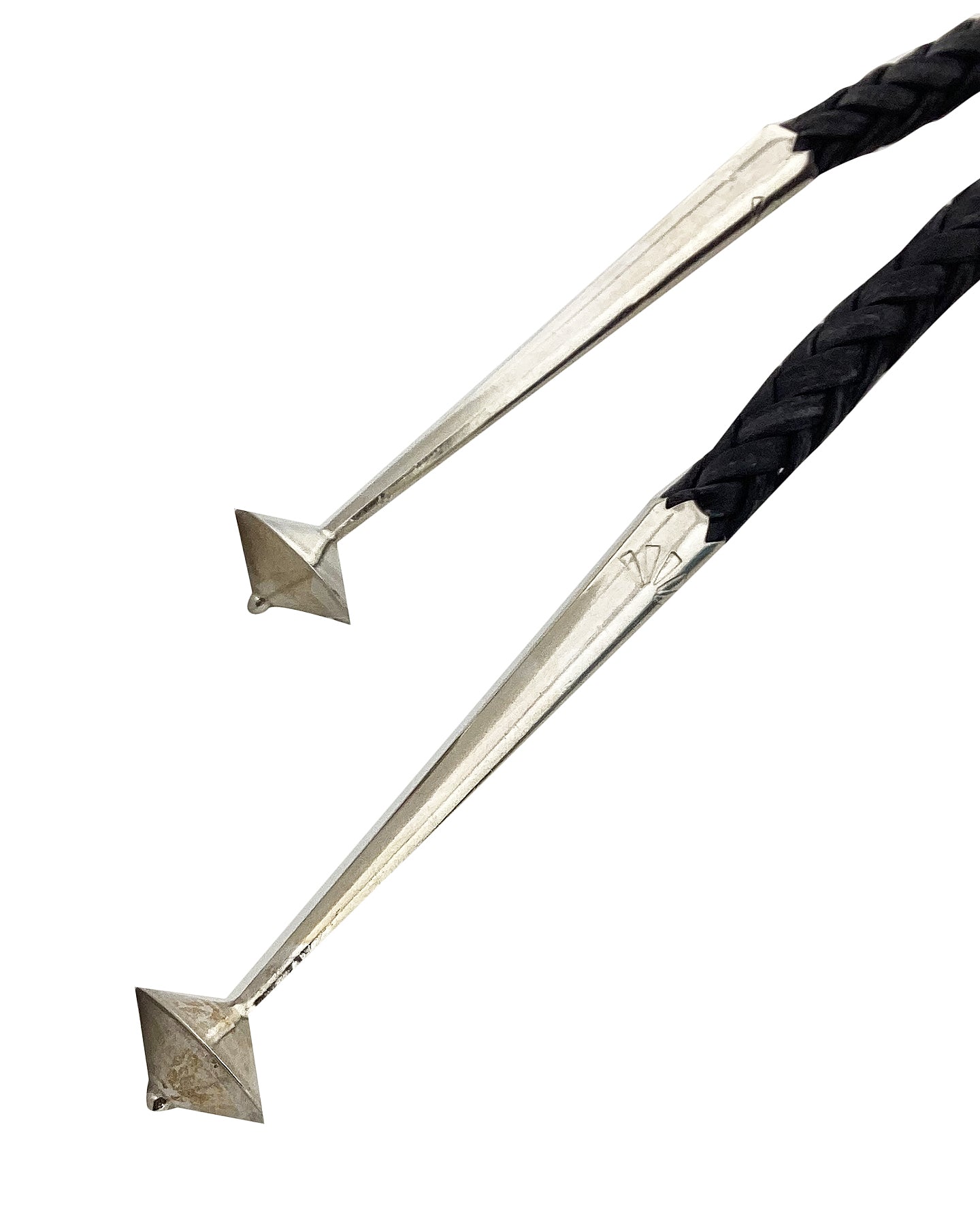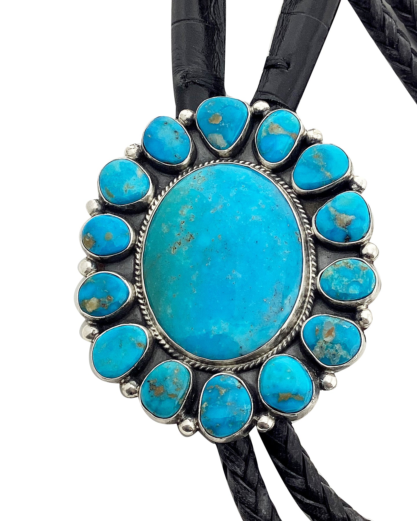 New Mexico is a unique place. We have a landscape that consists of deserts, red rock mesas, and Rocky Mountain peaks. The people are just as unique. It only makes sense that our State’s official tie is the bolo. Navajo silversmith Tyler Brown uses a cluster of Sonoran Rose Turquoise stones to make this stunning bolo tie. You will find the rocks showcase a deep blue color that radiates off of the sterling silver background. Tyler finishes the bolo with a braided leather bolo cord and sterling silver tips. Our State bird is the roadrunner, that is pretty cool too.