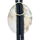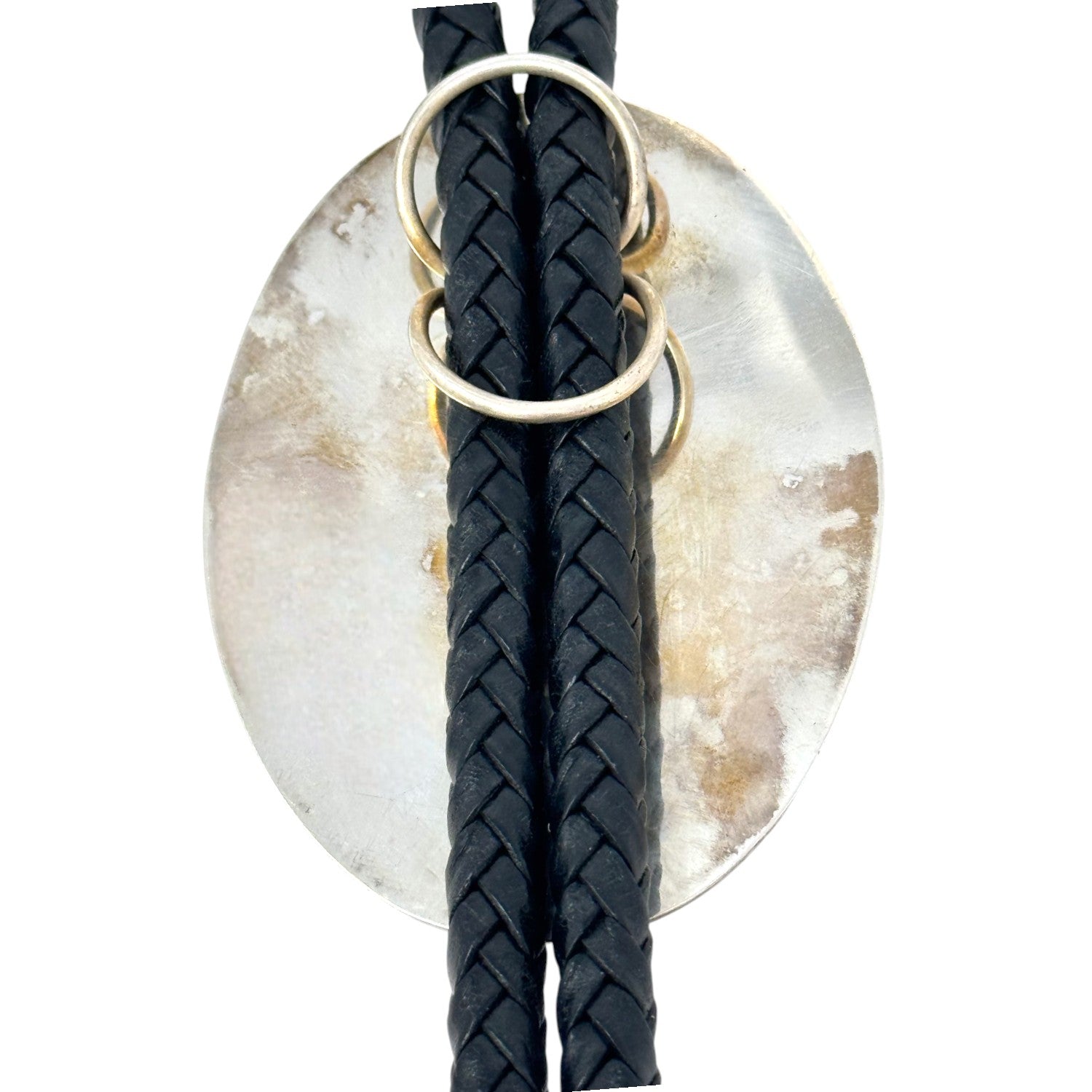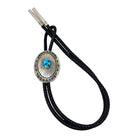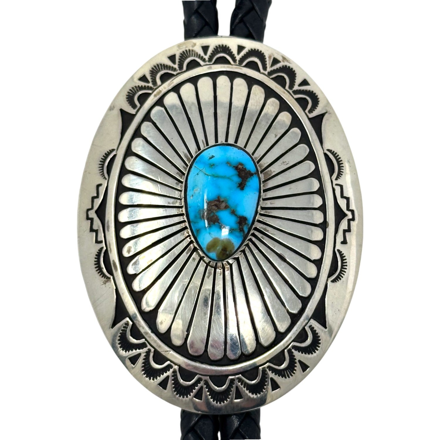 This Charlie John Navajo handmade bolo tie showcases the striking beauty of Water web Kingman Turquoise, framed in masterfully hand-stamped sterling silver. The pear-shaped turquoise cabochon displays a vivid blue hue with an intricate brown matrix, reminiscent of desert landscapes meeting the sky. Surrounding the stone, precise radiating stamp work creates a sunburst effect, symbolizing strength and vitality in traditional Navajo artistry. The outer edge features a bold pattern of deep stamp impressions, adding both depth and texture to the design. Handcrafted with precision, this bolo tie reflects Charlie John’s renowned skill in combining symmetry with cultural symbolism. The polished silver surface contrasts beautifully against the vibrant turquoise, creating a piece that is equally elegant and commanding.