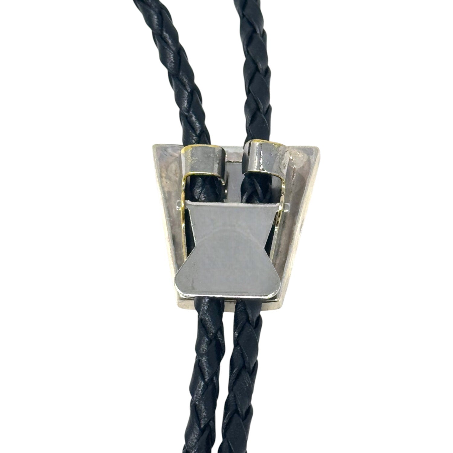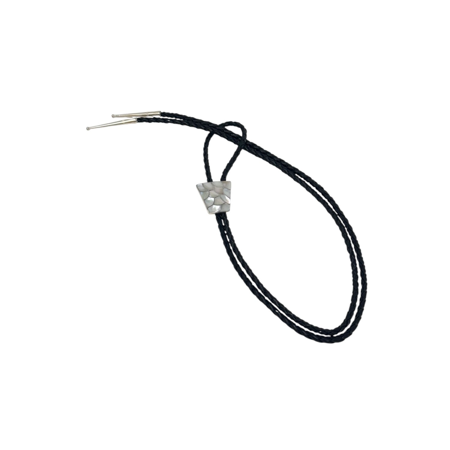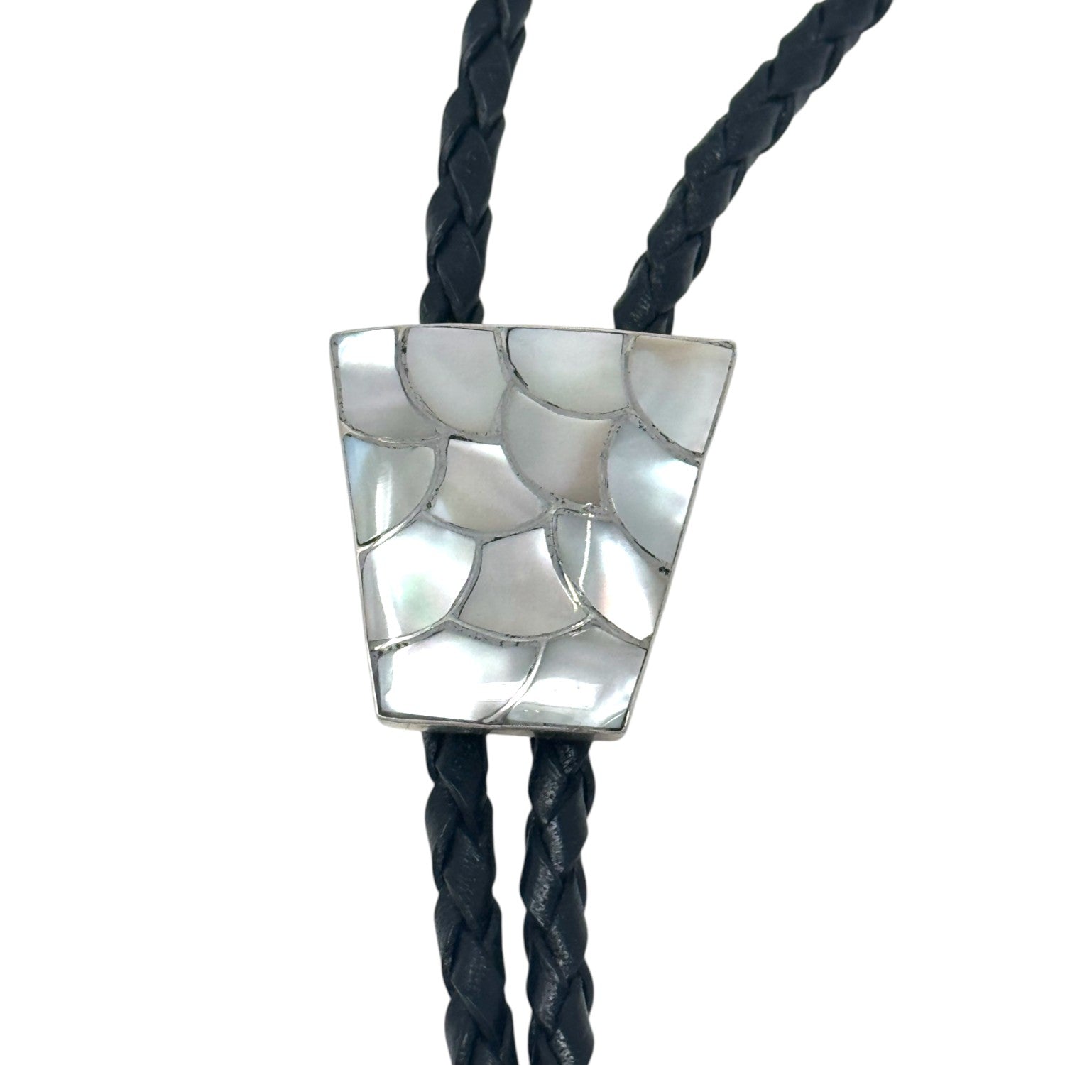 Crafted by Zuni artist Lynelle Johnson, this elegant bolo tie features shimmering Mother of Pearl inlaid in sterling silver with exceptional precision. The geometric fan-shaped slide is adorned with overlapping inlays, creating a fluid, scalloped pattern that captures and reflects light with every movement. Each shell piece is masterfully cut and fitted, showcasing the refined skill of traditional Zuni mosaic work. The sterling silver setting adds a radiant frame that enhances the iridescent luster of the shell. Finished with a supple black leather cord, this bolo tie offers a striking yet sophisticated accent to both formal and casual wear.
