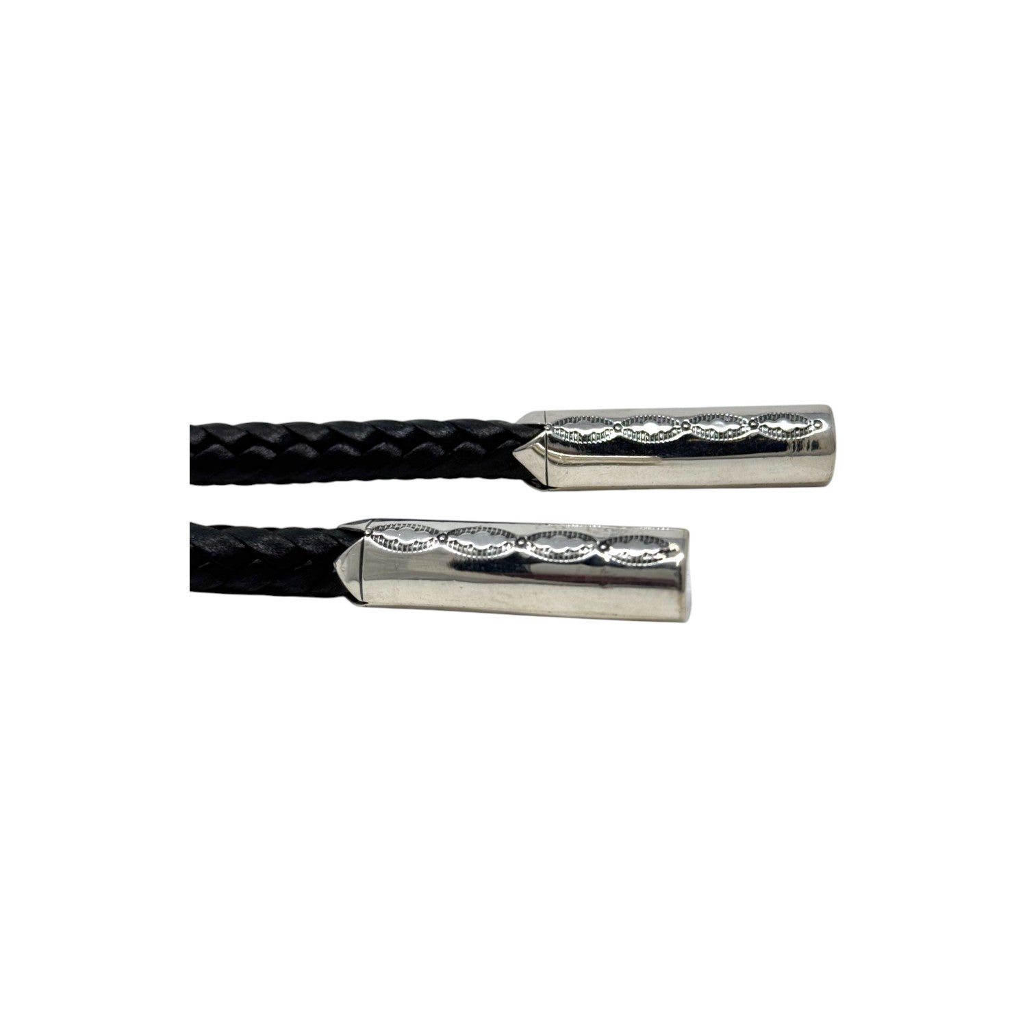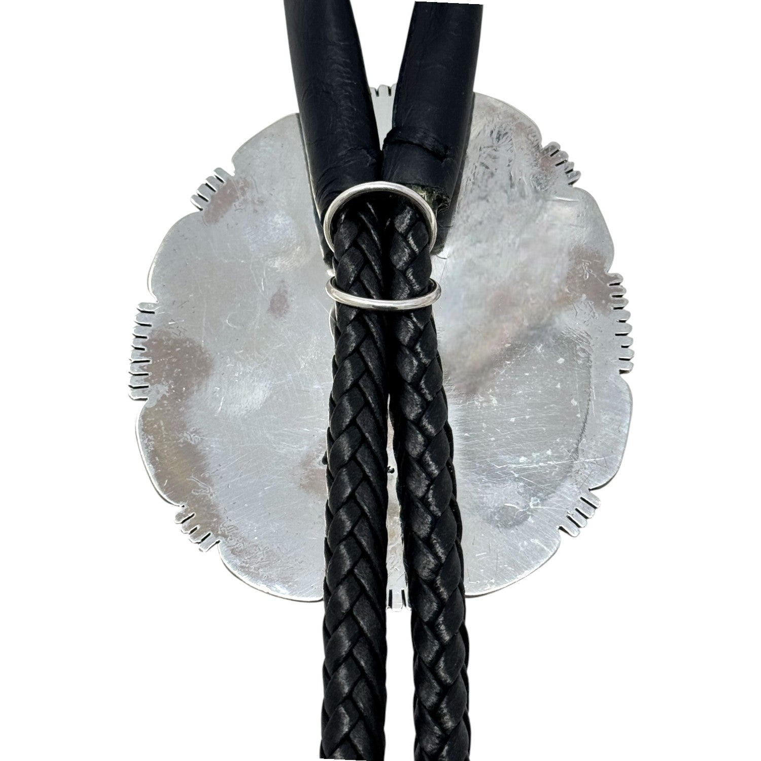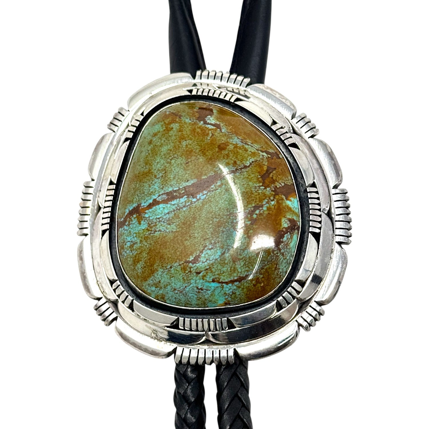This handsome bolo tie by Navajo silversmith Tom Lewis features a striking Pilot Mountain Turquoise stone set in sterling silver. The freeform cabochon displays earthy brown and golden tones accented with vivid turquoise blue veining, characteristic of this prized Nevada mine. Framed in a clean silver bezel, the stone is surrounded by an intricate border of layered, hand-stamped silverwork that adds texture and depth. The bold yet refined design highlights Lewis’s mastery of traditional Navajo silversmithing while allowing the natural beauty of the stone to take center stage. The warm, organic hues of the Pilot Mountain Turquoise make this piece versatile for both casual and formal wear. Perfect for collectors and enthusiasts of fine Native American jewelry, it is a statement accessory that embodies Southwestern elegance.