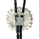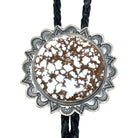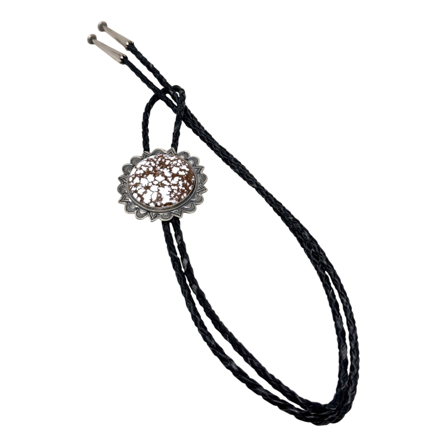 This distinctive bolo tie by Navajo silversmith Freddie Maloney features a striking Crazy Horse Turquoise stone set in sterling silver. The large round cabochon displays a captivating pattern of white and chocolate-brown matrix, reminiscent of natural stone mosaics. Surrounding the stone is an ornate silver setting, adorned with scalloped edges and traditional Navajo stamp work that adds depth and texture. Maloney’s craftsmanship shines in the careful balance between the bold natural stone and the intricate silver detailing. The oxidized accents highlight the hand-stamped designs, giving the piece a timeless Southwestern character. Perfect for collectors and those seeking a statement accessory, this bolo tie blends natural beauty with masterful artistry.