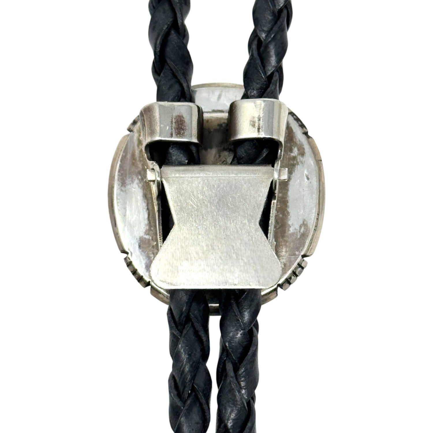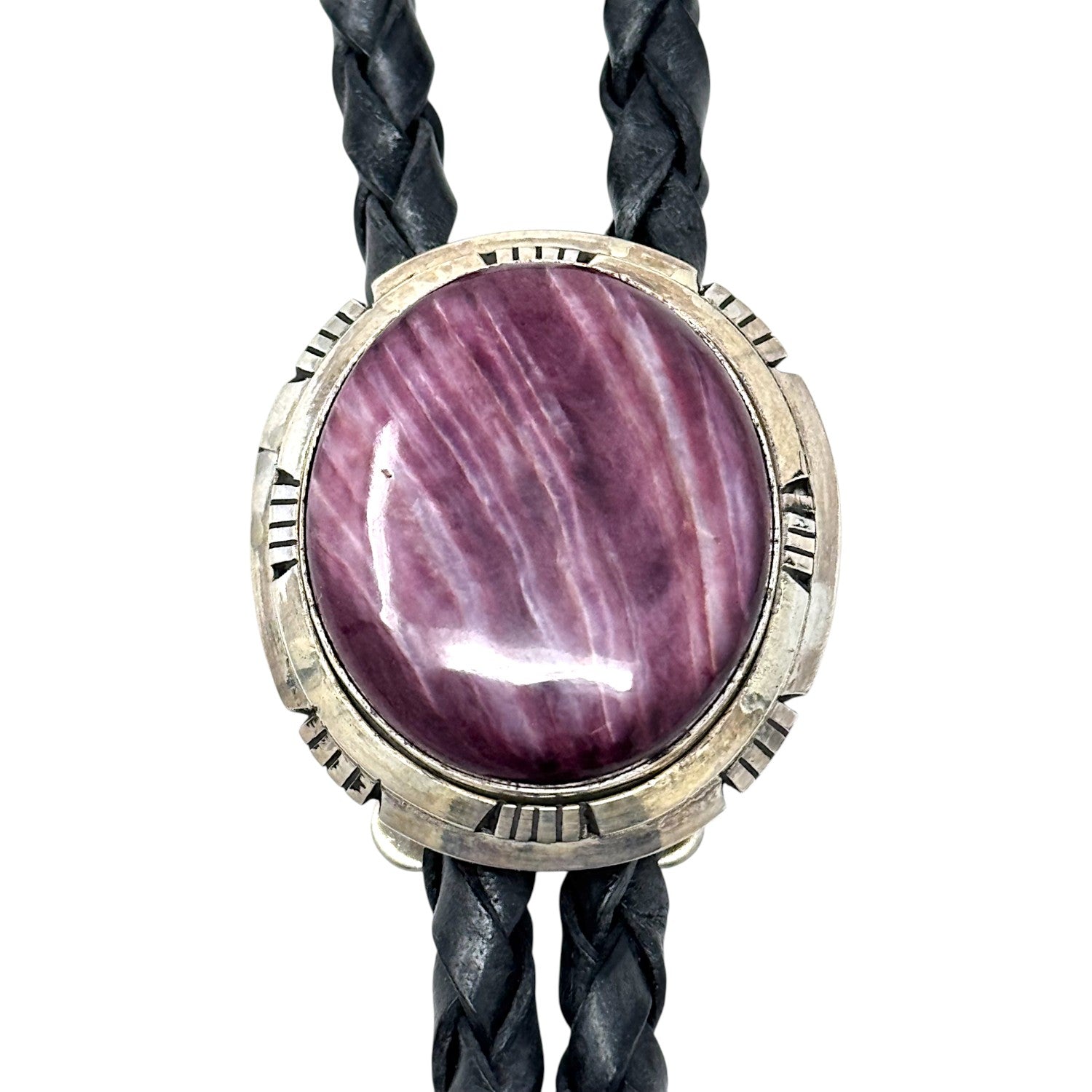 This elegant bolo tie by Navajo silversmith Scotty Skeets features a striking Purple Spiny Oyster Shell set in sterling silver. The large oval cabochon displays rich violet and lavender hues with natural striations, creating a captivating sense of depth and movement. The stone is framed in a sleek silver bezel accented with hand-stamped details, adding subtle texture and character. Skeets’ minimalist yet refined design allows the vibrant beauty of the shell to take center stage while honoring traditional Navajo craftsmanship. The polished silver finish provides a clean, timeless contrast to the bold coloration of the Spiny Oyster. Perfect for collectors and lovers of distinctive Southwestern jewelry, this bolo tie is both a statement piece and a wearable work of art.