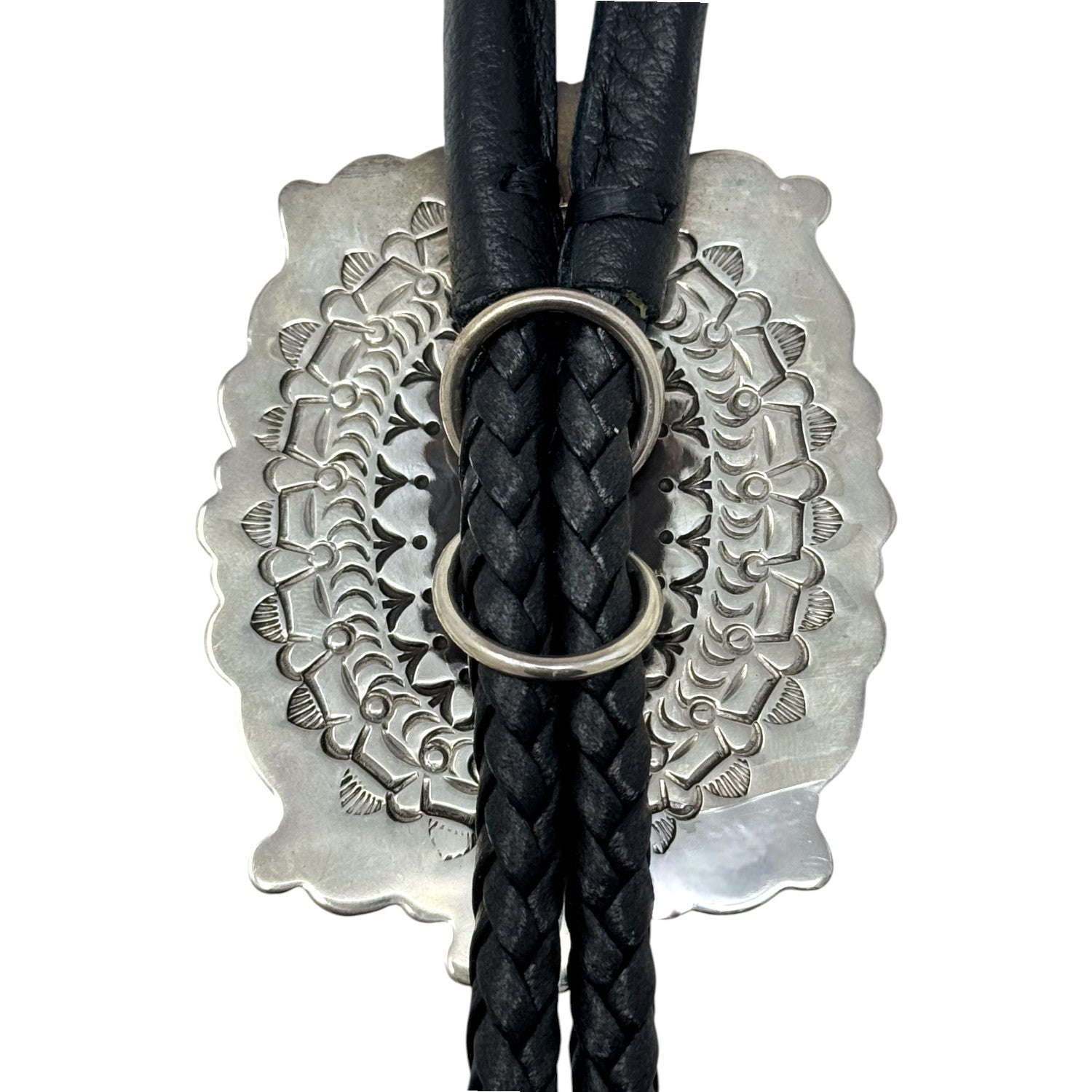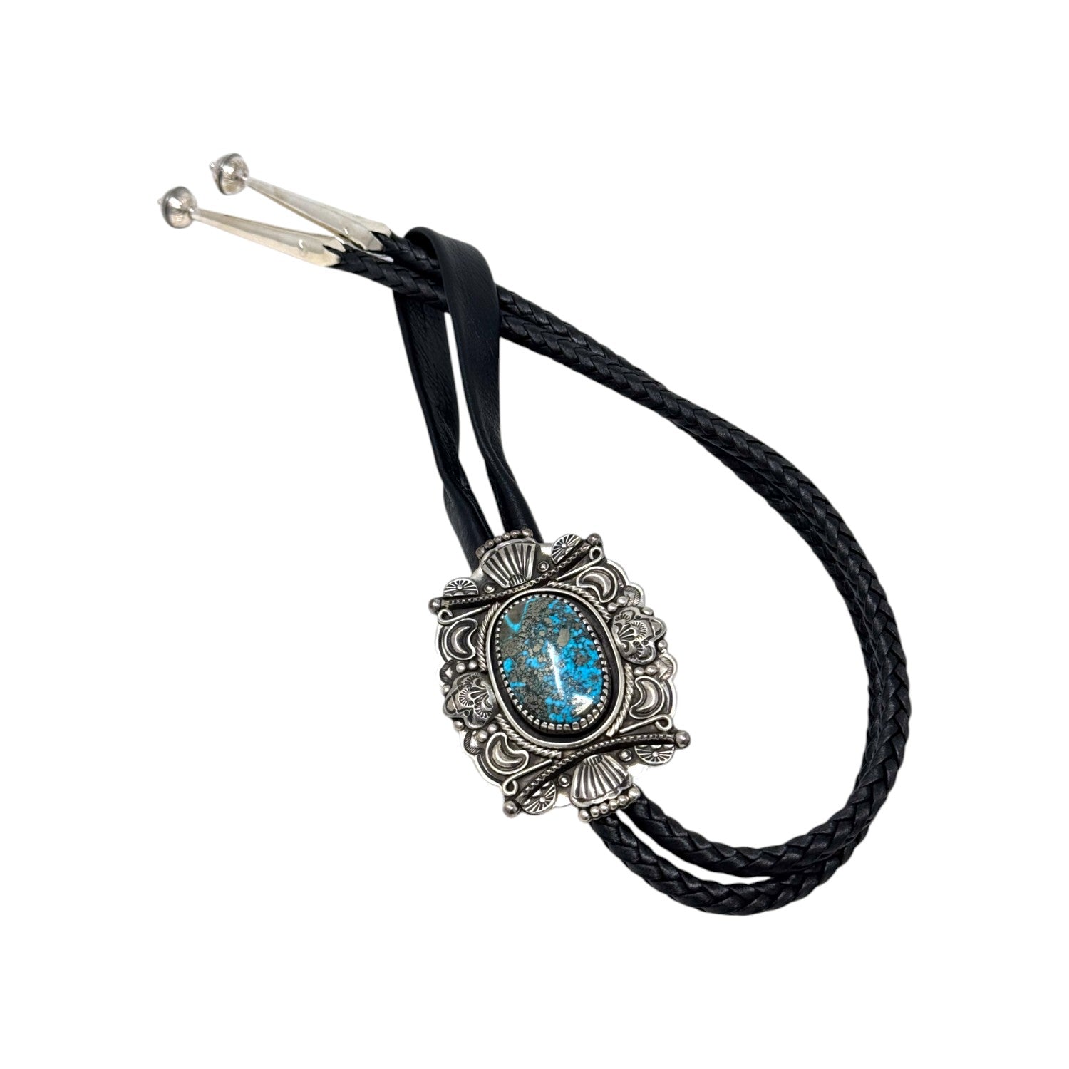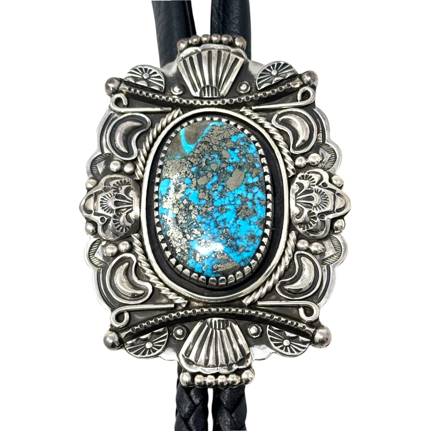This exquisite bolo tie by Navajo silversmith Bryon Tom features a captivating Persian Turquoise stone, prized for its vibrant blue tone interlaced with golden pyrite and subtle matrix patterns. The oval cabochon is framed in a finely crafted sterling silver bezel, accented with a twisted rope border for added depth. Surrounding the stone is an elaborate arrangement of hand-stamped shells, scrolls, and floral motifs, each detail masterfully formed to create a balanced, ornate design. The oxidized background enhances the silverwork, lending contrast and dimension to the piece. Bryon Tom’s craftsmanship reflects the rich Navajo tradition while presenting a timeless, heirloom-quality accessory. Set on a supple braided leather cord, this bolo tie blends elegance with the rugged beauty of the Southwest.