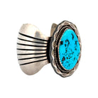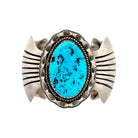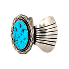 This vintage Navajo bracelet by Stan Slim, circa 1990s, is a remarkable showcase of traditional silversmithing and natural beauty. Handcrafted in sterling silver, the cuff features a large oval Lone Mountain Turquoise stone, prized for its vibrant blue color and distinctive matrix. The stone is framed in a bold, hand-stamped bezel with twisted rope and scalloped detailing, adding depth and texture to the design. Strong silverwork radiates outward with clean, linear stamp patterns along the cuff, highlighting the balance of strength and elegance. The weight and craftsmanship reflect Stan Slim’s signature style, blending classic Navajo tradition with striking presence. As a vintage piece, it carries both historical and cultural significance, representing decades of artistry.