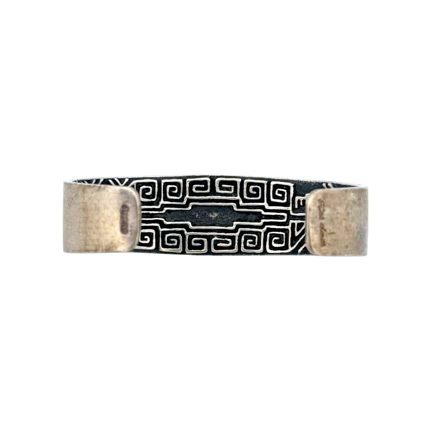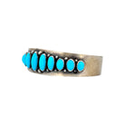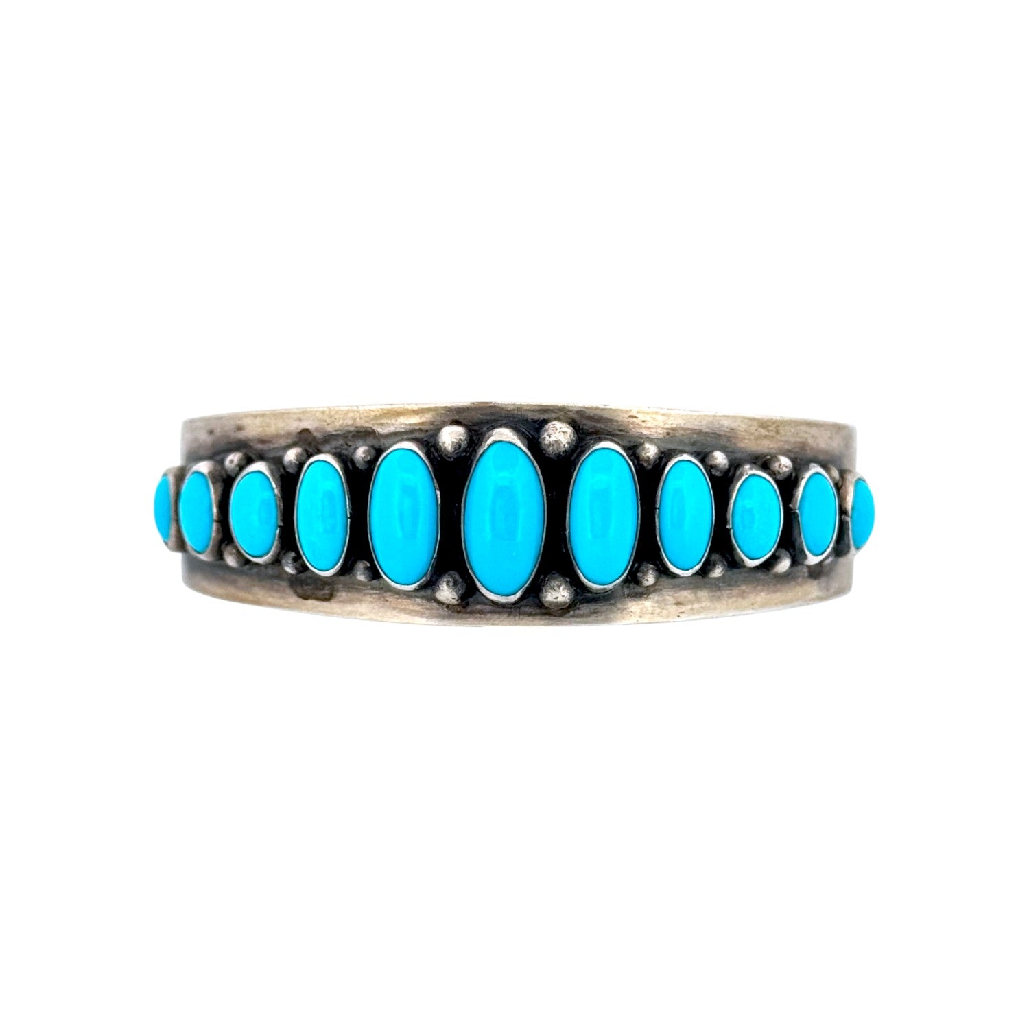 This vintage Navajo bracelet by Kirk Smith, circa 1990s, is a stunning showcase of Sleeping Beauty Turquoise set in sterling silver. The cuff features a row of perfectly matched oval turquoise cabochons, prized for their vibrant sky-blue color and lack of heavy matrix. Each stone is set in smooth bezels, accented by silver drops that add rhythm and texture to the design. The wide silver band is slightly oxidized, giving depth and contrast that highlights the brilliance of the turquoise. Known for his bold and refined craftsmanship, Kirk Smith created pieces that balanced traditional Navajo techniques with a modern sense of elegance. The clean lines and striking color make this bracelet both versatile and timeless.