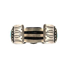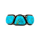 This Navajo bracelet by Calvin Martinez is a powerful example of traditional silversmithing paired with the beauty of Water web Kingman Turquoise. The cuff features three large turquoise cabochons, each with striking blue tones highlighted by intricate web-like matrix patterns unique to this variety of Kingman stone. The stones are set in bold bezels with fine silver beading along the edges, adding detail and contrast. The heavy sterling silver cuff showcases Martinez’s hallmark style; strong, balanced, and deeply rooted in Navajo tradition. The symmetry of the three-stone design gives it a timeless appeal, while the bold turquoise ensures it stands out as a statement piece. Substantial in weight and craftsmanship, it reflects both durability and elegance.