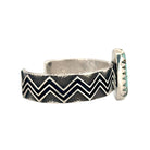 This striking bracelet by Philander and Shanibah Begay exemplifies the bold creativity and masterful craftsmanship of Navajo handmade jewelry. The piece features a beautifully set Pilot Mountain turquoise stone, showcasing a vivid blue hue with intricate brown matrix patterns that add natural depth and character. The sterling silver cuff is adorned with deeply stamped zigzag designs, symbolizing lightning or water, both powerful motifs in Navajo culture. The oxidized background enhances the contrast, giving the bracelet a strong, dimensional appearance. The turquoise stone, framed in a sharp sawtooth bezel, provides a stunning focal point against the textured silver band. Balanced and contemporary, yet deeply rooted in tradition, this bracelet reflects Begay’s refined artistry and cultural storytelling.
