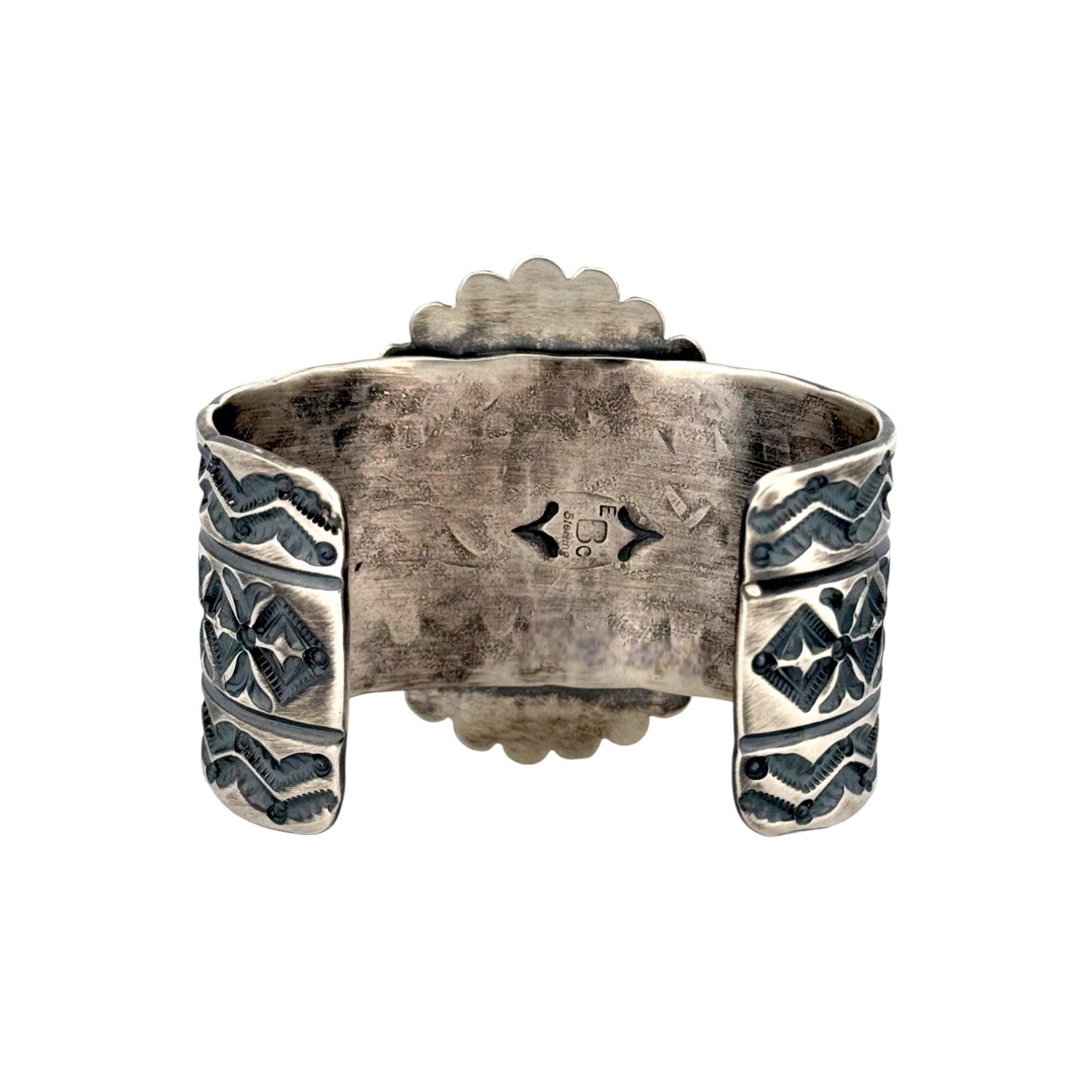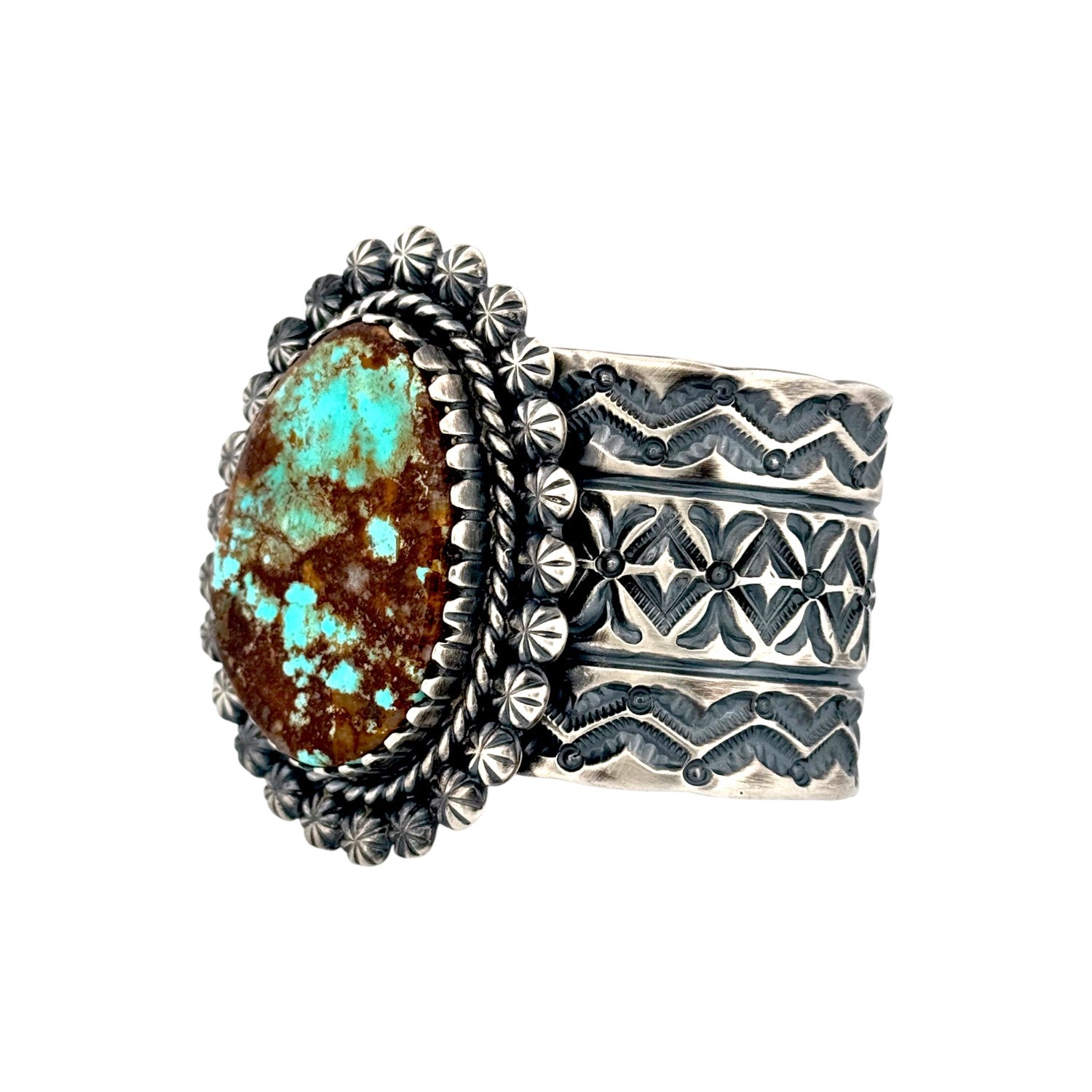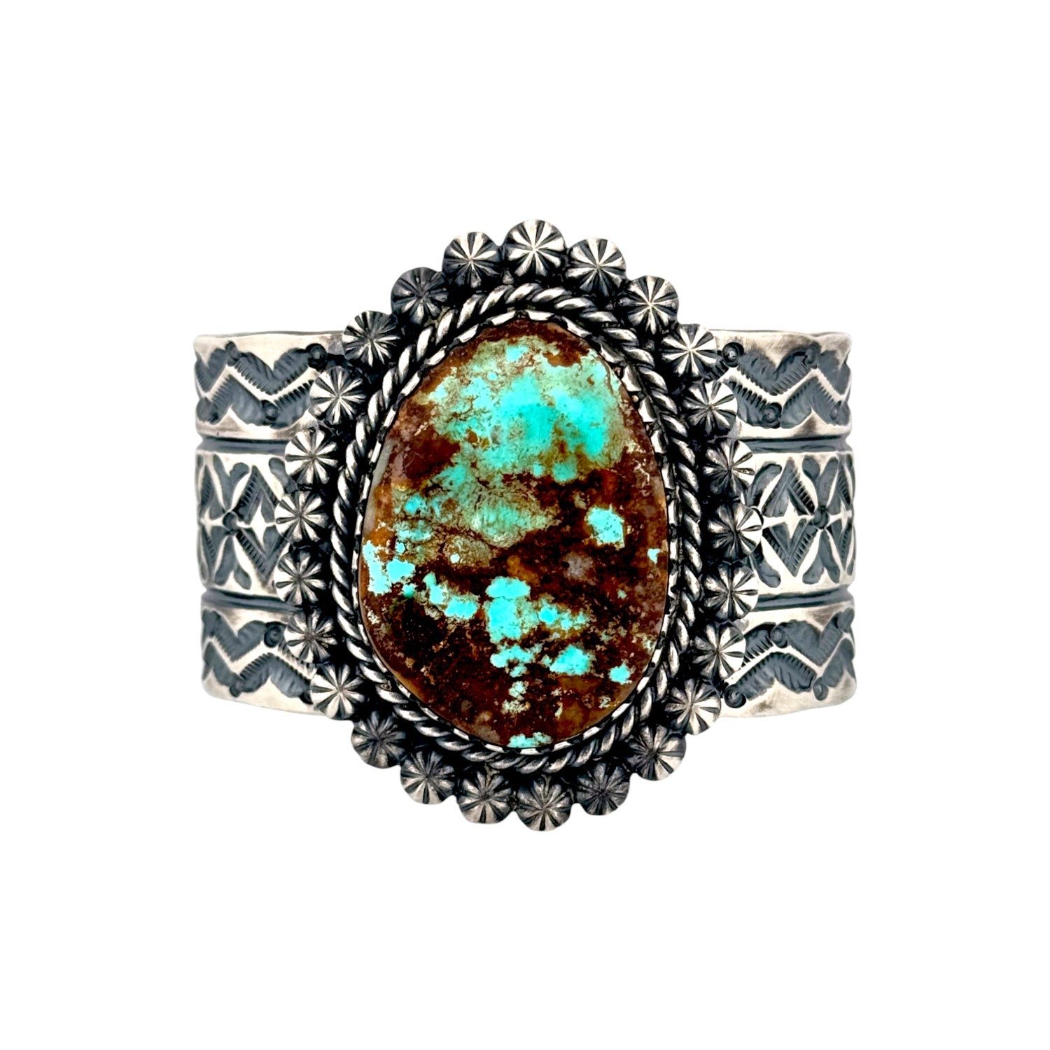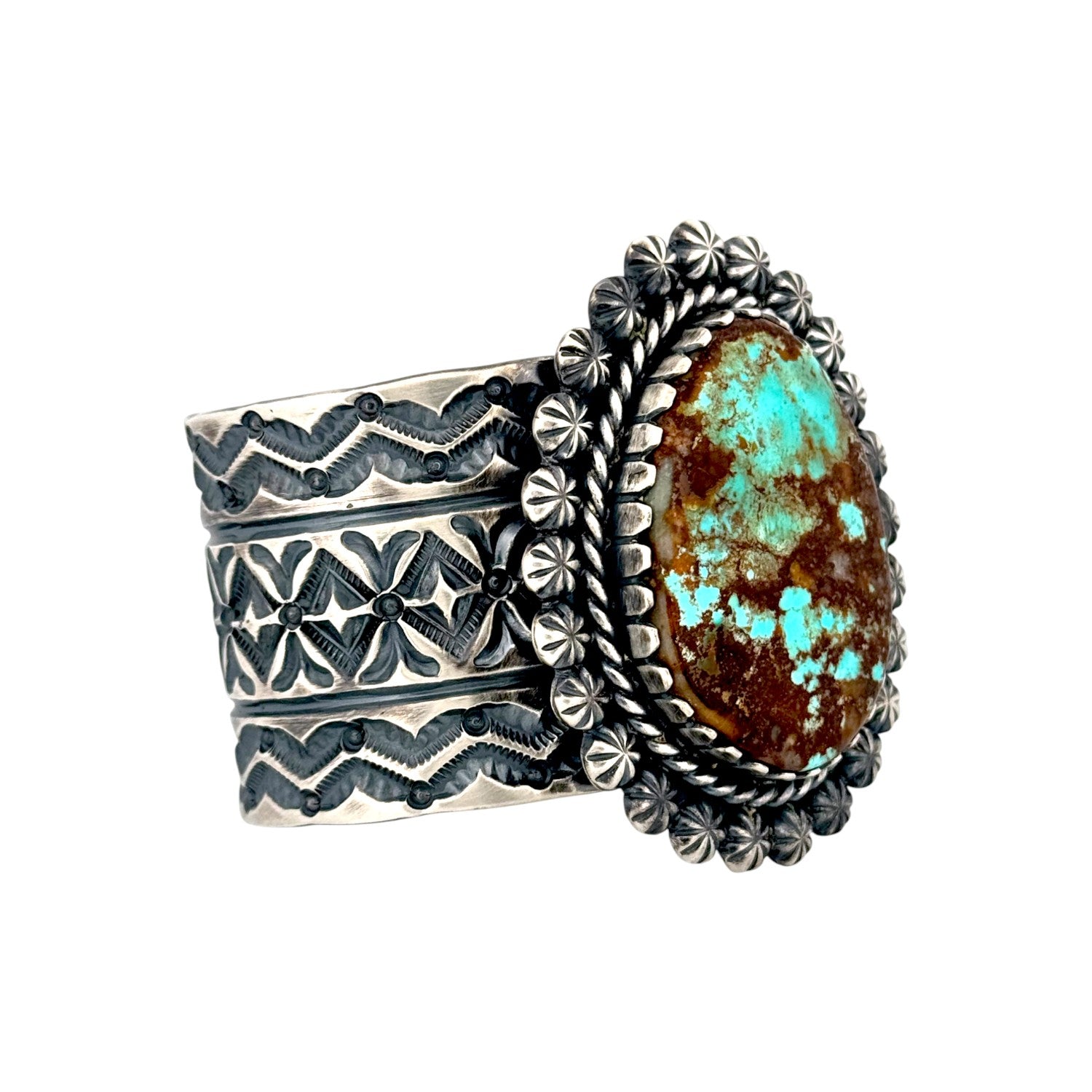 This sterling silver bracelet by El Roy Chavez is a bold expression of Navajo handmade craftsmanship. The centerpiece features a large Royston Turquoise stone, showcasing a striking blend of earthy browns and vivid blues unique to this celebrated mine. Surrounding the stone is a frame of intricately stamped silver rosettes and twisted rope detailing, adding depth and character to the design. The wide cuff is adorned with hand-stamped patterns, including chevrons and crosses, which enhance its traditional Navajo style. The oxidized background contrasts beautifully with the polished silver, highlighting each detail with clarity. Substantial in weight and presence, this bracelet is both a statement piece and a work of wearable art.