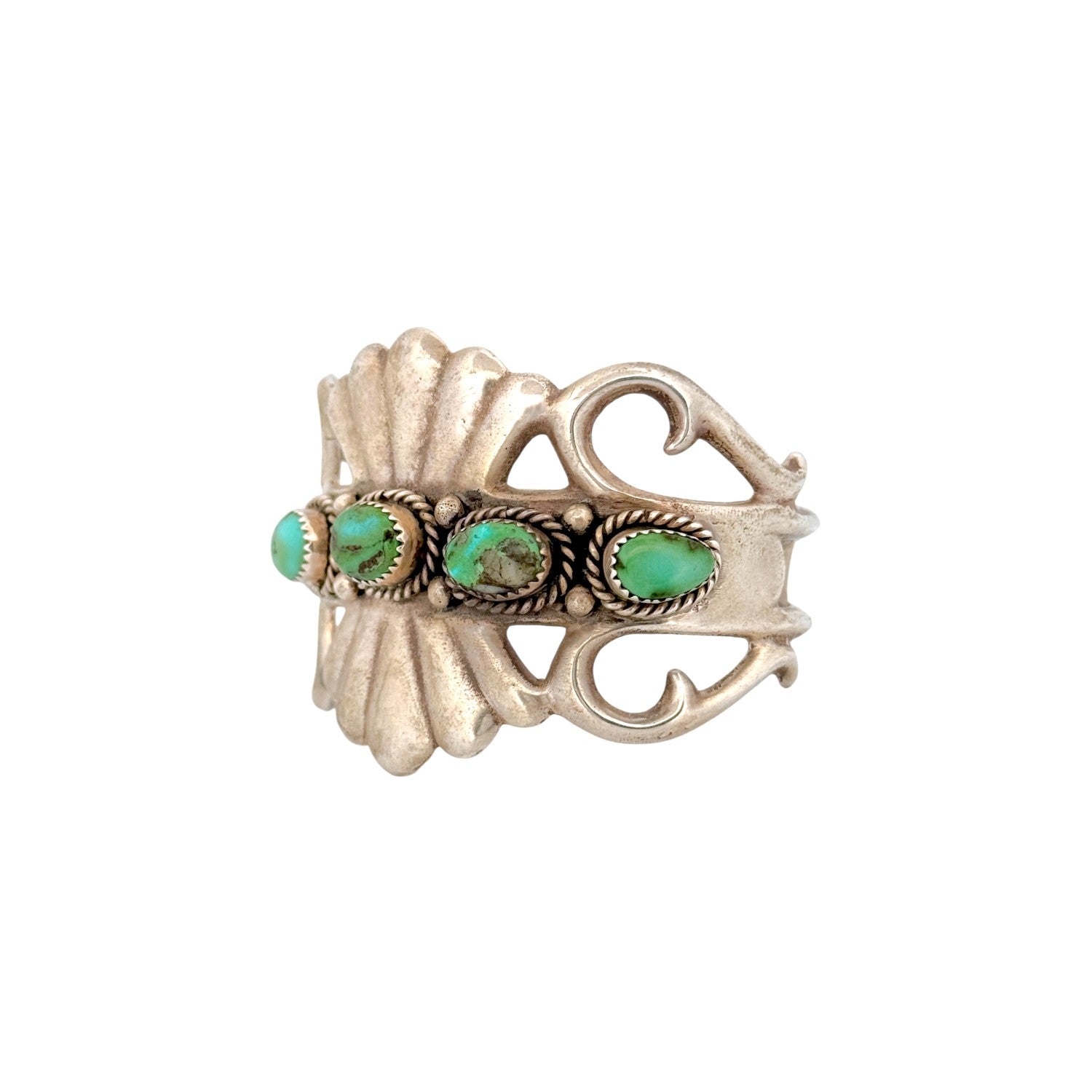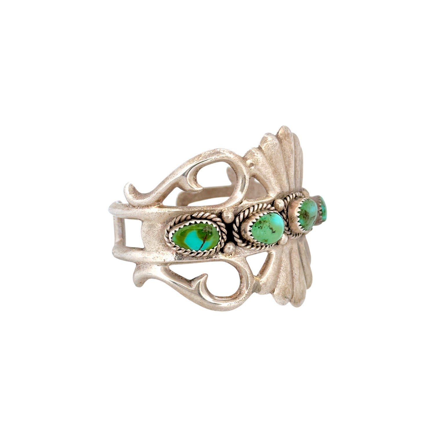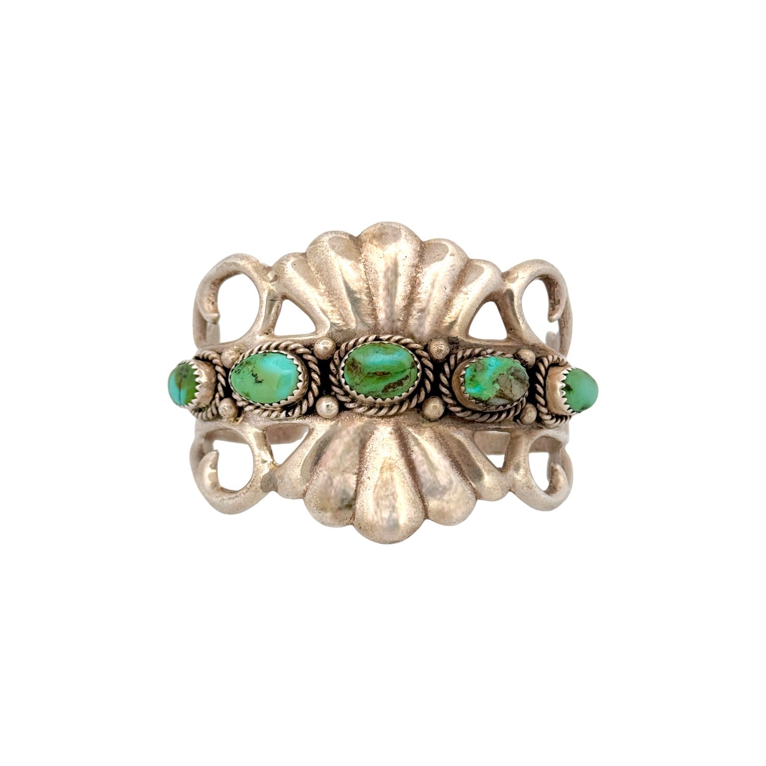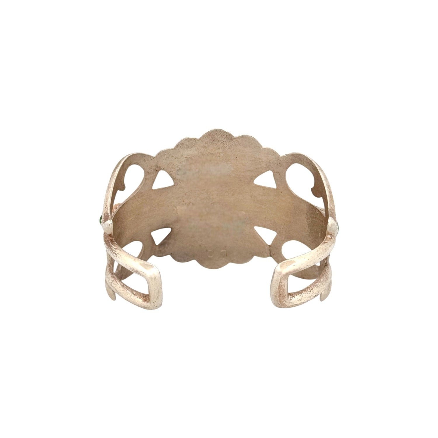 This Navajo handmade bracelet by Lorraine Chee showcases a beautiful row of Sonoran Turquoise stones set in sterling silver. The vibrant green tones and natural matrix of the turquoise create a lively focal point that stands out against the sculpted silverwork. Ornate fan-like and scroll designs frame the stones, demonstrating Chee’s refined craftsmanship and eye for balanced composition. Twisted wire bezels and silver bead accents add classic Navajo detailing to the piece. Bold yet elegant, this bracelet is a standout example of Lorraine Chee’s artistry and the natural beauty of Sonoran Turquoise.