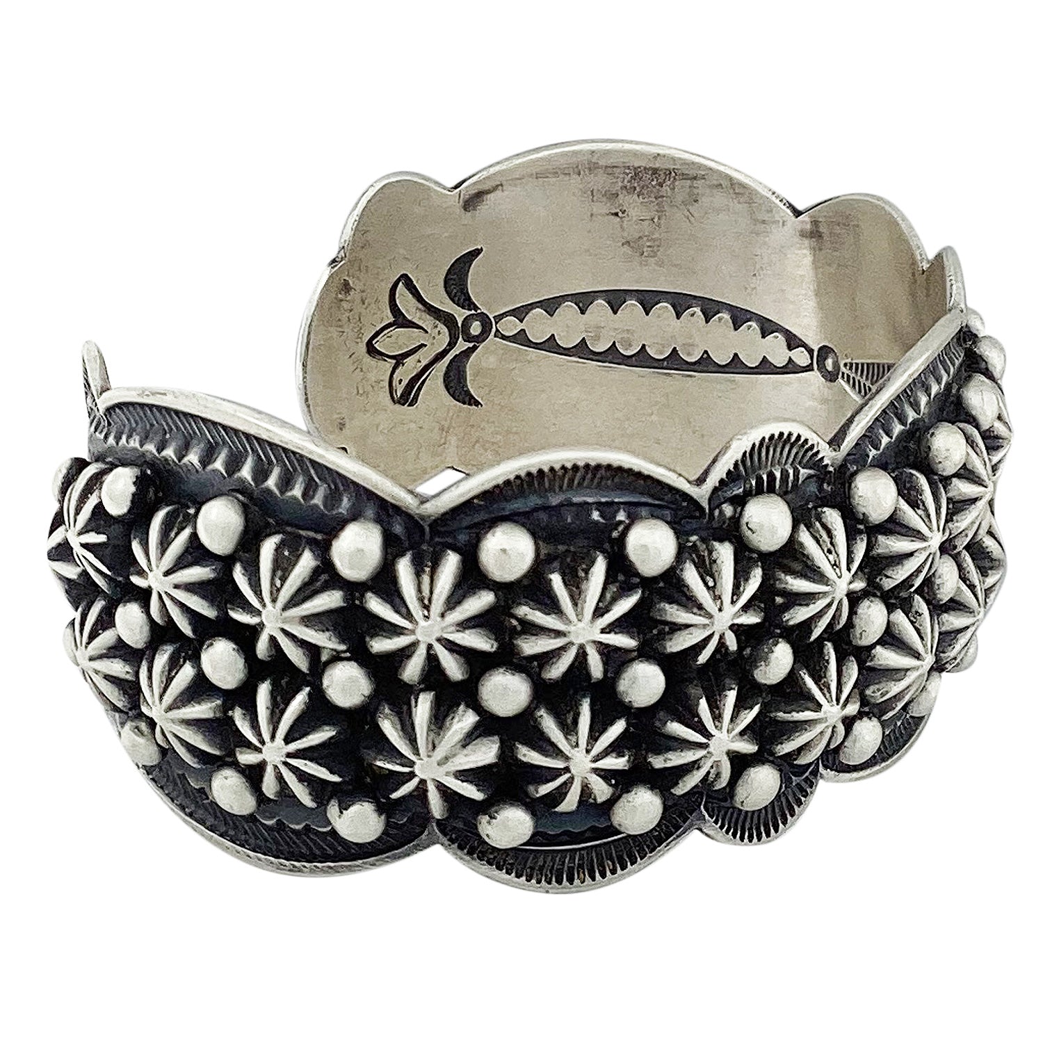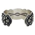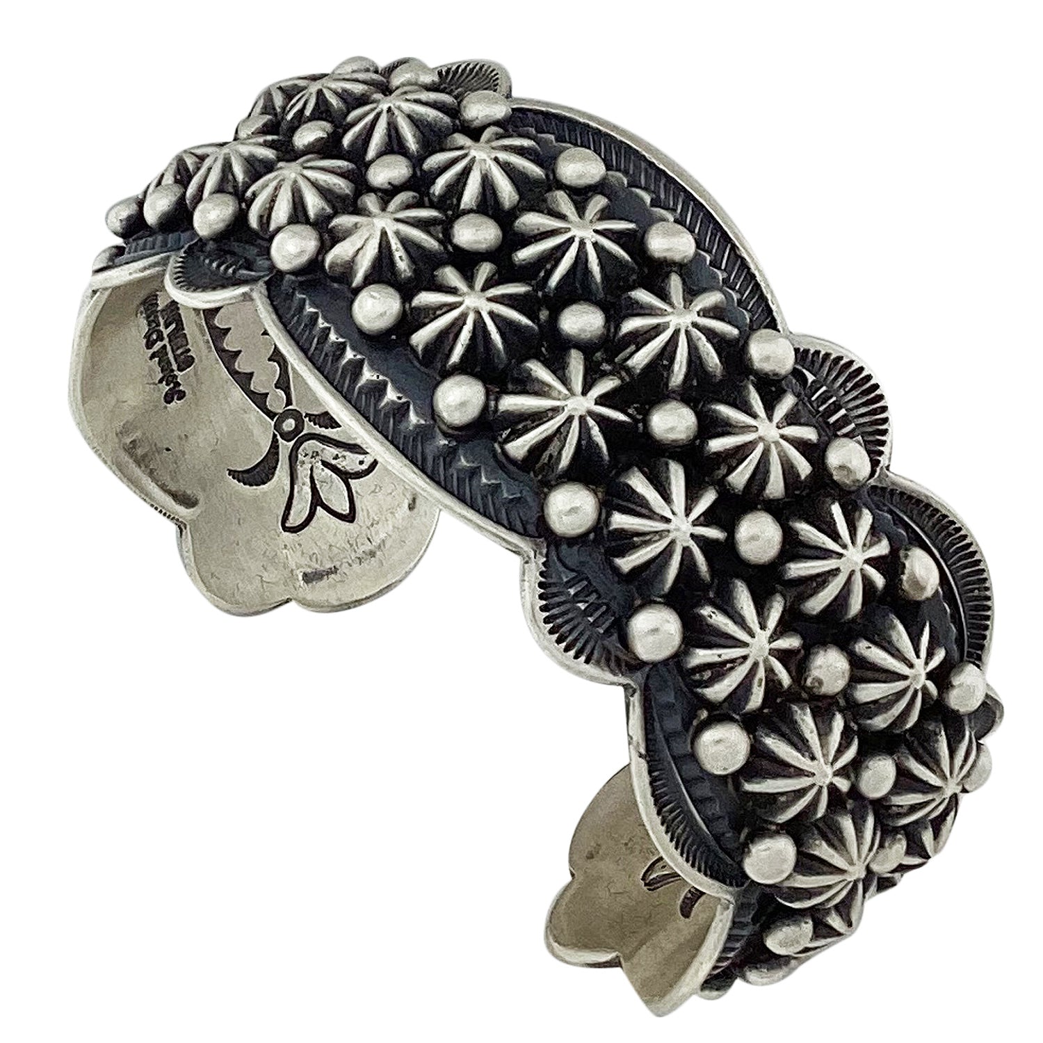 Navajo silversmith Roland Dixon makes lots of great pieces of handmade silver. We have seen this talented silversmith bring the Trading Post huge concho belts and smaller creations like this bracelet. This bracelet begins as a stamped cuff that has been filled with two rows of his gorgeous silver buttons. He frames the wide two rows of buttons with a heavy stamped scalloped edge. The design immediately captures your eye. Roland finishes the silver with that popular rustic brushed finish, making this something you will have on your wrist often. Check out the online Trading Post for more of his impressive work.