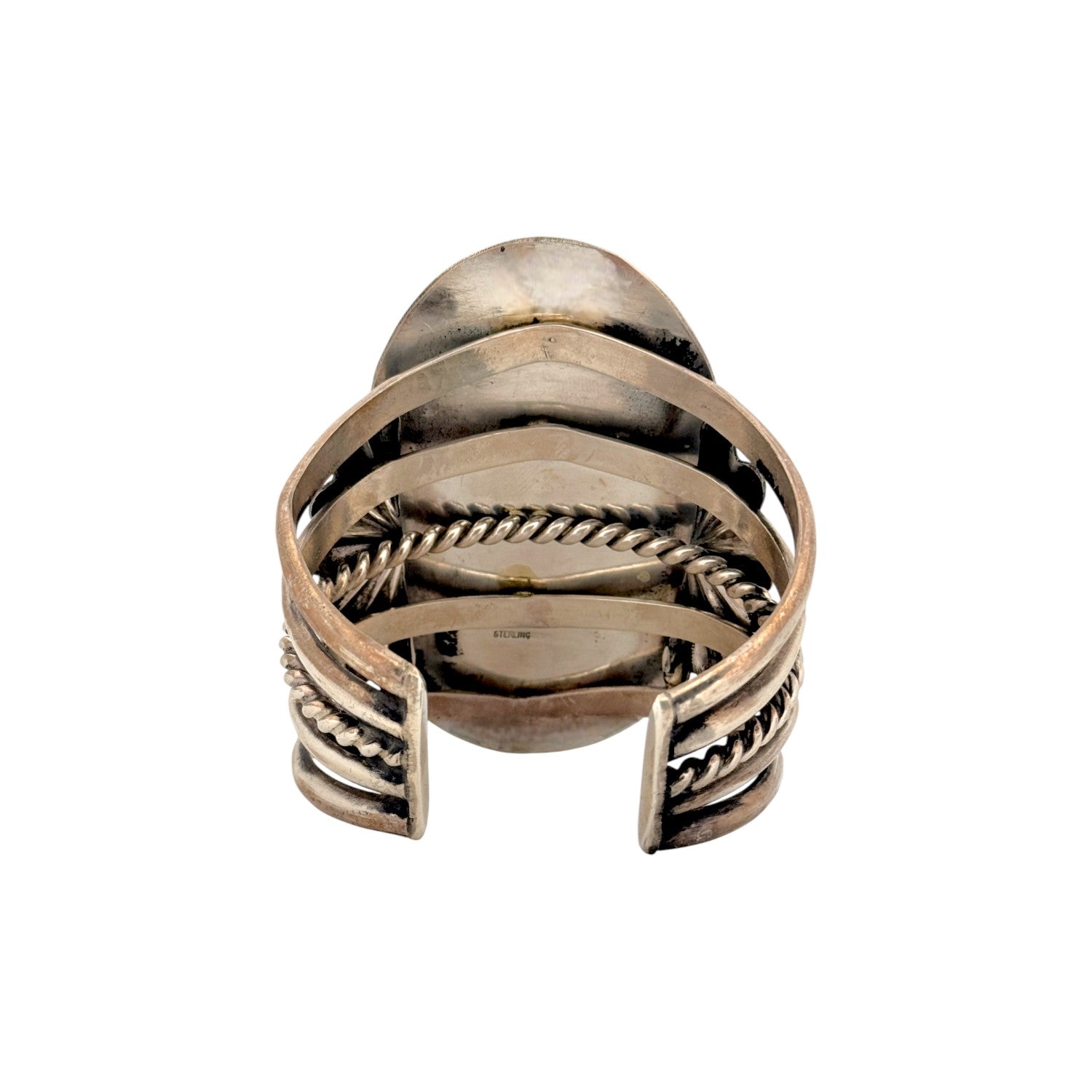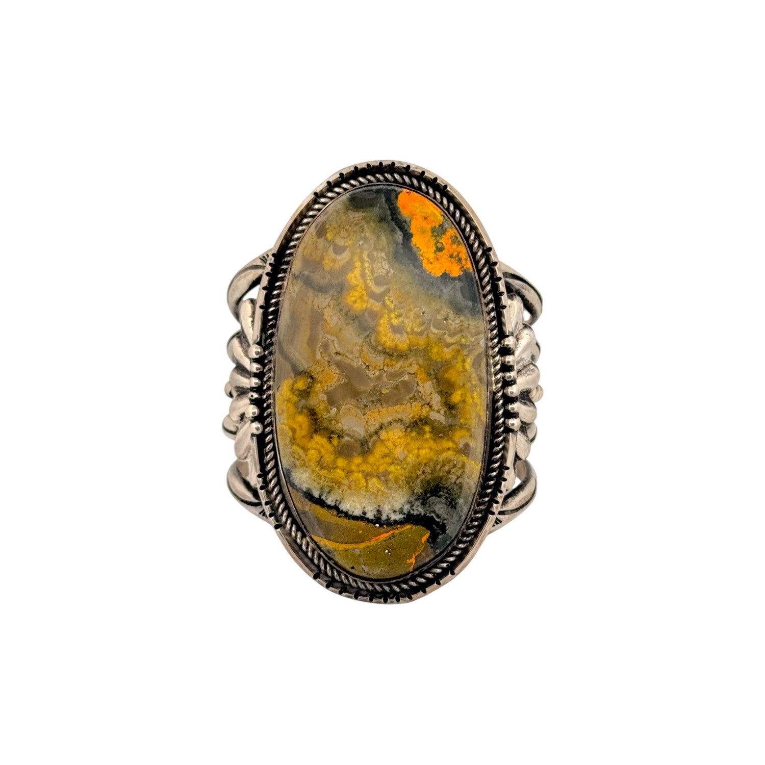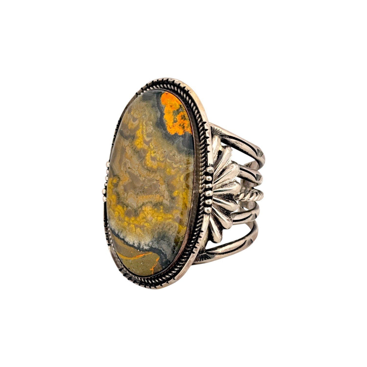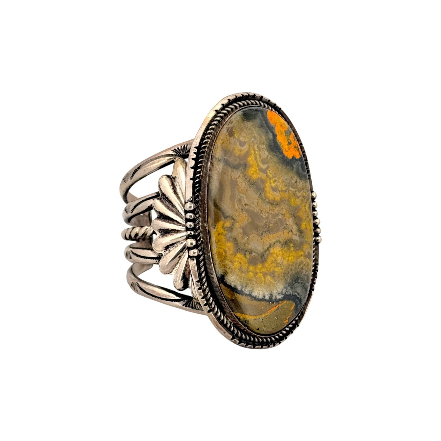 This Navajo handmade bracelet by Joelias Draper features a striking bumblebee jasper stone with vivid yellow, gray, and black natural patterning. Set in solid sterling silver, the bold oval cabochon is framed by detailed silverwork that highlights the stone’s dramatic character. The unique color variations of the jasper create an earthy, one-of-a-kind focal point. Handcrafted with strength and balance, the bracelet reflects traditional Navajo artistry and contemporary stone selection. A standout piece, it’s perfect for collectors or anyone drawn to distinctive Native American silver and gemstone jewelry.