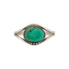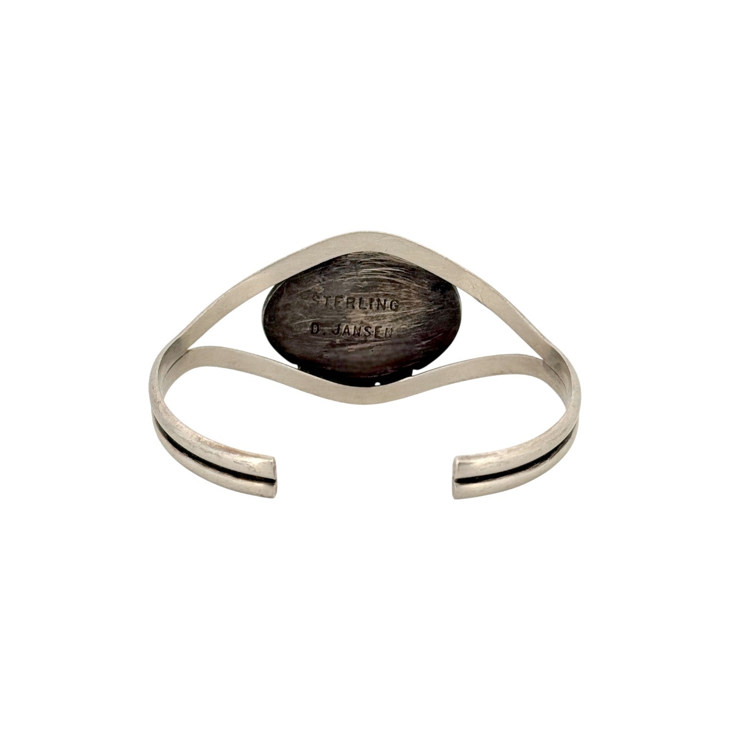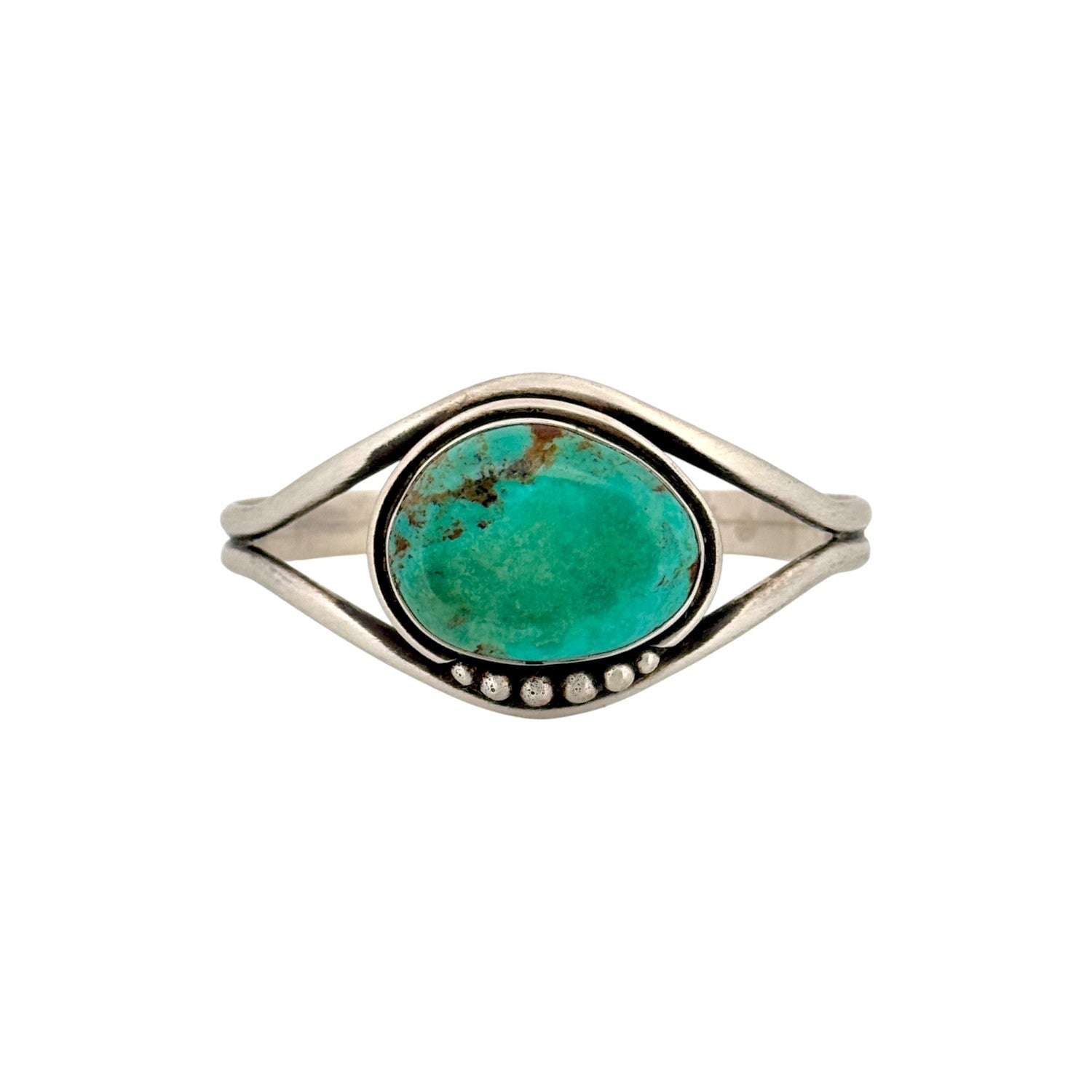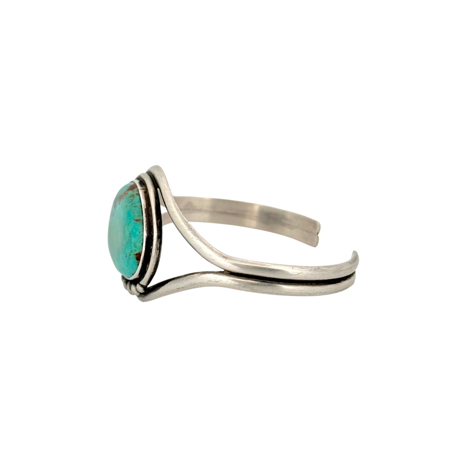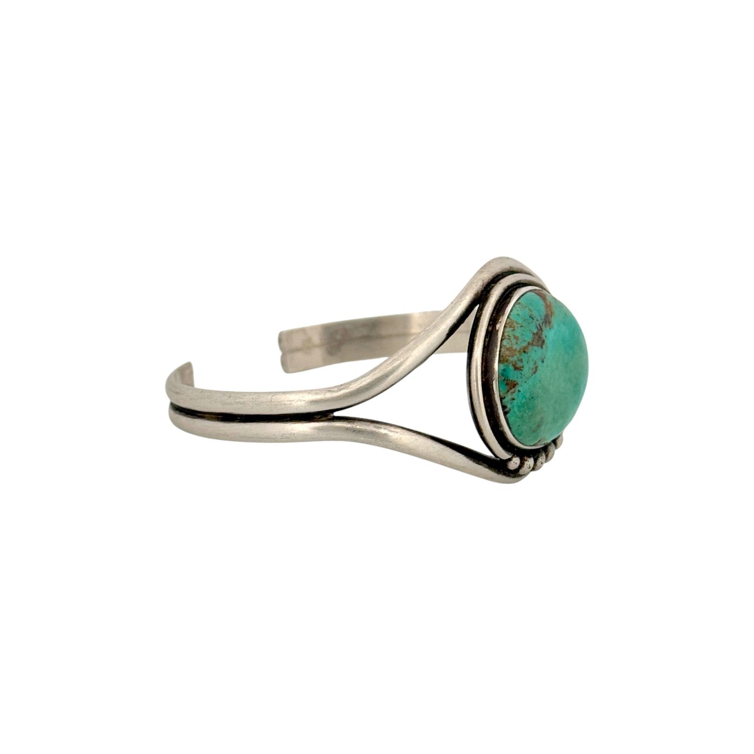 This vintage, circa 2000s Navajo bracelet stamped with the D. Jansen hallmark features a beautiful Royston turquoise stone set in sterling silver. The stone’s soft green and blue tones, accented with natural brown matrix, create a warm and earthy focal point. A flowing split-shank design frames the stone gracefully, emphasizing its organic shape. Delicate silver drop accents beneath the bezel add subtle texture and traditional Navajo detail. Elegant, artistic, and expertly crafted, this bracelet is a timeless example of Southwestern jewelry.