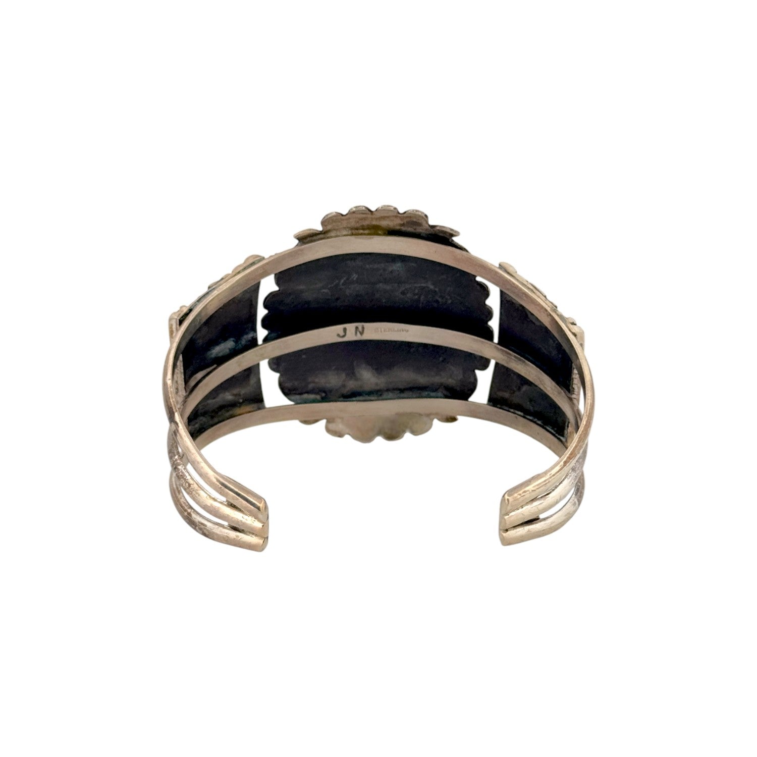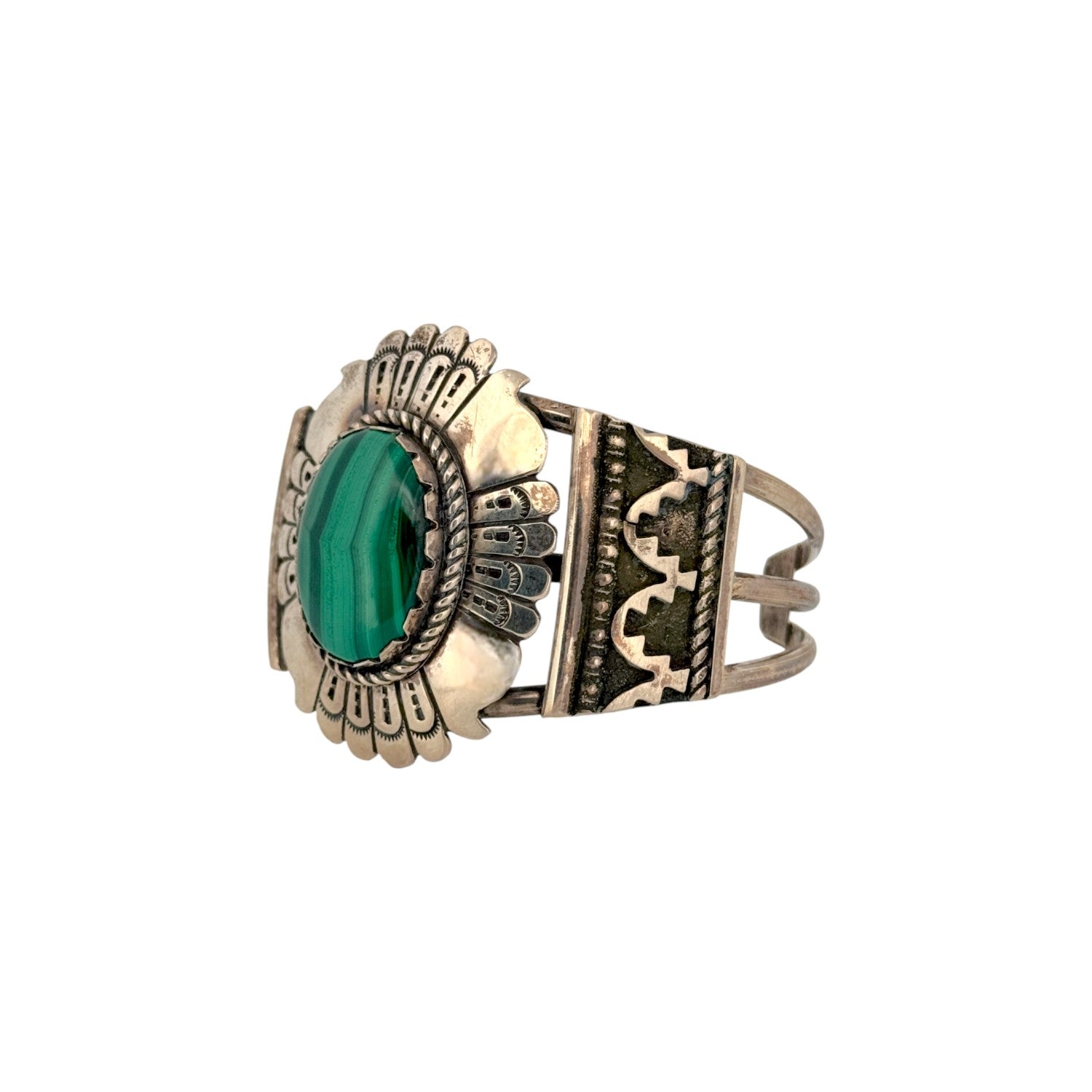 This vintage Navajo handmade bracelet bearing the JN hallmark features a striking malachite stone with rich green banding. Set in solid sterling silver, the oval cabochon is framed by bold, traditional silverwork and detailed hand stamping. The natural patterns of the malachite create depth and movement, making the stone a captivating focal point. The wide cuff design reflects classic Navajo craftsmanship and strong, balanced construction. A distinctive vintage piece, this bracelet is ideal for collectors and lovers of authentic Native American silver and gemstone jewelry.