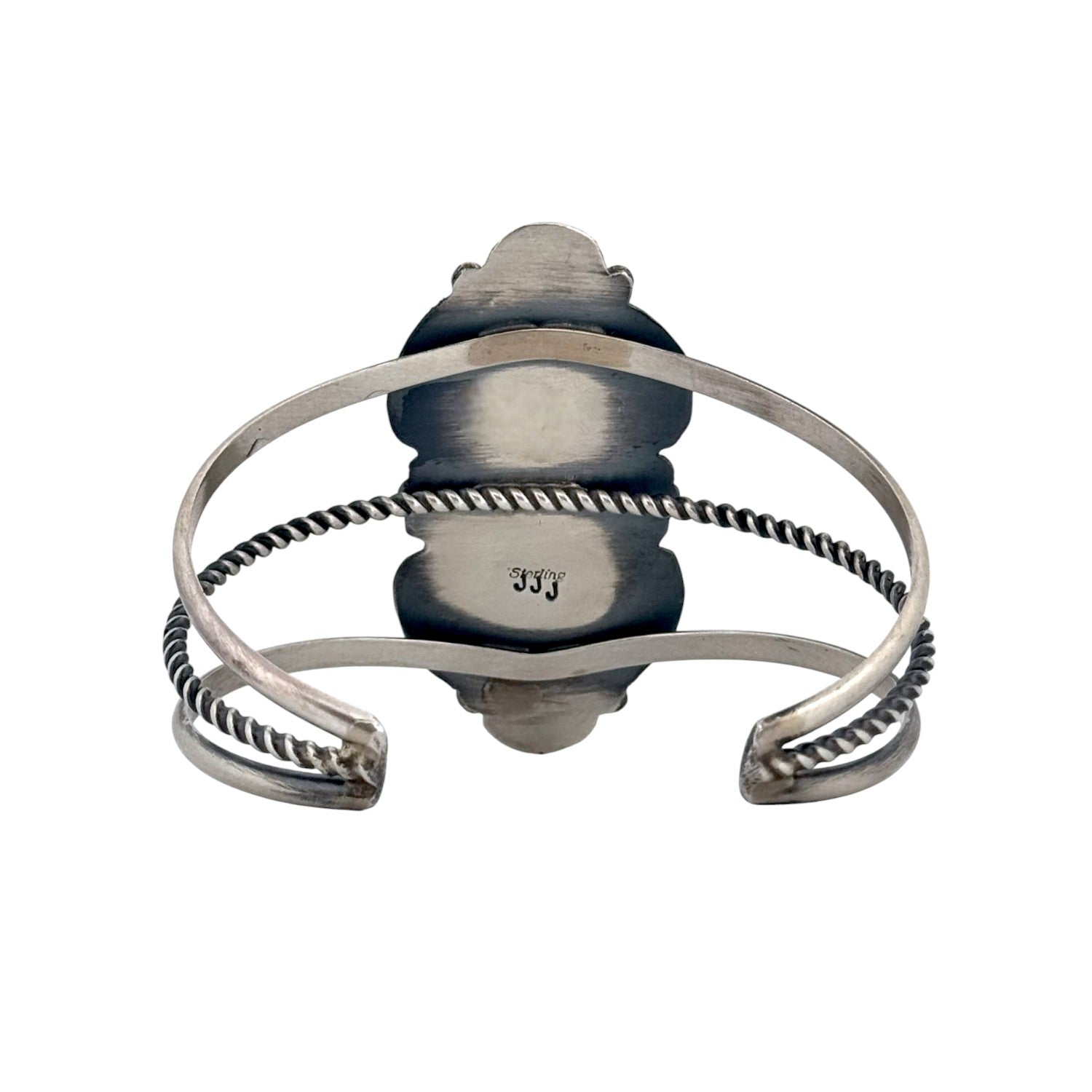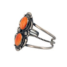 This vibrant Navajo handmade bracelet by Jeff James Jr features two radiant Orange Spiny Oyster Shell cabochons, glowing with warm desert tones of orange and coral. Each stone is beautifully framed in sterling silver with traditional Navajo stamp work, rope detailing, and silver bead accents. The split-shank design adds balance and comfort, allowing the artistry to shine while maintaining a lightweight fit. The oxidized background enhances the contrast, emphasizing the depth and texture of the handcrafted silverwork.