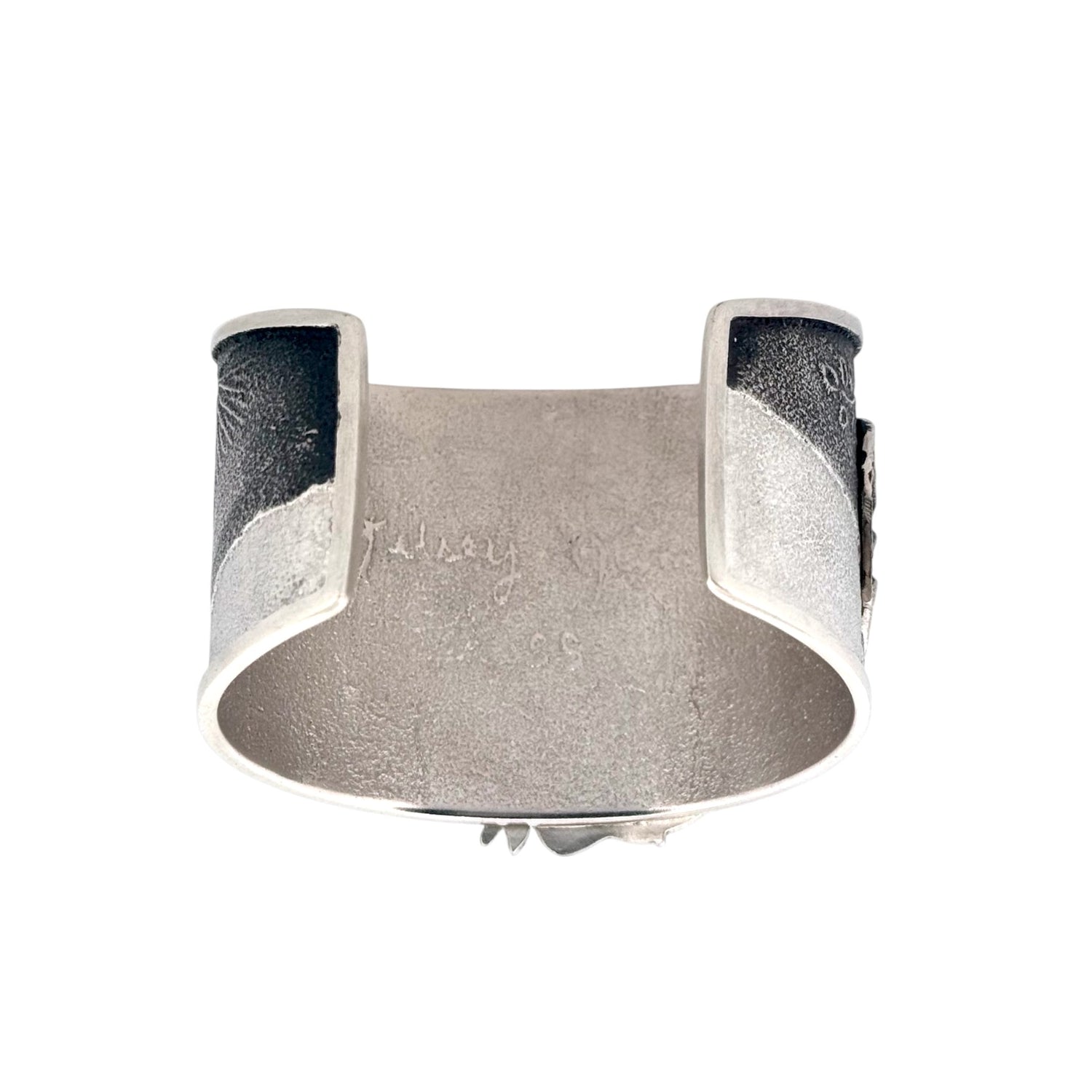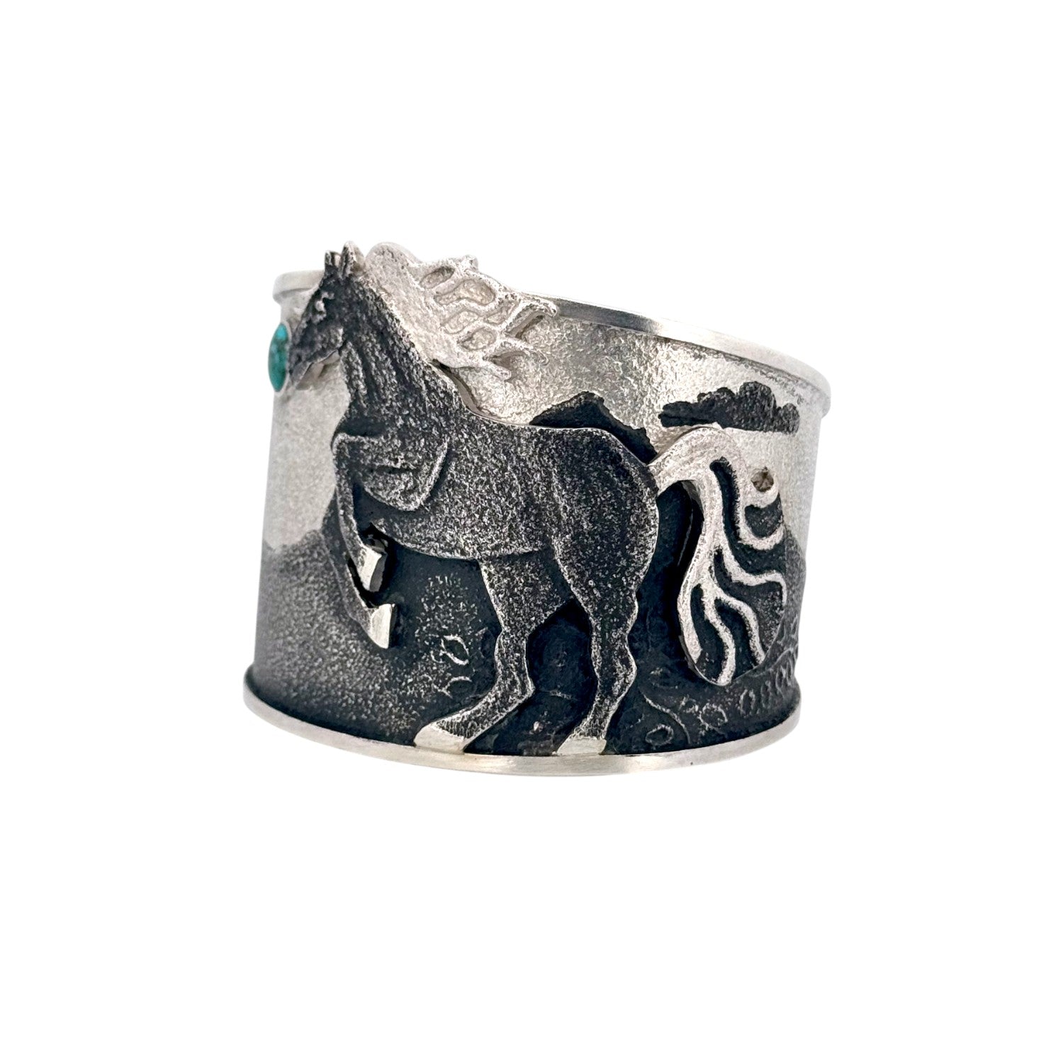 This powerful Navajo handmade bracelet by Kelsey Jimmie captures the untamed spirit of the Southwest through exquisite design and craftsmanship. A detailed galloping horse motif runs across the bracelet, symbolizing freedom, strength, and harmony with nature. Set against a textured sterling silver background, the design creates a striking contrast between light and shadow. A single round Kingman Turquoise stone adds a vibrant pop of blue, representing the open skies and sacred land of Navajo Country.