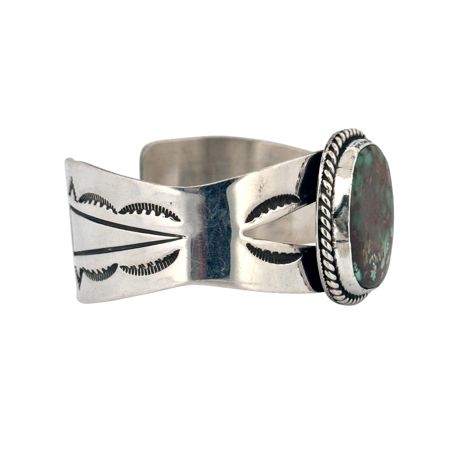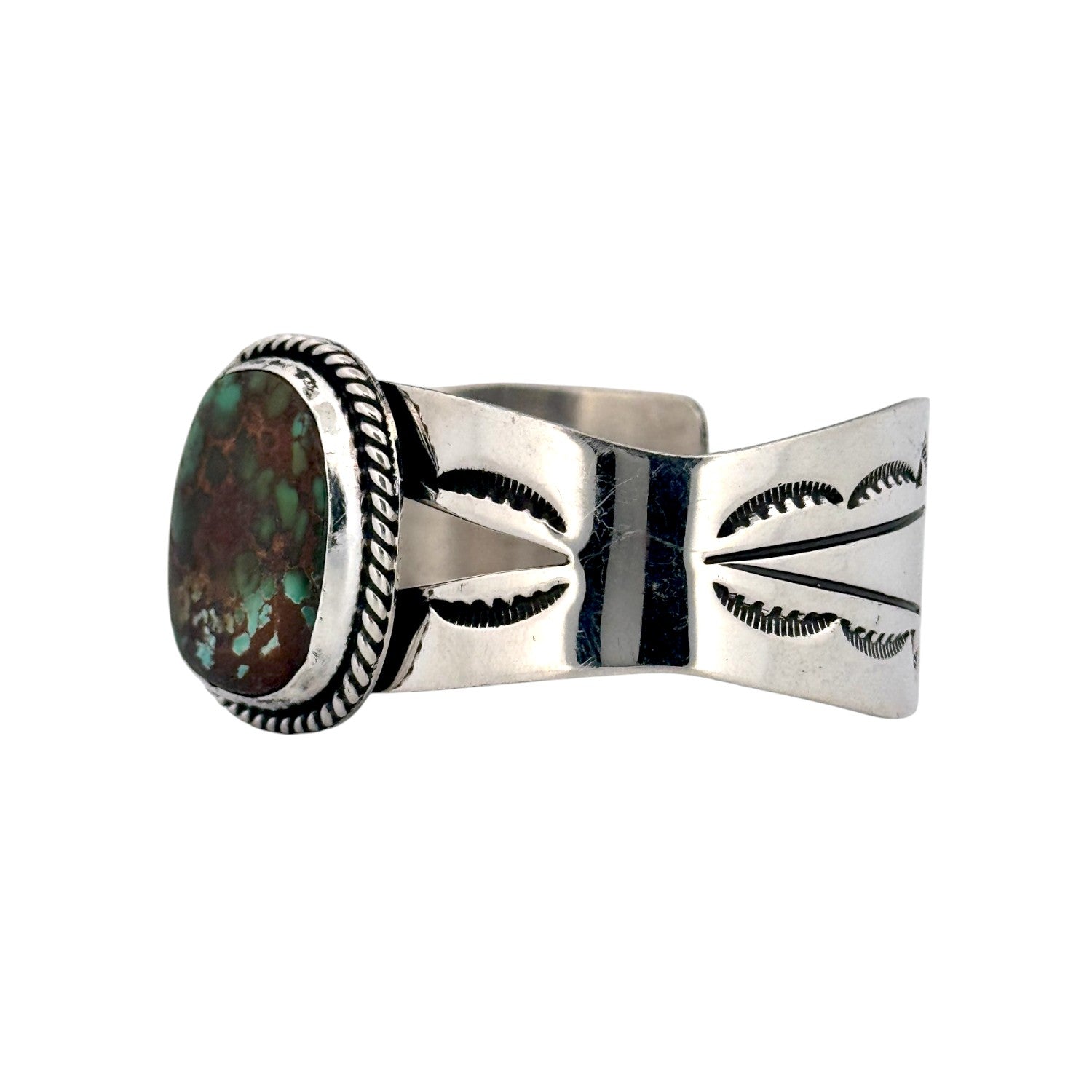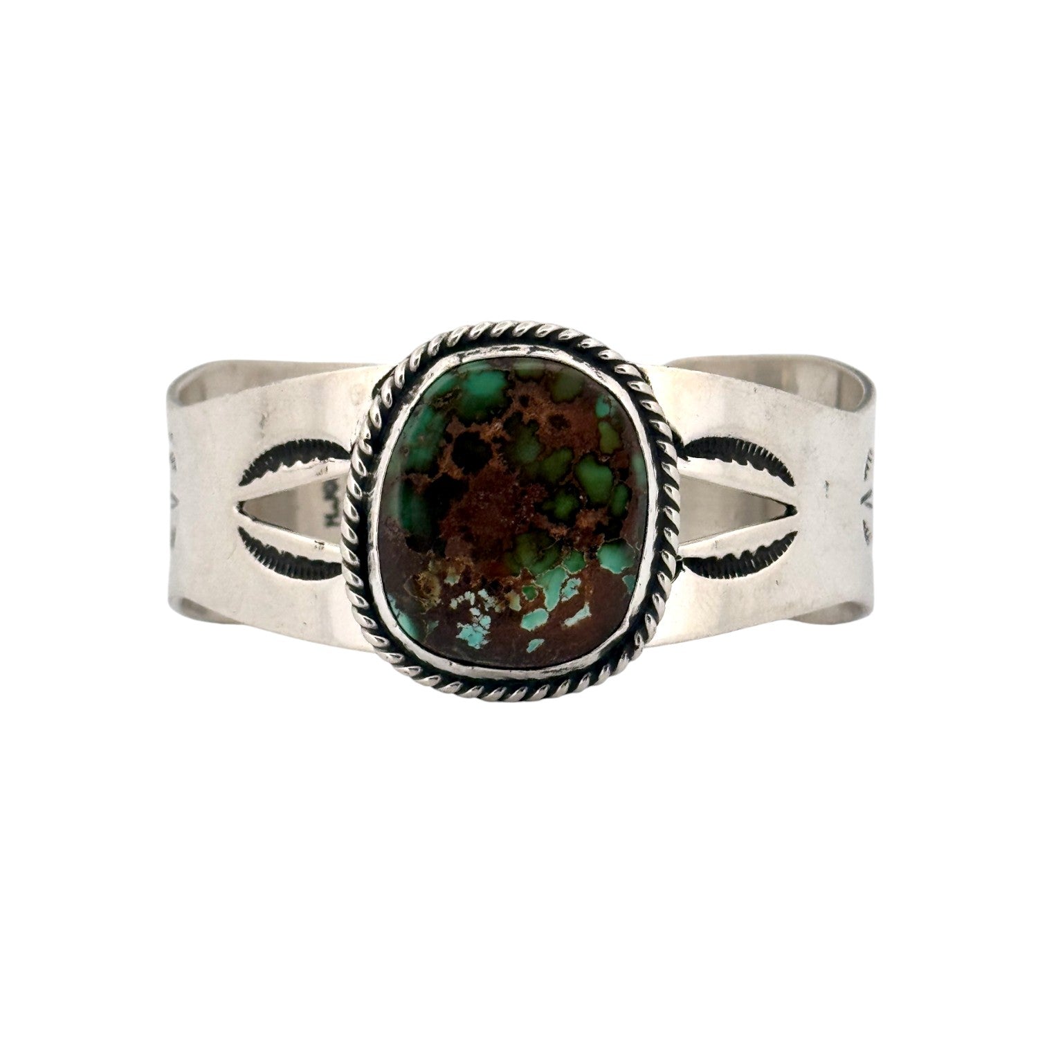 This Navajo handmade bracelet by silversmith Harold Joe highlights a striking Royston Turquoise stone set in gleaming sterling silver. The Royston stone displays a captivating blend of earthy browns and vivid greens, creating a natural landscape effect unique to this celebrated Nevada mine. Framed with a twisted silver rope bezel, the stone takes center stage against the sleek, hand-stamped silver band. Subtle split-shank detailing and traditional Navajo stampwork add balance and depth to the design.