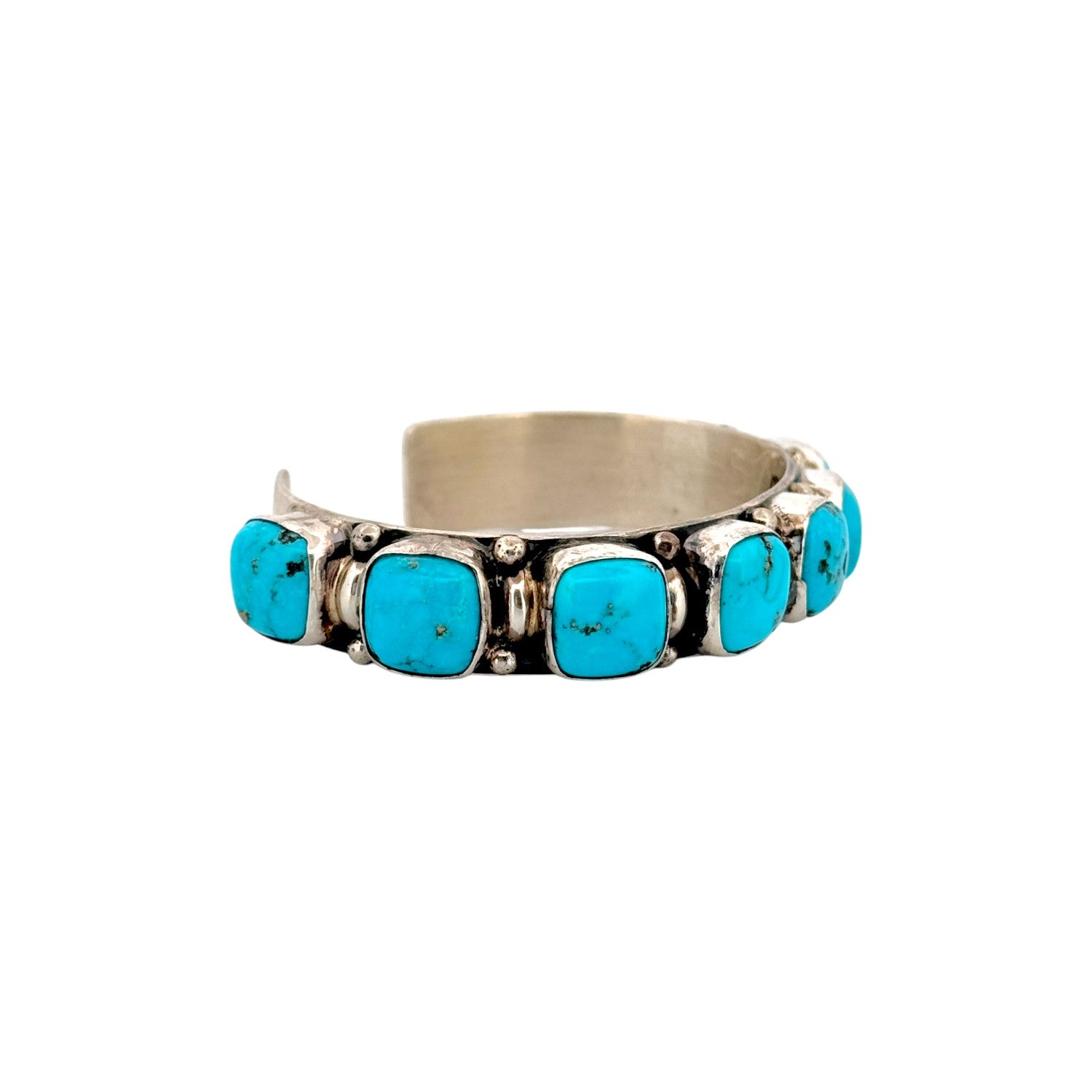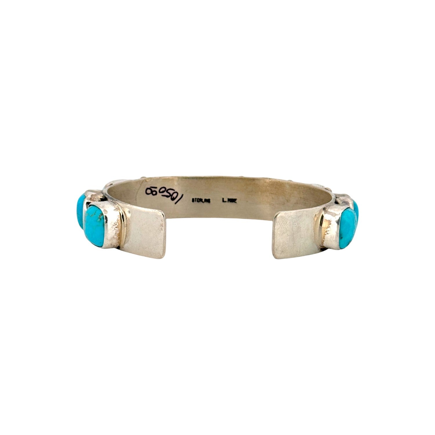 This vintage, circa 2000s Navajo bracelet by L Kee features a beautiful row of Persian turquoise stones set in sterling silver. Each stone showcases the mine’s signature bright blue hues and subtle matrix, creating a bold and cohesive presentation. The stones are framed in smooth bezels and accented with silver drops, highlighting traditional Navajo craftsmanship. A sturdy, wide cuff design provides both comfort and durability, allowing the turquoise to stand out prominently. Elegant and richly detailed, this handmade bracelet is a striking example of L Kee’s artistry.