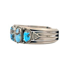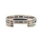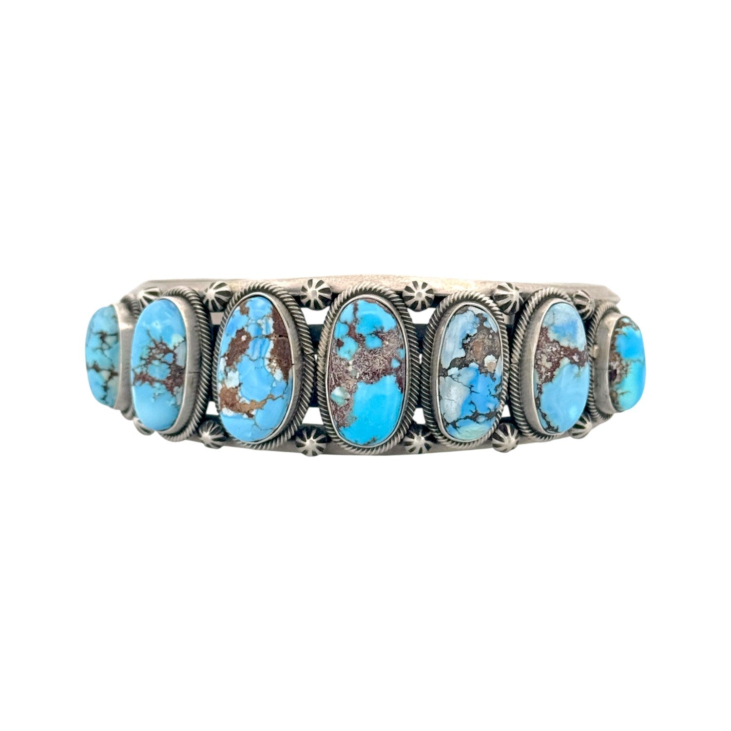 This Navajo handmade bracelet by Freddie Maloney showcases a stunning row of Golden Hills turquoise cabochons, each uniquely patterned with warm brown and golden matrix. Set in finely crafted sterling silver, the seven oval stones radiate a serene sky-blue tone that contrasts beautifully with their earthy inclusions. Each turquoise stone is framed by delicate twisted silver rope and accented with hand-stamped starburst designs, reflecting Maloney’s refined silversmithing skill. The solid cuff structure offers both elegance and strength, making it comfortable and durable for everyday wear or special occasions. The balanced design and exceptional turquoise quality highlight the artist’s dedication to traditional Navajo jewelry-making techniques.