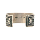 This bracelet by master silversmith Calvin Martinez is a stunning example of Navajo handmade craftsmanship, blending traditional design with exceptional detail. The centerpiece features a beautiful Waterweb Kingman Turquoise stone, showcasing a vivid blue hue with rich brown matrix patterns that evoke the natural beauty of the Southwest. The stone is framed by an intricately hand-stamped sterling silver cuff, adorned with radiating patterns, heart motifs, and raised conchos that give the piece a bold, dimensional character. Martinez’s hallmark antique finish adds depth and texture, highlighting the precision of each engraved element.