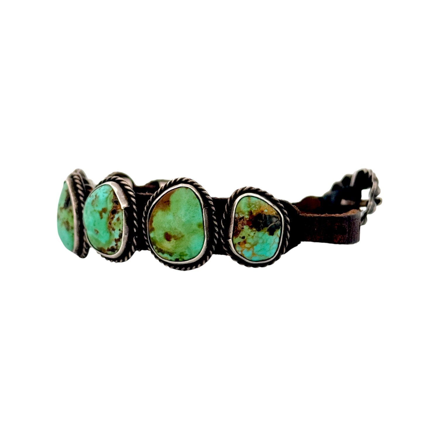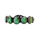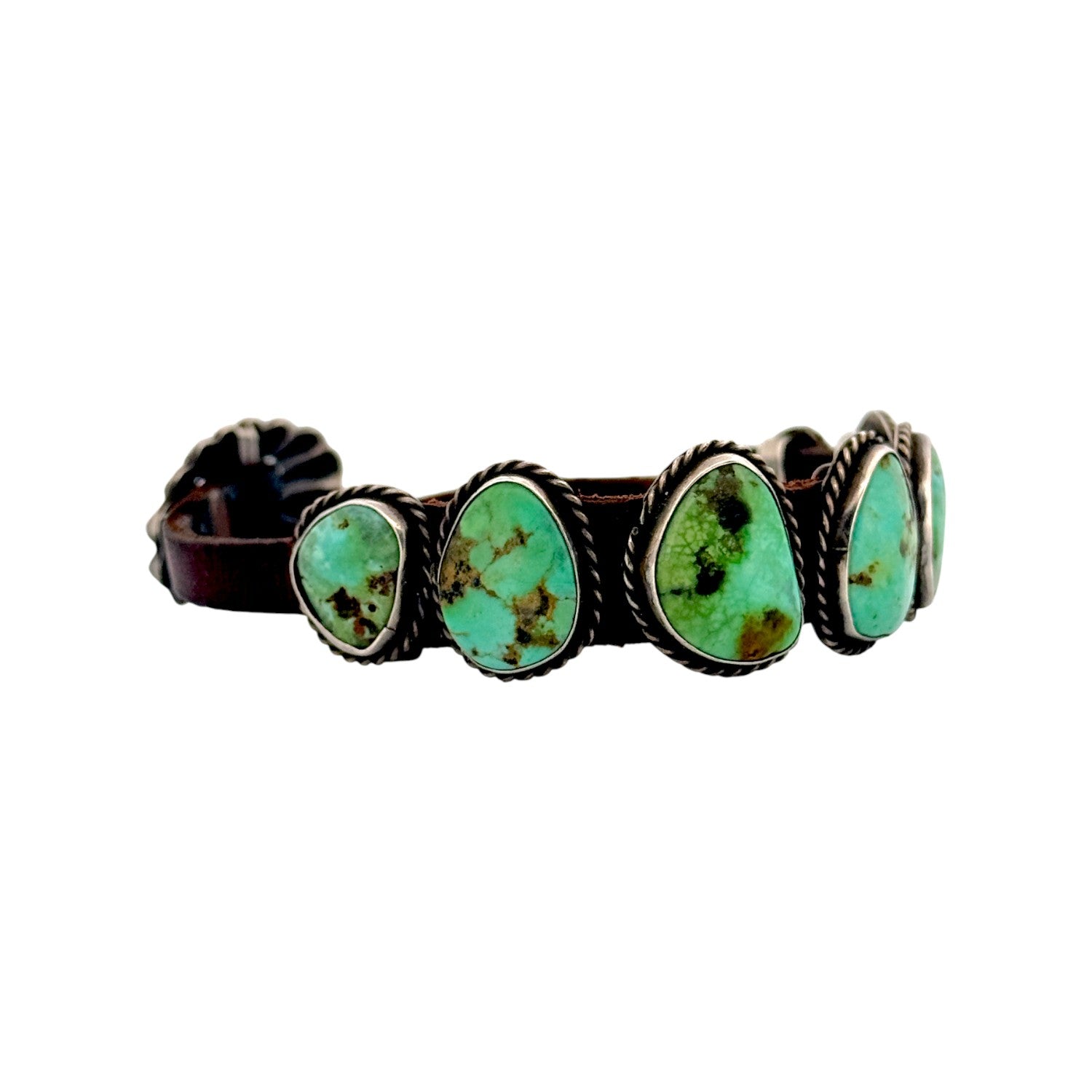 This beautiful vintage bracelet by Daniel Martinez, crafted circa 1990s, exemplifies the artistry and heritage of Navajo handmade jewelry. The cuff showcases a stunning array of Pilot Mountain turquoise stones, each uniquely shaped and featuring rich blue-green tones with distinctive brown and gold matrix patterns. Set in sterling silver, each stone is framed by finely twisted wire detailing that enhances its natural contours. The oxidized silver background provides a striking contrast, emphasizing the depth and character of the turquoise. With its balanced design and refined craftsmanship, this bracelet reflects Daniel Martinez’s exceptional skill and traditional Navajo silversmith techniques. Elegant and timeless, it serves as both a statement piece and a celebration of Southwestern artistry.