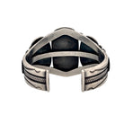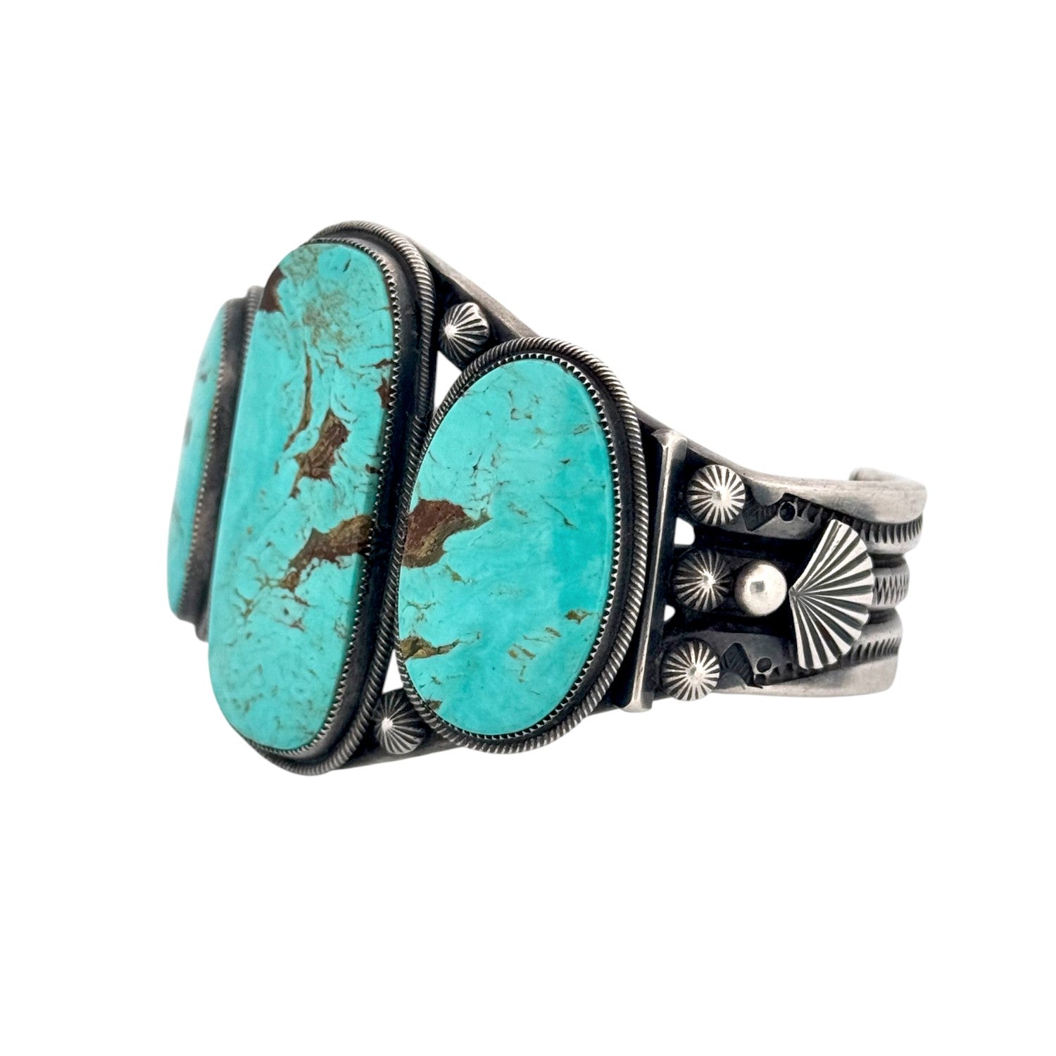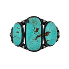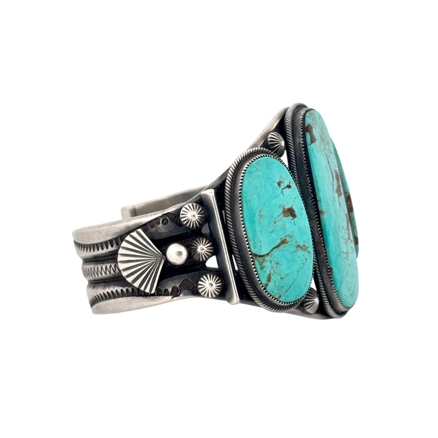 This exquisite Navajo handmade bracelet features three striking Kingman Turquoise stones, each showcasing vibrant blue hues with rich brown matrix patterns. Expertly set in sterling silver, the stones are framed with twisted rope detailing and surrounded by hand-stamped sunburst designs, emphasizing the traditional artistry of Navajo silversmithing. The wide silver cuff provides a bold, balanced foundation that complements the natural beauty of the turquoise. Each stone is carefully chosen for its character and color variation, reflecting the timeless allure of Kingman Turquoise from Arizona.