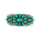 This vintage bracelet by Violet Nez, crafted circa 1990, is a beautiful example of traditional Navajo handmade artistry. The cuff features a radiant cluster design of Kingman turquoise stones, each showcasing vibrant blue hues with delicate matrix patterns. The stones are expertly arranged in a classic oval and teardrop formation, framed by twisted sterling silver rope detailing and silver bead accents that add texture and depth. The symmetry and balance of the design highlight Nez’s refined craftsmanship and deep respect for Navajo jewelry traditions. The bracelet’s bold yet graceful presence makes it a timeless statement piece that honors the beauty of the natural turquoise and the heritage of its maker.