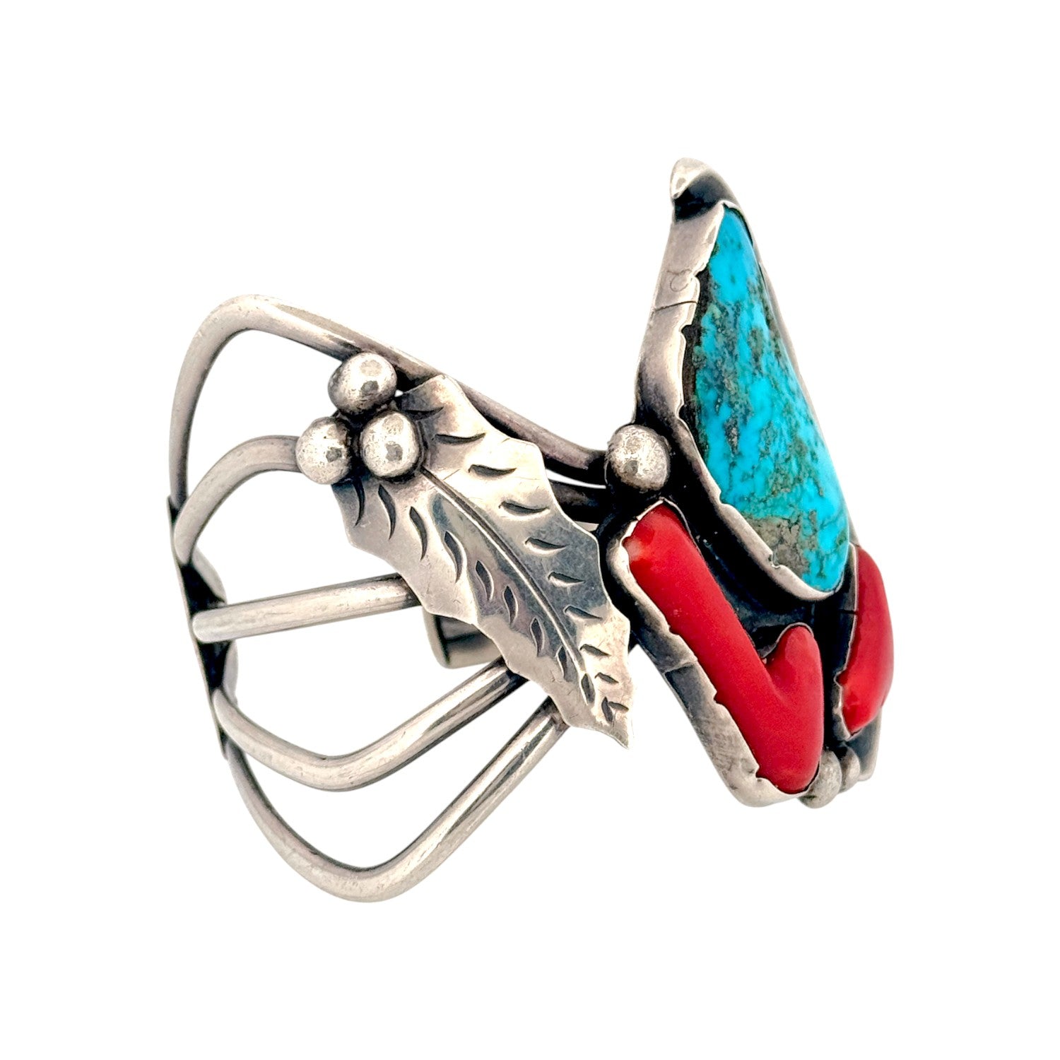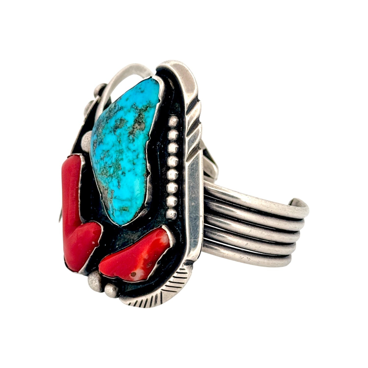 This vintage Navajo bracelet by Ramone Platero, crafted circa 2000s, beautifully combines Persian turquoise and red coral in a bold, traditional design. The striking contrast between the sky-blue turquoise and deep red coral creates a vivid and balanced composition that celebrates nature’s finest colors. Each stone is expertly bezel-set in sterling silver, framed by hand-stamped feather motifs, silver beads, and graceful curves that highlight Platero’s skilled craftsmanship. The split shank cuff provides both strength and comfort, allowing the design to sit elegantly on the wrist. The oxidized background enhances the dimensional detail of the piece, bringing out the vibrant hues of the stones.