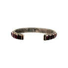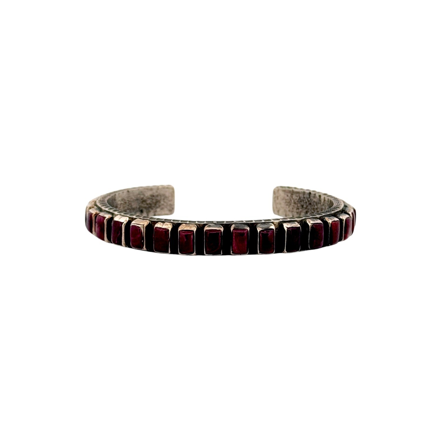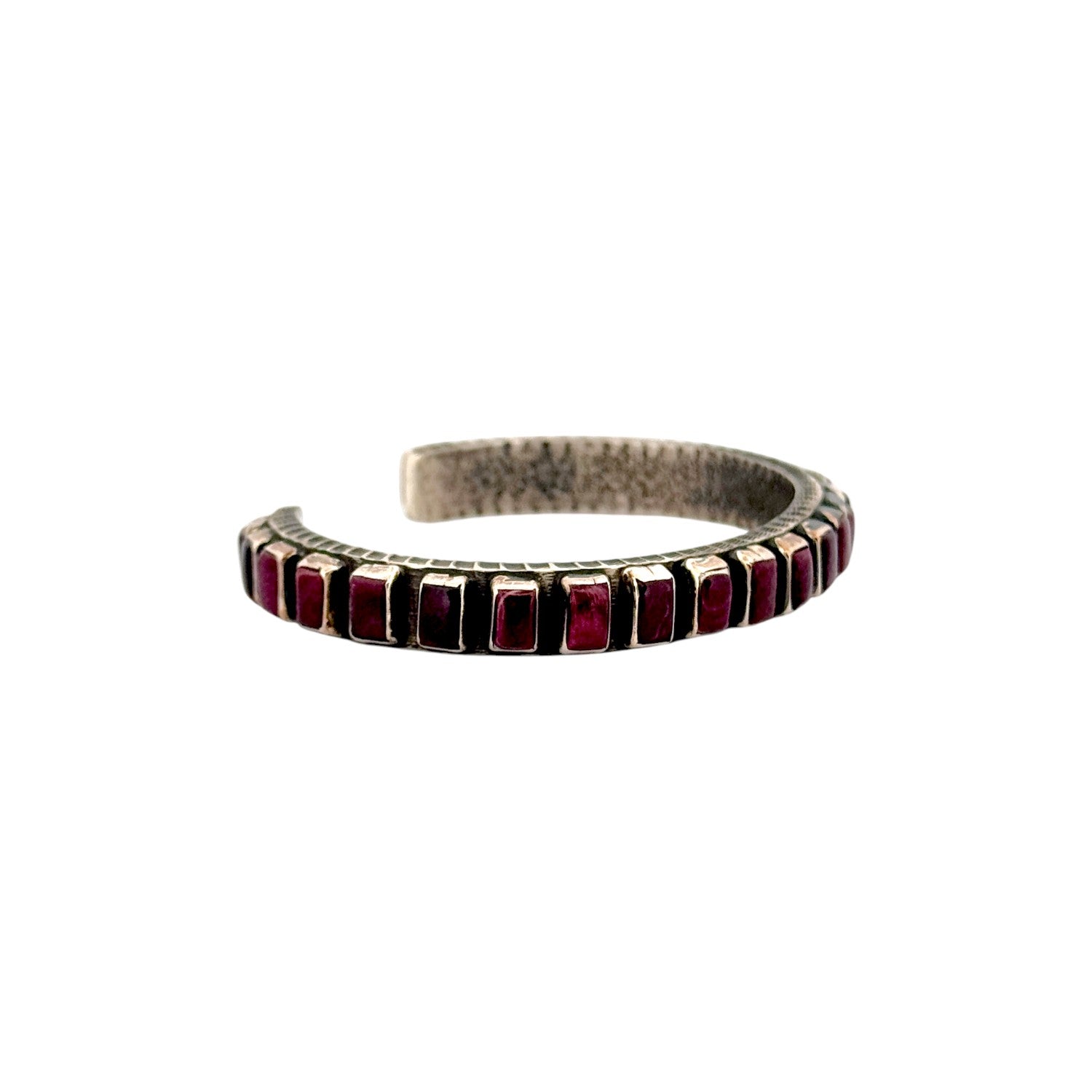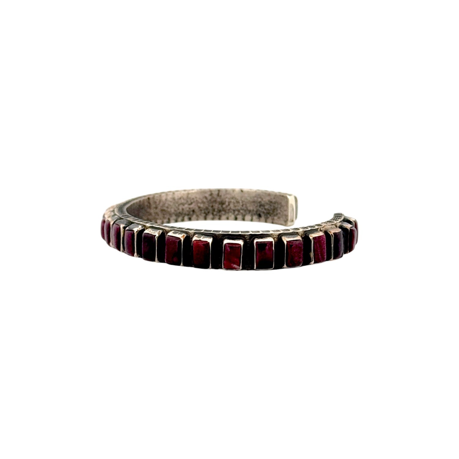 This Navajo handmade bracelet by Ernest Rangel features a striking inlay of deep purple spiny oyster shell set in sterling silver. Each rectangular shell piece is precisely cut and fitted, creating a seamless and richly colored row along the cuff. The darkened silver channels enhance the vivid purple tones, adding dramatic contrast and depth. Rangel’s signature craftsmanship is evident in the clean lines, sturdy construction, and refined finish. Bold, elegant, and beautifully handcrafted, this bracelet is a standout example of contemporary Navajo artistry.