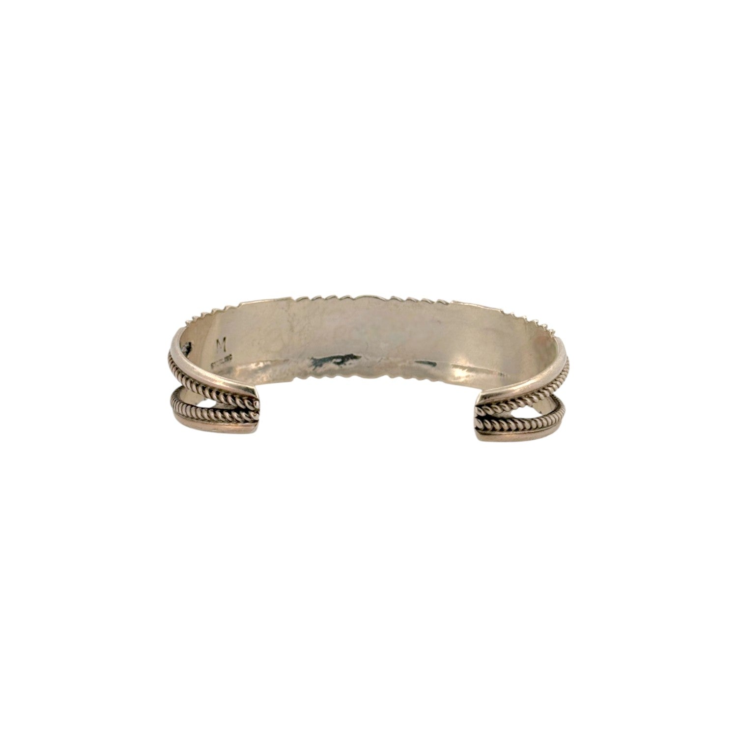 This vintage Navajo handmade bracelet by Mike Thomas is crafted in sterling silver and set with a striking row of Sleeping Beauty turquoise stones, prized for their bright sky-blue color. Each stone is individually bezel-set and arranged in a continuous line, creating a clean and balanced design. The bracelet is accented with twisted rope borders, hand-stamped details, and traditional silverwork that reflect classic Navajo craftsmanship. Its solid cuff construction offers both durability and a comfortable fit, making it ideal for everyday wear or special occasions. Signed by the artist, this piece is a timeless example of Mike Thomas’s skill and the enduring beauty of Southwestern jewelry.