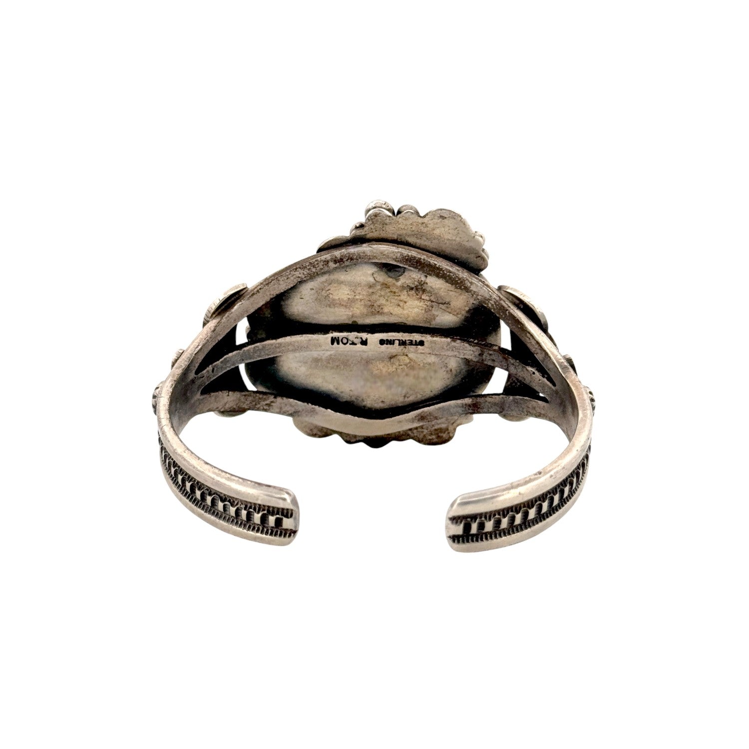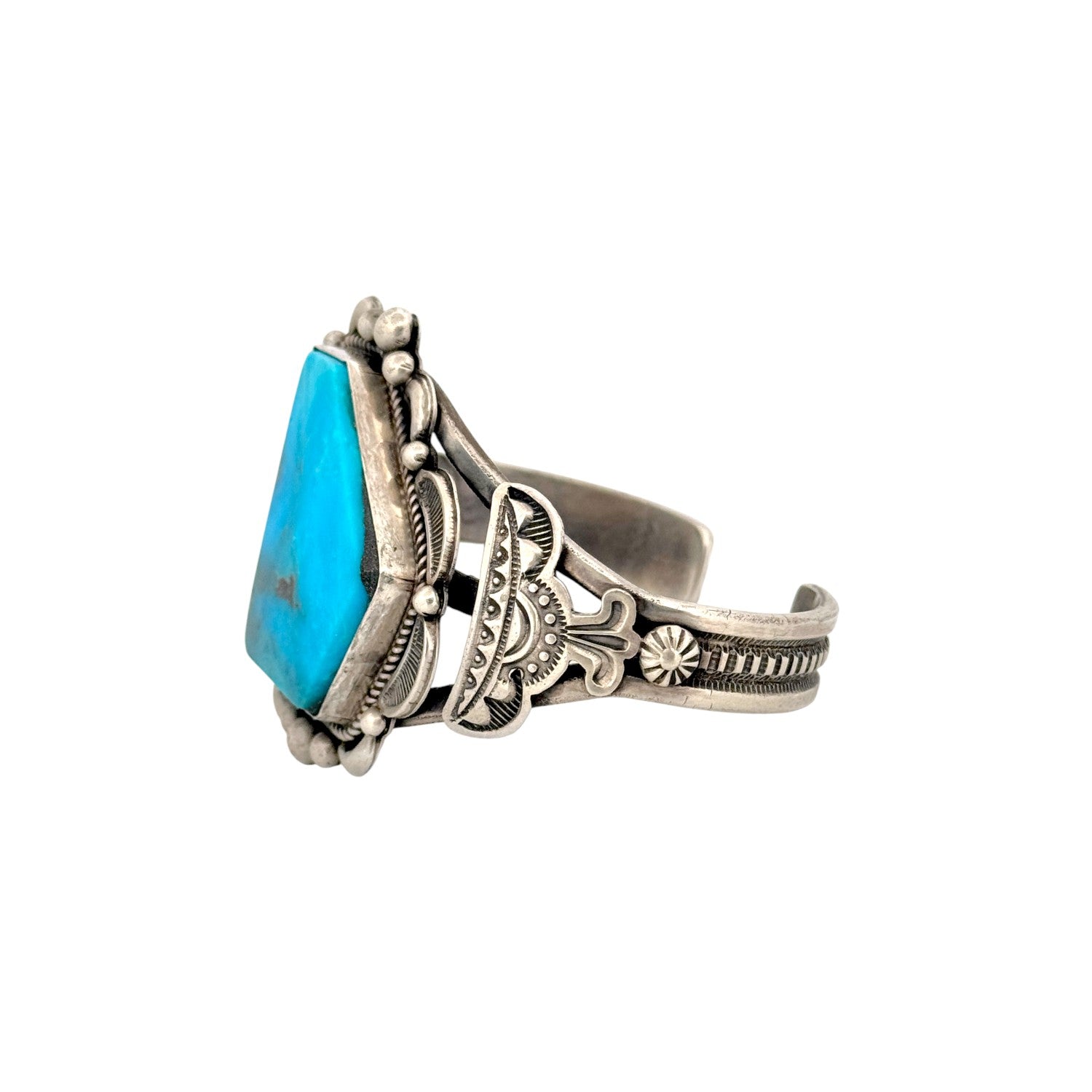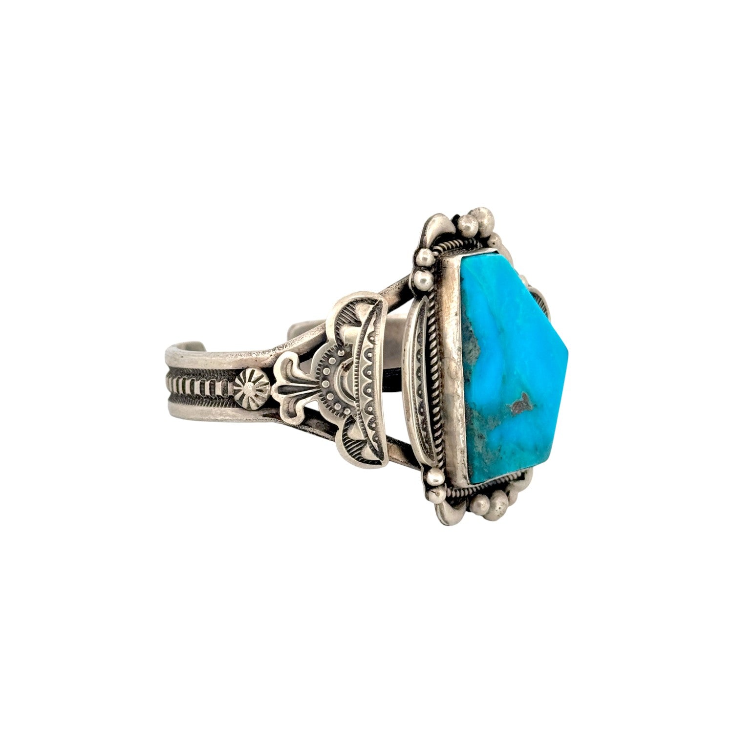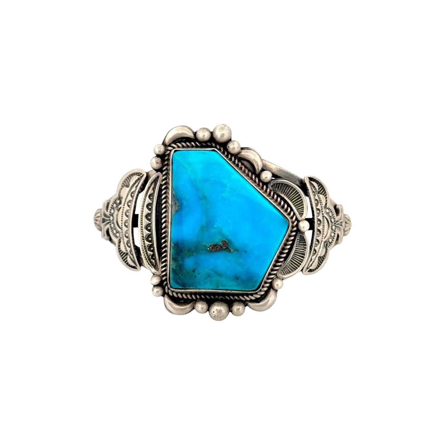 This Navajo handmade bracelet by Randall Joe Tom features a stunning Nevada Blue turquoise stone set in sterling silver. The stone’s vivid blue coloring and natural matrix create a bold and captivating centerpiece. Surrounding the turquoise is intricate silverwork, including twisted rope accents, hand-stamped patterns, and raised bead detailing. The wide, multi-layered cuff design adds strength, balance, and impressive visual depth. Beautifully crafted and richly detailed, this bracelet showcases the exceptional artistry of Randall Joe Tom.