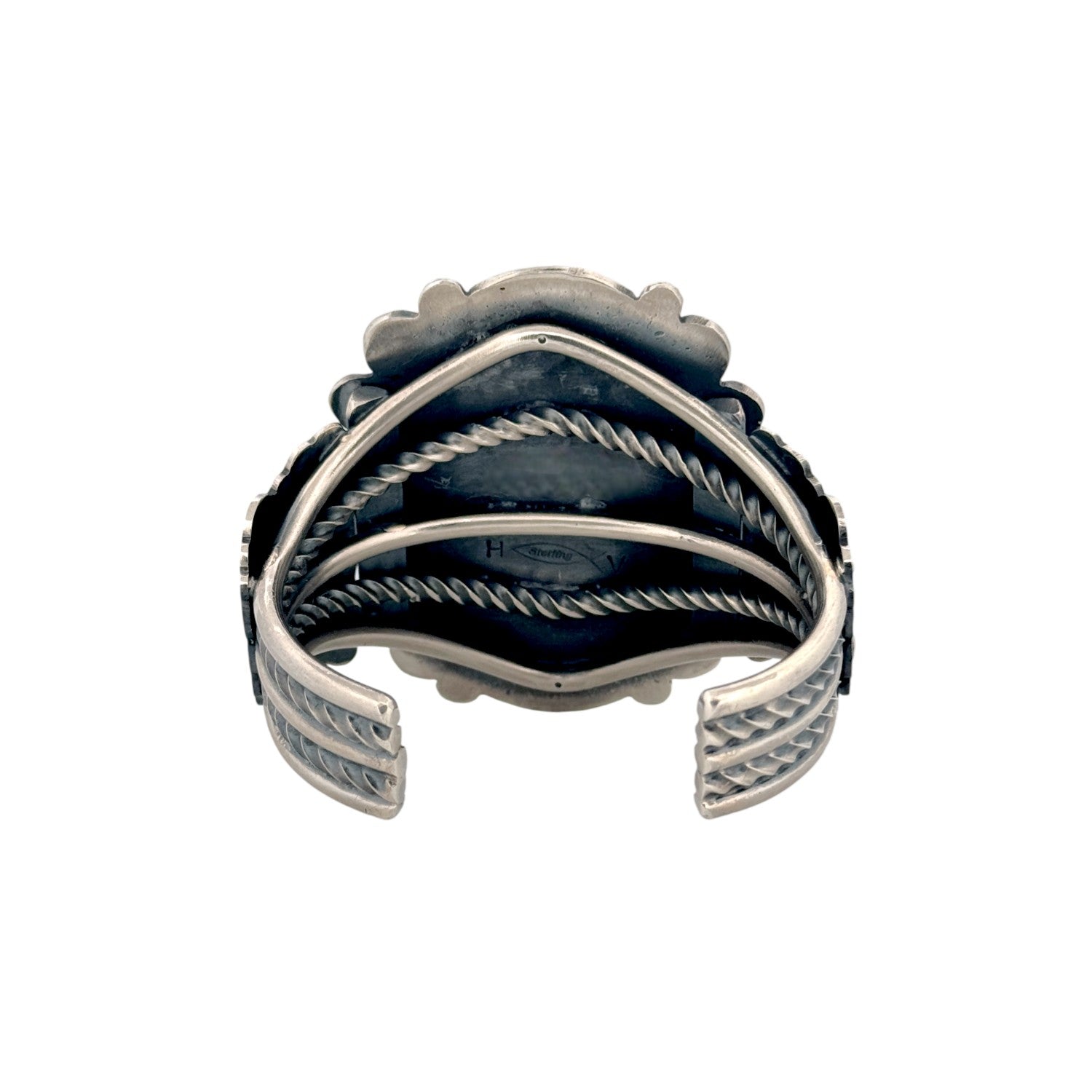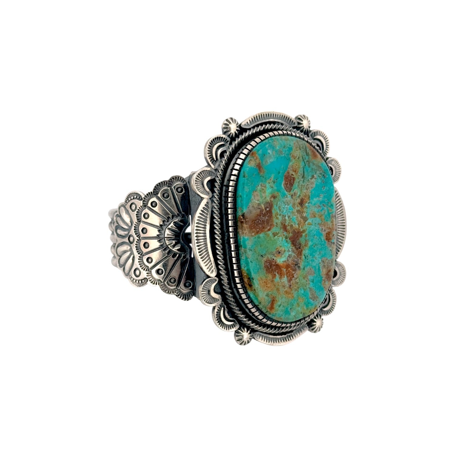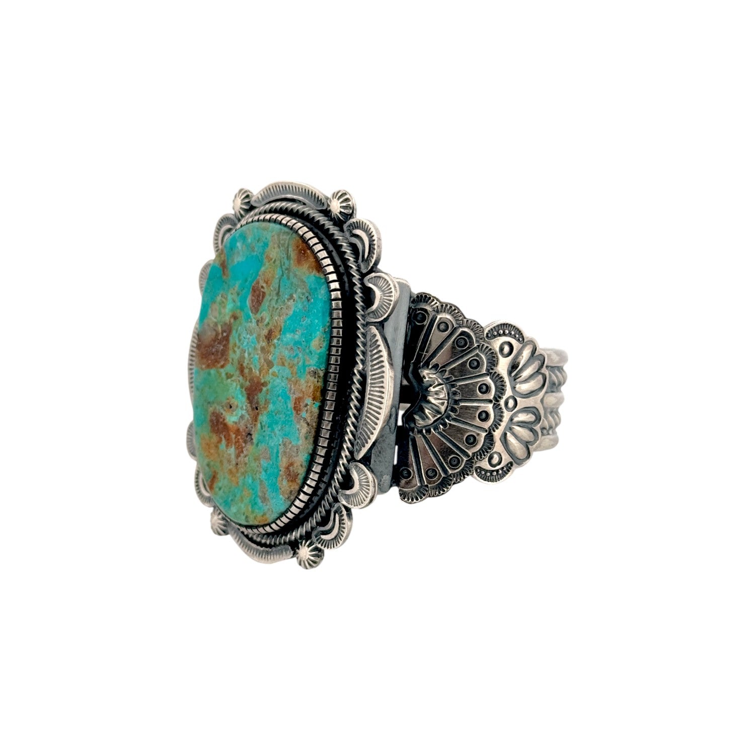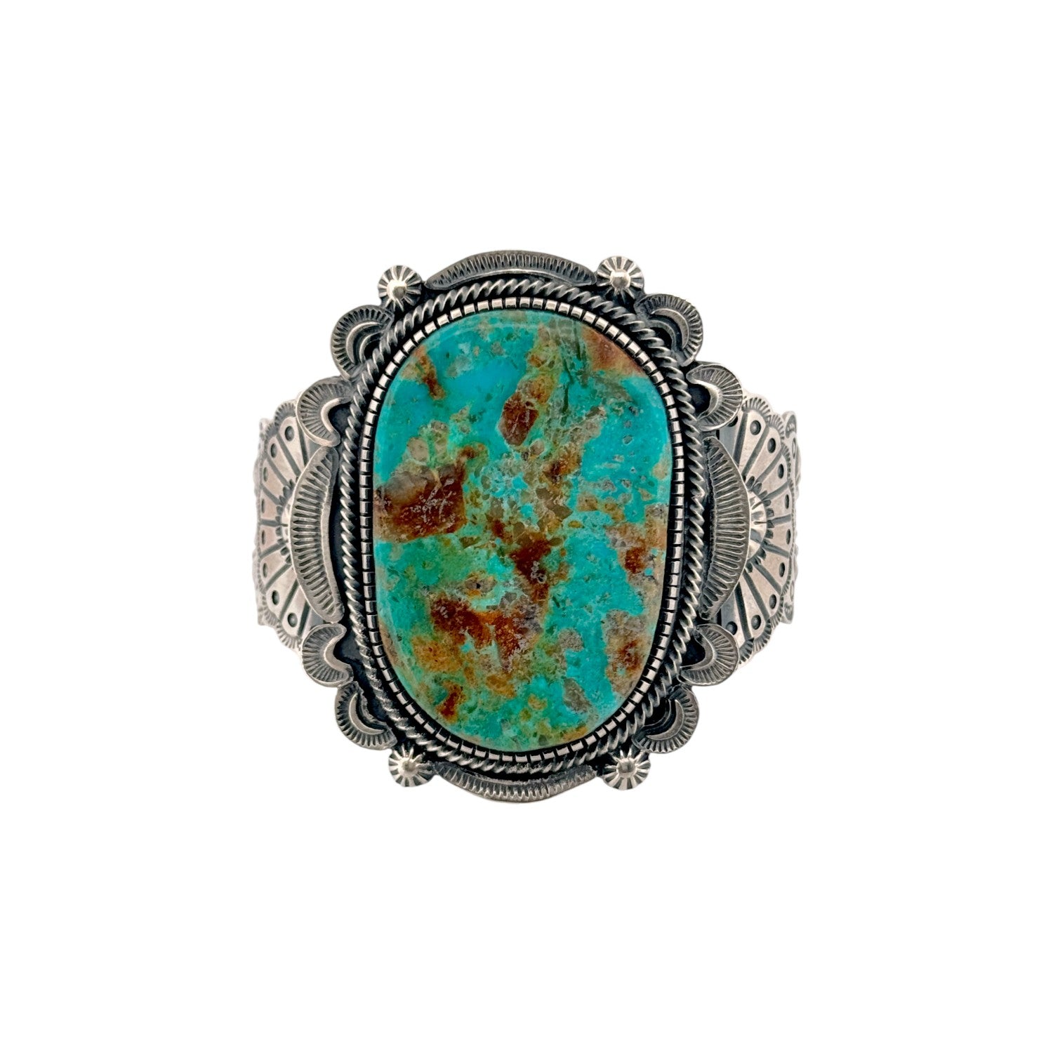 This Navajo handmade bracelet by Hank Vandever features a stunning Royston turquoise stone with rich blue-green tones and warm natural matrix. Set in solid sterling silver, the oval cabochon is framed by intricate hand-stamped and appliqué silverwork. The bold craftsmanship highlights the stone while adding depth and texture to the overall design. Known for his precise and detailed metalwork, Vandever’s artistry is evident in every element of this bracelet. A striking statement piece, it’s ideal for collectors and admirers of authentic Navajo turquoise jewelry.