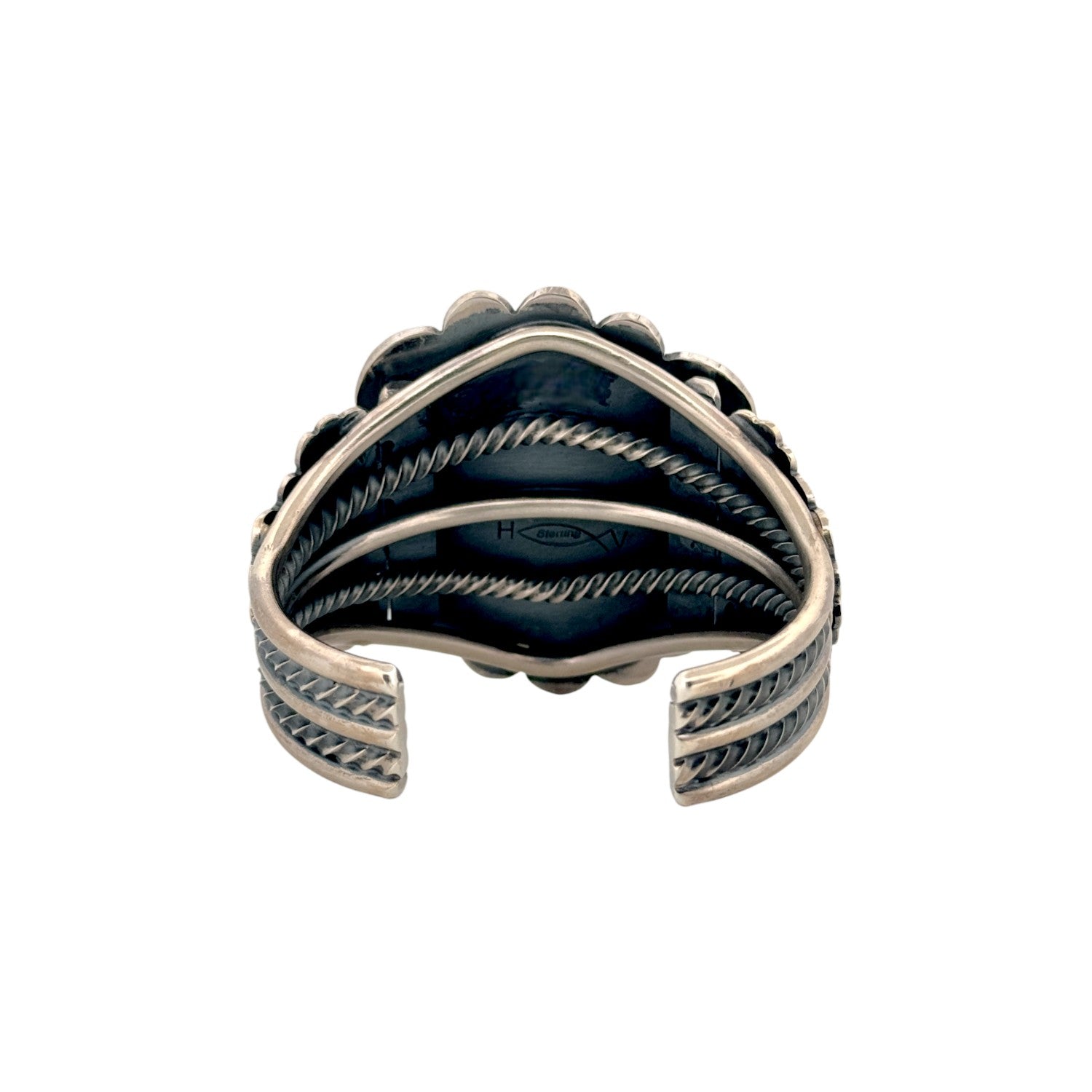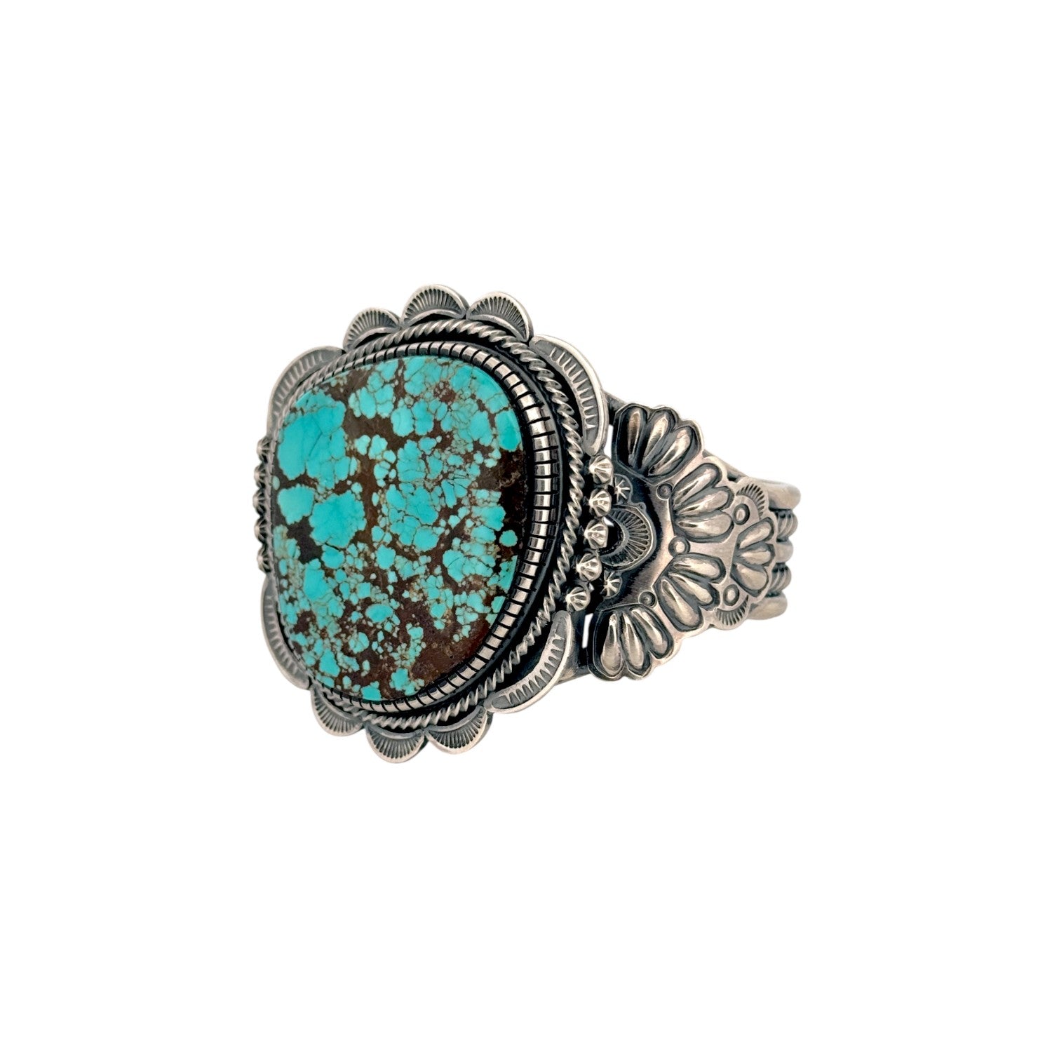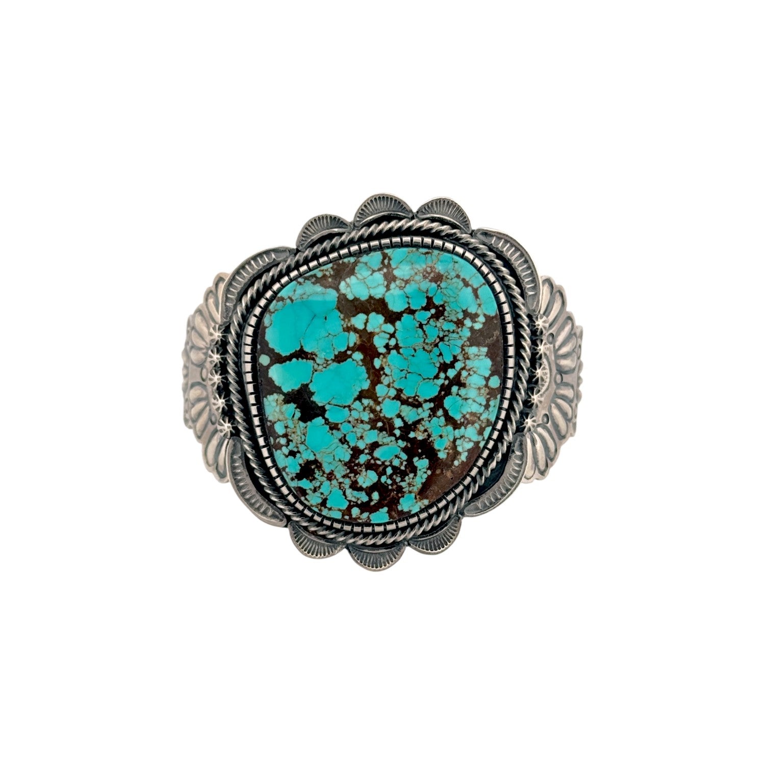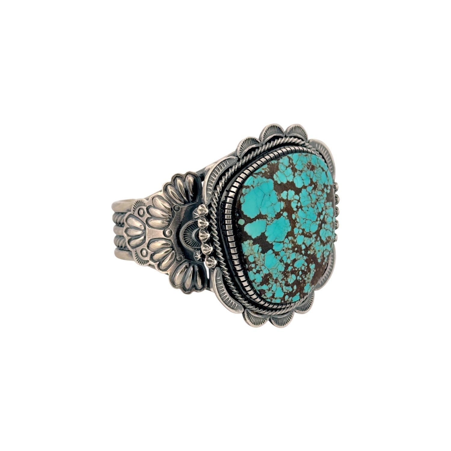 This Navajo handmade bracelet by Hank Vandever features a striking Number 8 turquoise stone with vibrant blue hues and rich spiderweb matrix. Set in solid sterling silver, the bold cabochon is framed by Vandever’s signature layered silverwork and detailed hand stamping. The intricate matrix creates depth and character, making the stone a true focal point. Expert craftsmanship and balanced proportions reflect Vandever’s mastery of traditional Navajo silversmithing. A powerful statement piece, this bracelet is ideal for collectors and admirers of high-quality Native American turquoise jewelry.