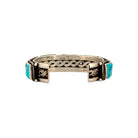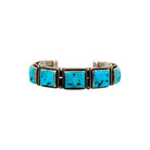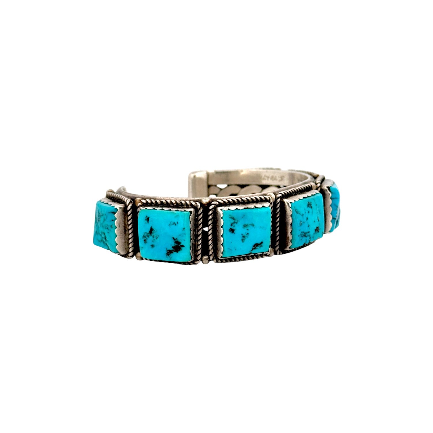 This vintage, circa 1990s Navajo bracelet features a striking row of Lone Mountain turquoise stones set in sterling silver. Each square-cut stone showcases the mine’s signature bright blue color and fine matrix, making the bracelet visually bold and cohesive. The stones are framed with twisted rope borders and serrated bezels, reflecting traditional Navajo silversmith craftsmanship. A sturdy silver cuff provides durability while allowing the turquoise to remain the focal point. Timeless and beautifully made, this bracelet is a classic representation of Southwestern artistry.