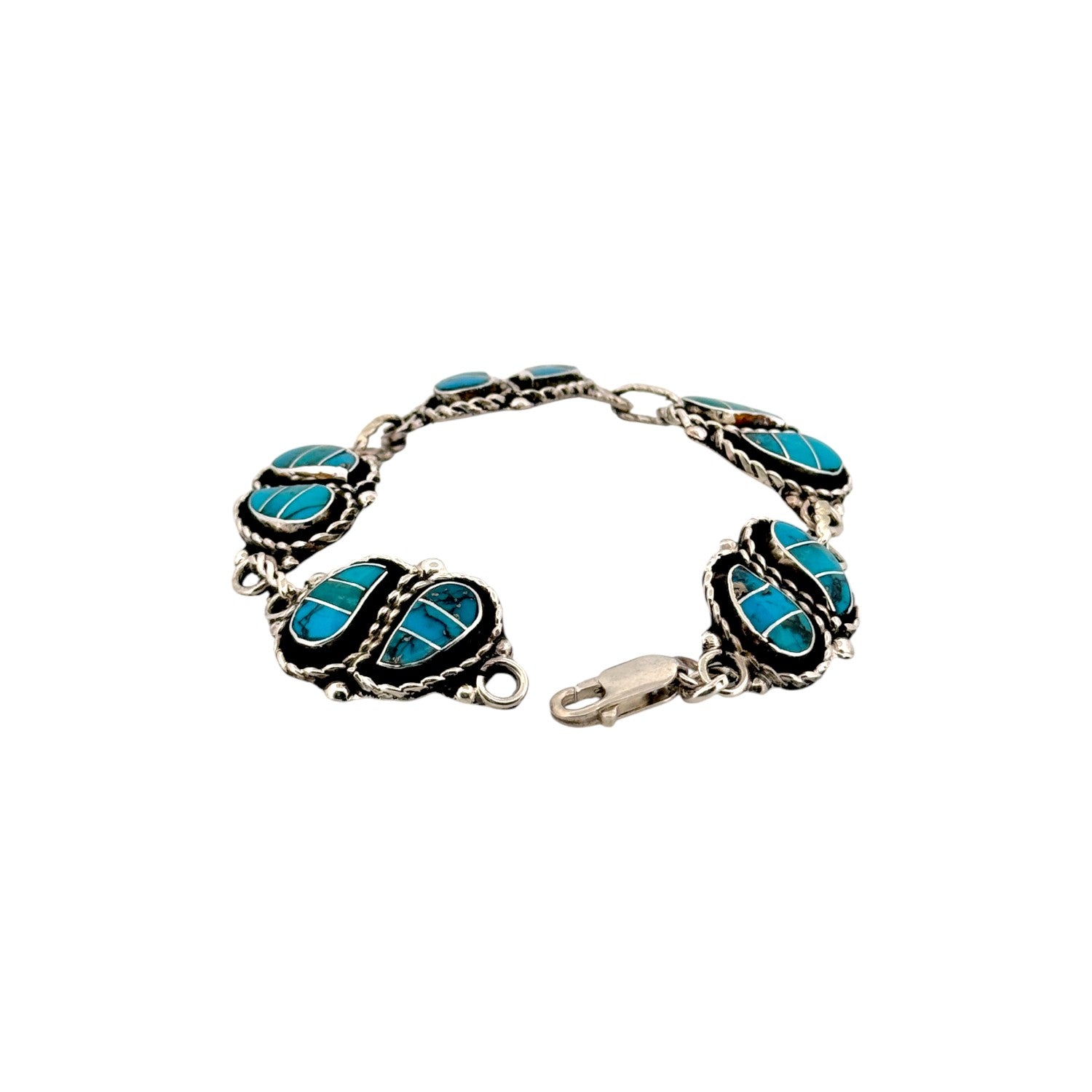 This vintage, circa 2000s Zuni handmade bracelet highlights beautifully inlaid Persian Turquoise arranged in classic split-stone patterns. Each link features expertly crafted sterling silver work, including twisted wire accents and detailed framing that enhances the vibrant blue stones. The turquoise showcases rich matrix variations, adding depth and character to every section of the bracelet. A secure sterling silver clasp connects the articulated links, allowing it to drape comfortably and elegantly around the wrist. A stunning example of traditional Zuni craftsmanship, this piece blends intricate artistry with timeless Southwestern style.