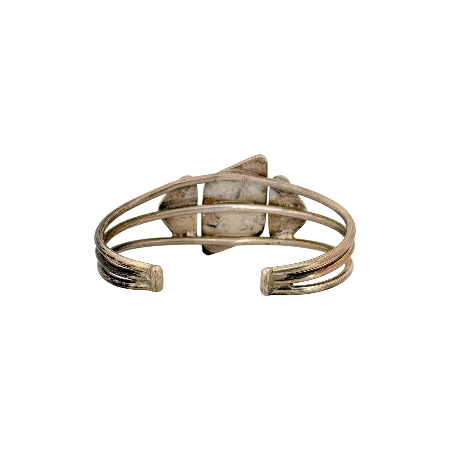 This vintage, circa 2000s Navajo bracelet features a striking agate stone set in a sterling silver frame. The stone’s natural patterns and deep, smoky hues give the piece a unique and captivating presence. A twisted silver border surrounds the diamond-shaped stone, highlighting traditional Navajo silversmithing techniques. The triple-band cuff design adds elegance and balance, complemented by hand-stamped decorative plates on each side. Distinctive and beautifully crafted, this handmade bracelet is a timeless example of Southwestern artistry.