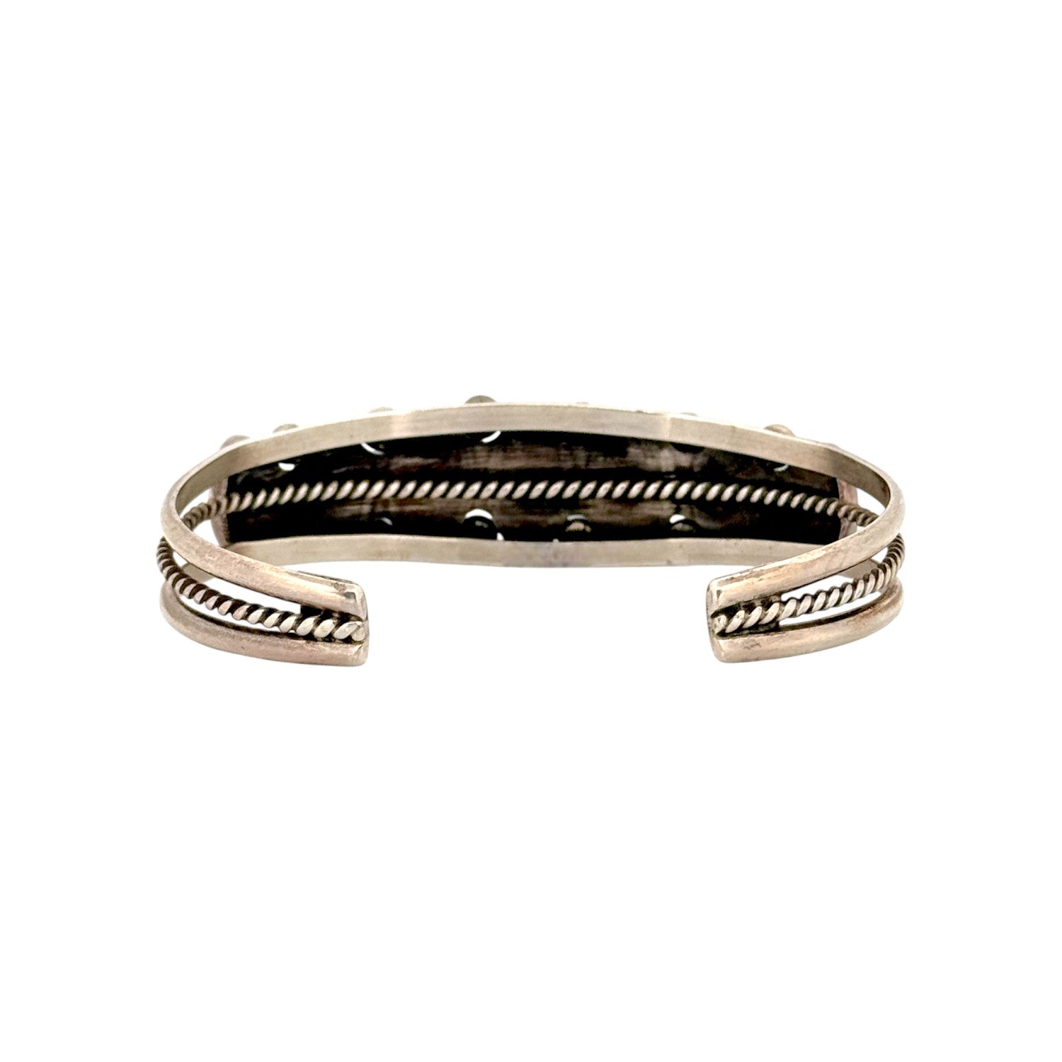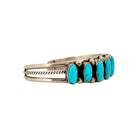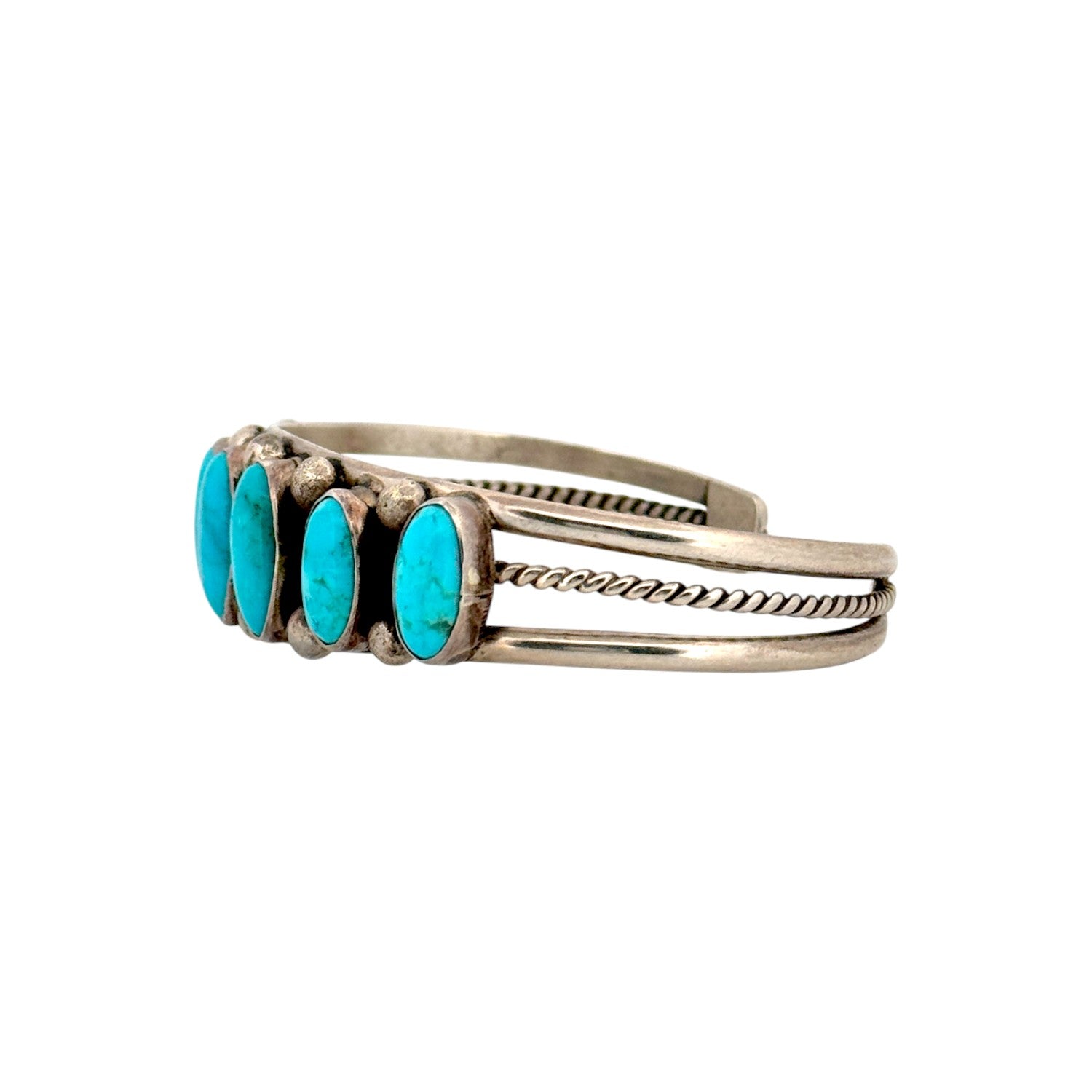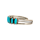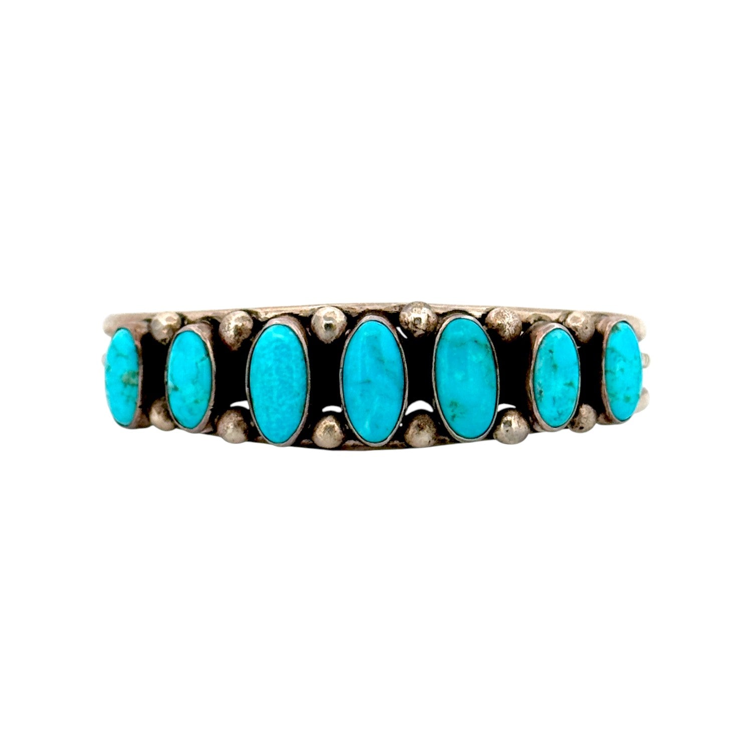 This stunning vintage bracelet, handcrafted circa the 1990s, showcases the timeless artistry of Navajo silversmiths. It features seven vibrant Kingman turquoise stones, each carefully set in smooth sterling silver bezels that highlight their brilliant blue hues and natural matrix patterns. The stones are accented by polished silver beads, adding a refined texture and depth to the design. Expertly made from solid sterling silver, this piece carries both durability and elegance, a hallmark of traditional Navajo craftsmanship. The bracelet’s classic cuff style ensures a comfortable fit while allowing the turquoise to take center stage.