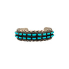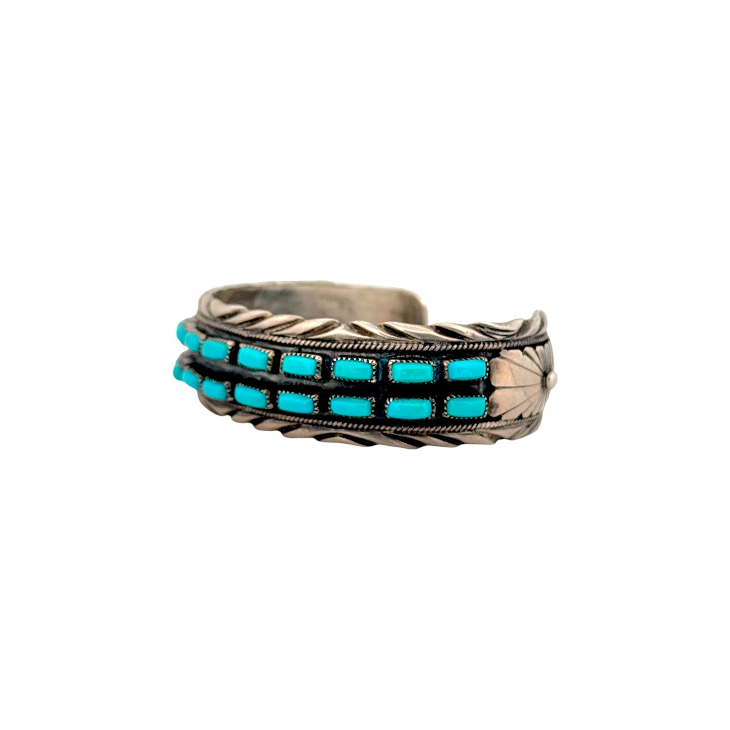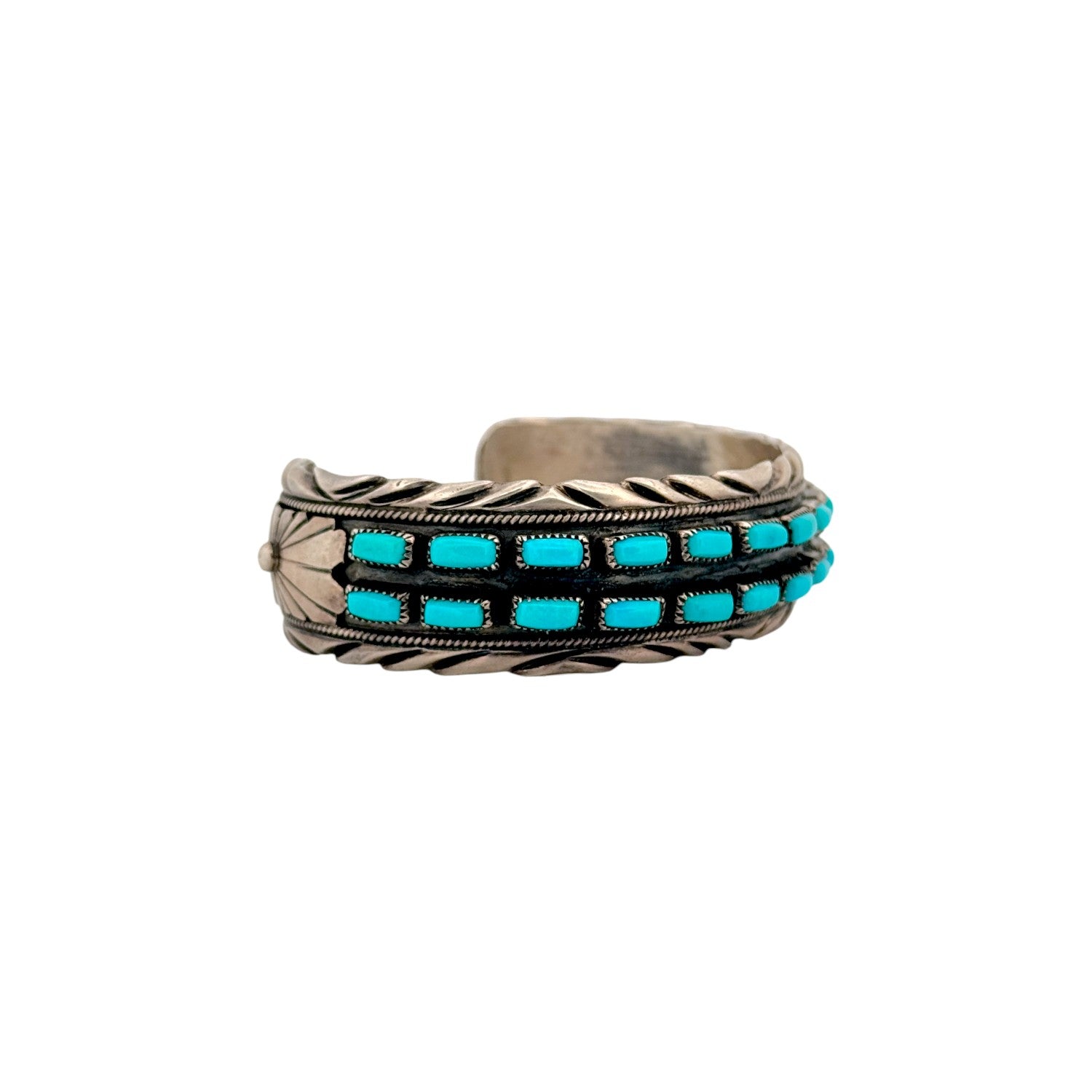 This vintage Navajo handmade bracelet features three rows of finely set Kingman Turquoise stones arranged in a classic channel inlay style. The vibrant blue stones are neatly framed in sterling silver, their rich color enhanced by the oxidized background. Twisted wire borders and stamped silver edges add traditional Navajo detailing and depth to the design. The cuff’s sturdy construction and precise inlay work reflect the skill and craftsmanship of its maker. A timeless Southwestern piece, this bracelet beautifully showcases the beauty of Kingman Turquoise and vintage Navajo artistry.