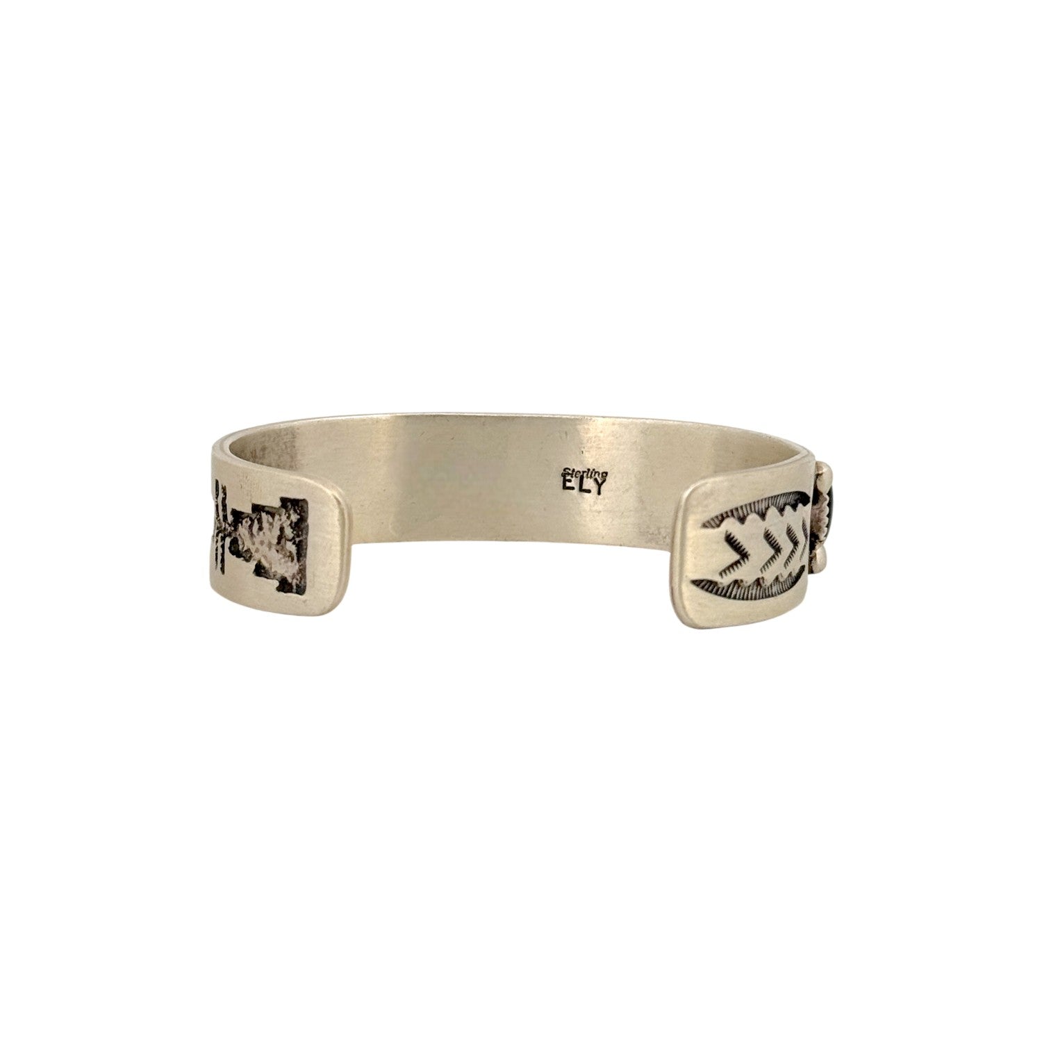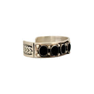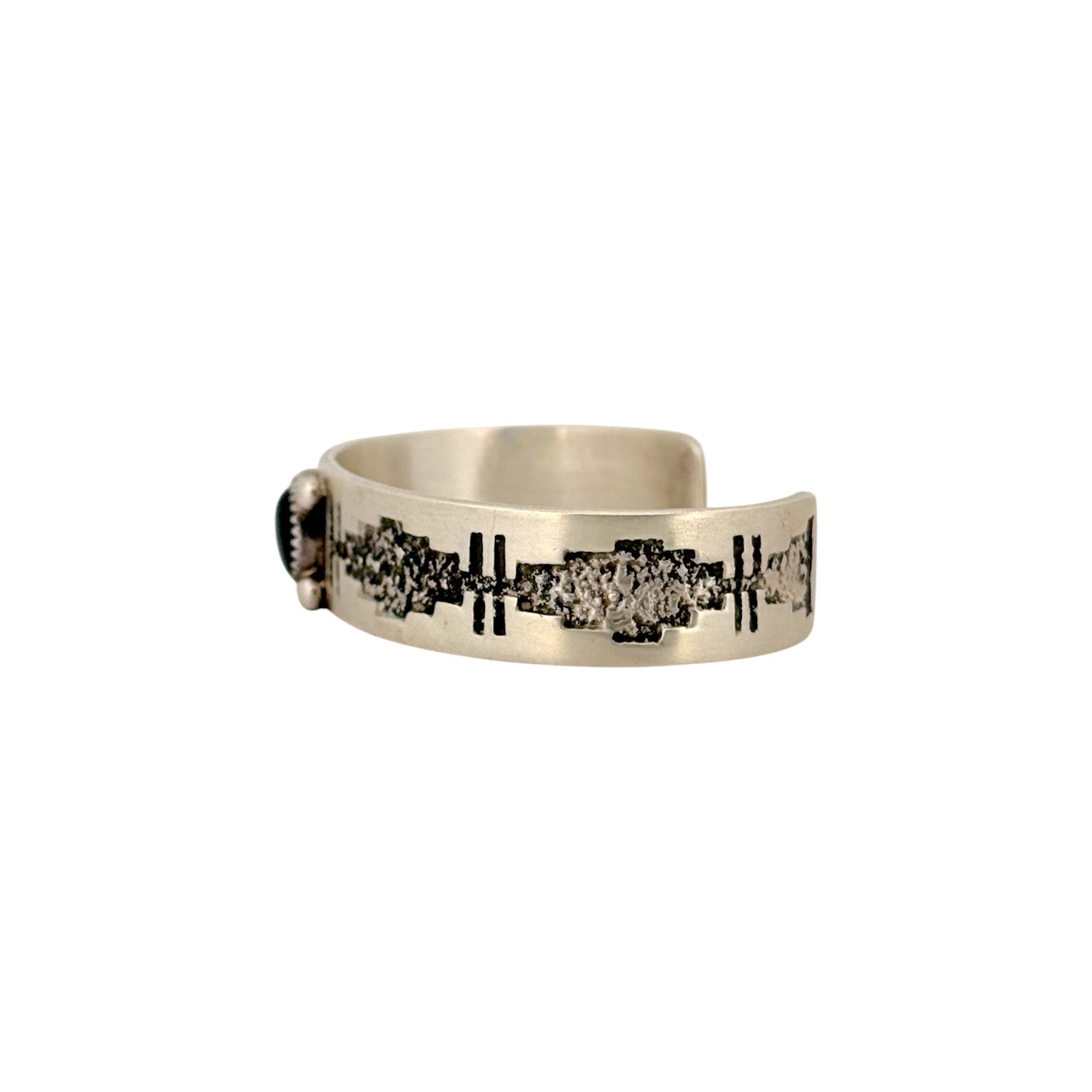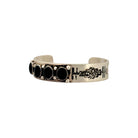 This Emery Yazzie bracelet features a bold row of polished Black Onyx stones, each set in finely detailed serrated bezels. The deep, glossy black of the onyx creates a striking contrast against the warm, vintage-finished sterling silver. Clean lines and balanced spacing highlight Yazzie’s signature Navajo craftsmanship and attention to detail. The cuff’s sleek profile makes it versatile, comfortable, and perfect for everyday wear or special occasions. Handmade with pride, this piece offers timeless elegance rooted in traditional Navajo silversmithing.