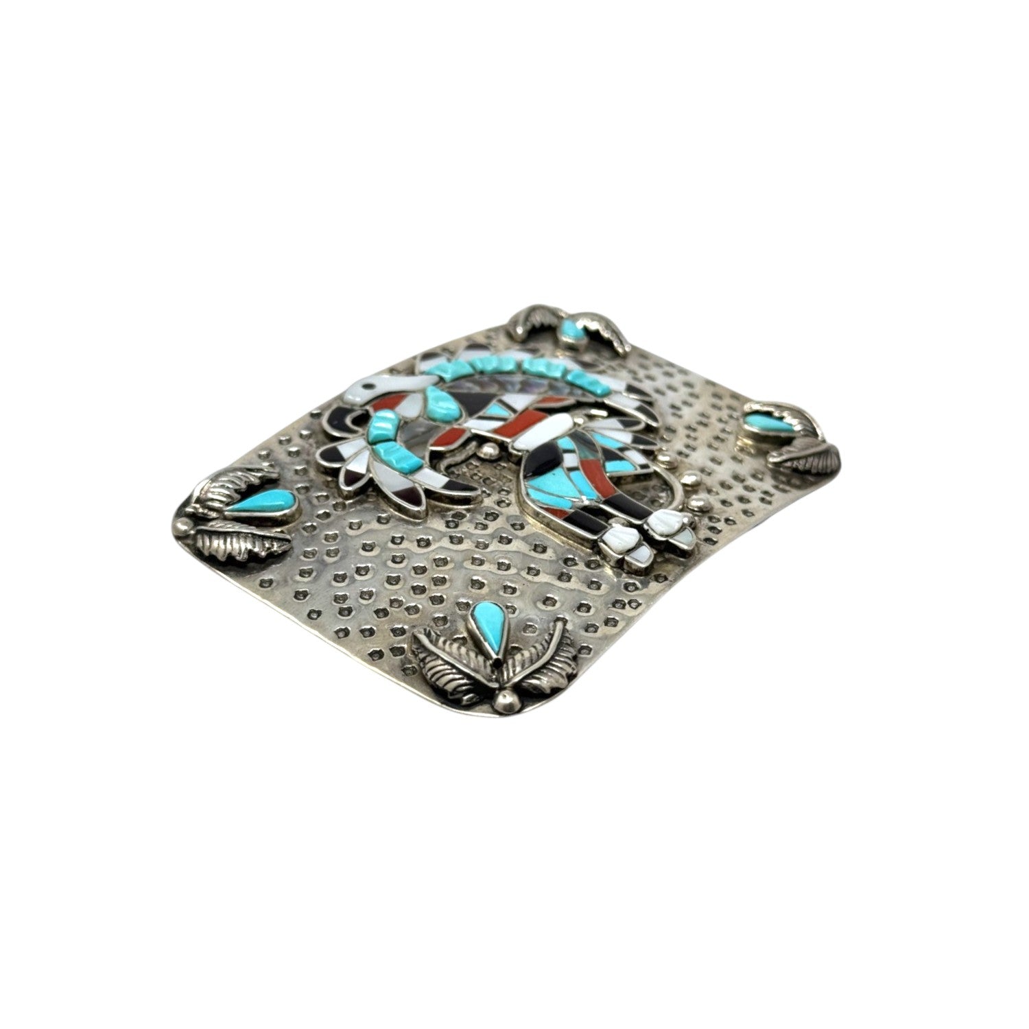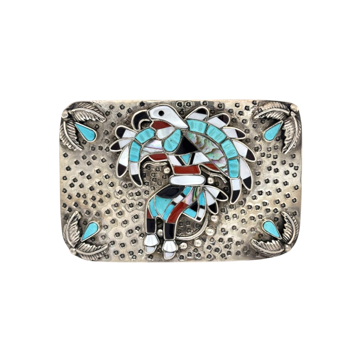 This Zuni handmade sterling silver buckle showcases a vibrant multi-stone inlay design, rich with cultural symbolism and masterful craftsmanship. At its center is a detailed depiction of a traditional Zuni dancer, brought to life with turquoise, coral, jet, mother of pearl, and abalone shell, each stone meticulously hand-cut and inlaid to form the intricate pattern. The textured silver background adds depth, while four corner feather motifs, accented with turquoise, frame the central figure beautifully. Every curve and detail reflect the precision and artistry for which Zuni silversmiths are celebrated. The harmonious blend of colors and materials tells a story of tradition, ceremony, and the deep connection between art and heritage.