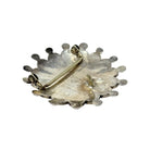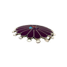 Crafted by skilled Zuni artisan Pauline Lonjose, this sterling silver buckle radiates beauty through its vibrant multi-stone inlay work. Shaped like a blossoming flower, each petal is meticulously inlaid with deep purple stone, accented by sterling silver channels for a clean and precise finish. At the heart of the design lies a traditional Zuni Sun face motif, brought to life with turquoise, coral, and shell, symbolizing harmony, balance, and the cycles of life. The outer edge is adorned with polished silver domes, adding texture and dimension to the piece. Every stone is hand-cut and set with care, a hallmark of the Zuni inlay tradition that has been passed down for generations.