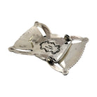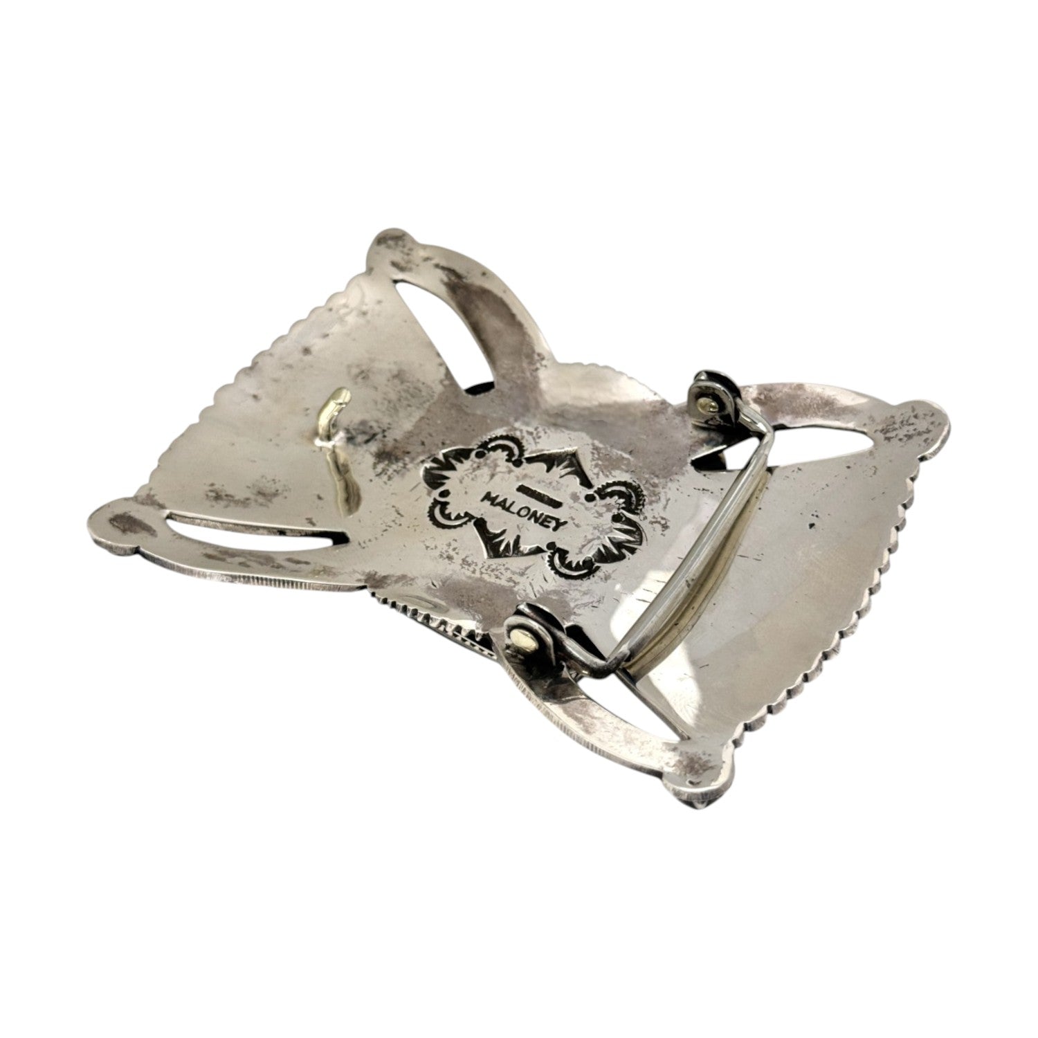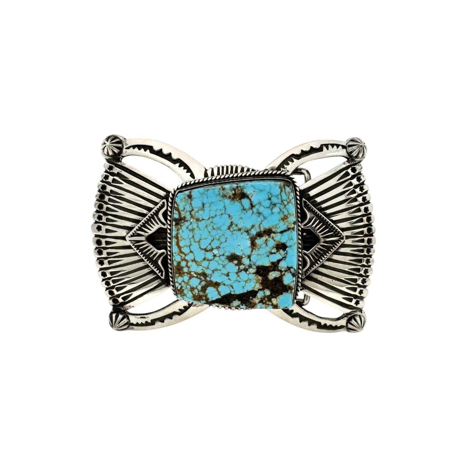 Handcrafted by Navajo silversmith Leonard Maloney, this sterling silver buckle features the exceptional beauty of a large Number Eight Turquoise stone. Known for its brilliant blue color and intricate golden-brown matrix, the stone is framed in a bold bezel that draws the eye to its natural artistry. Surrounding the centerpiece is an intricate display of hand-stamped silverwork, with radiating fan designs and precise geometric patterns that showcase Maloney’s refined craftsmanship. The openwork elements add depth and dimension, giving the buckle a balanced blend of strength and elegance. Each detail is created entirely by hand, ensuring a one-of-a-kind piece that honors the traditions of Navajo silversmithing.