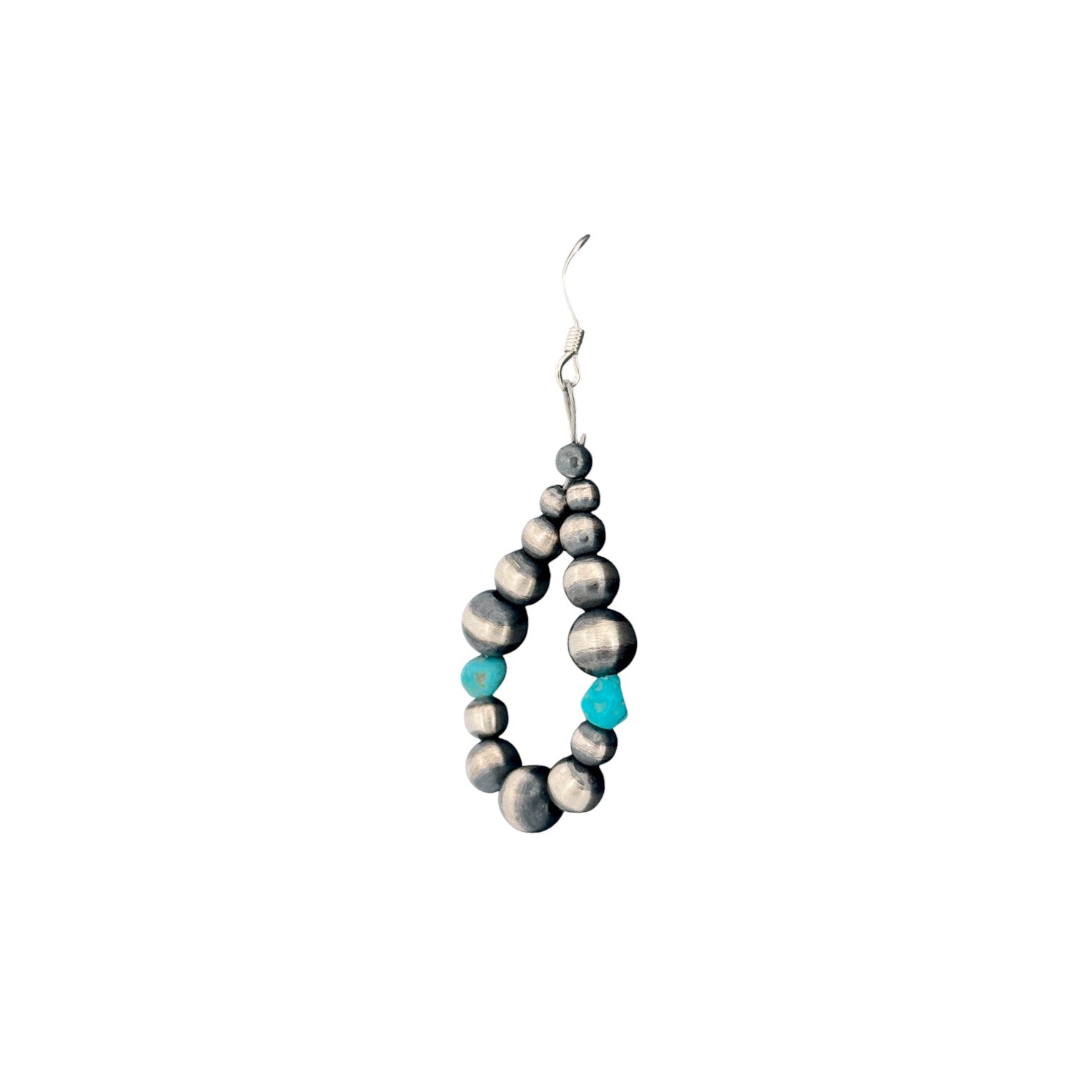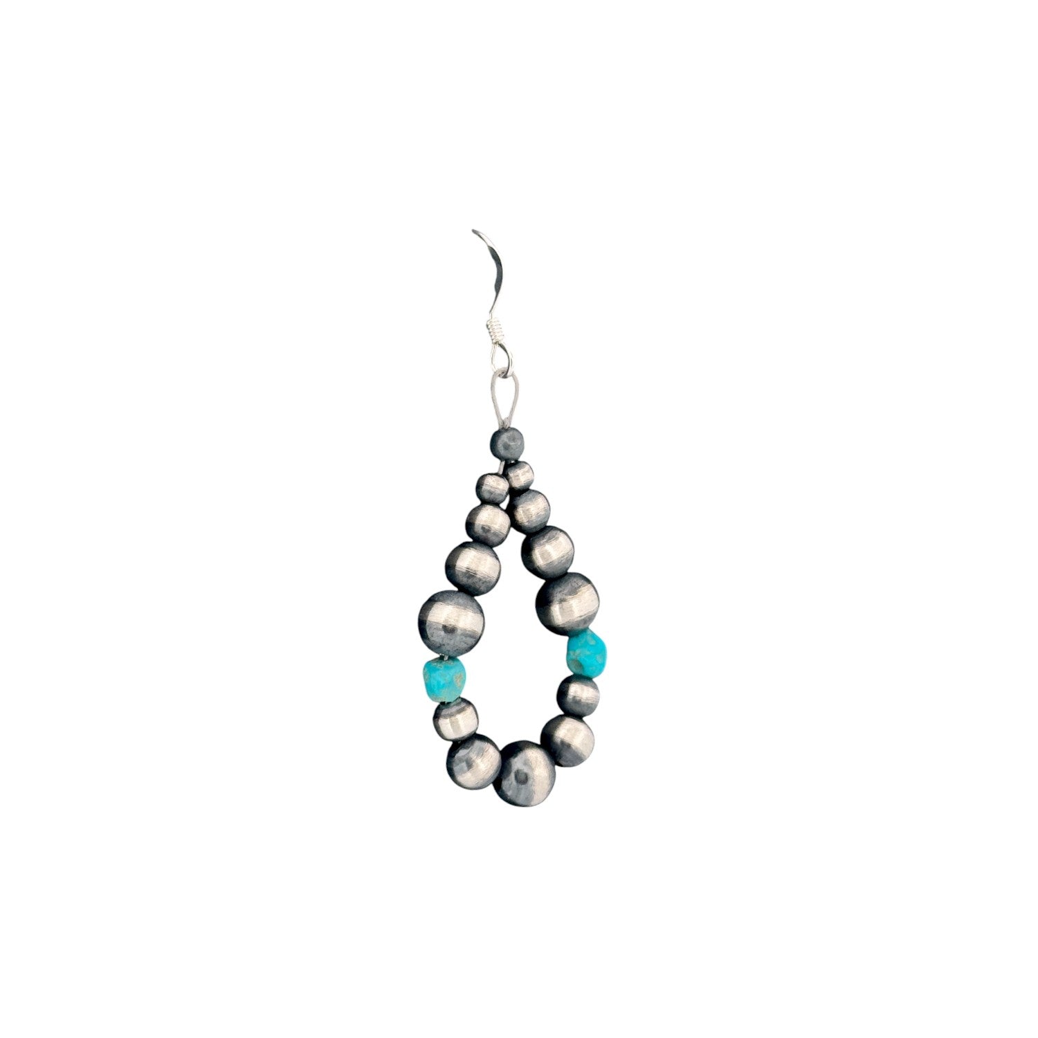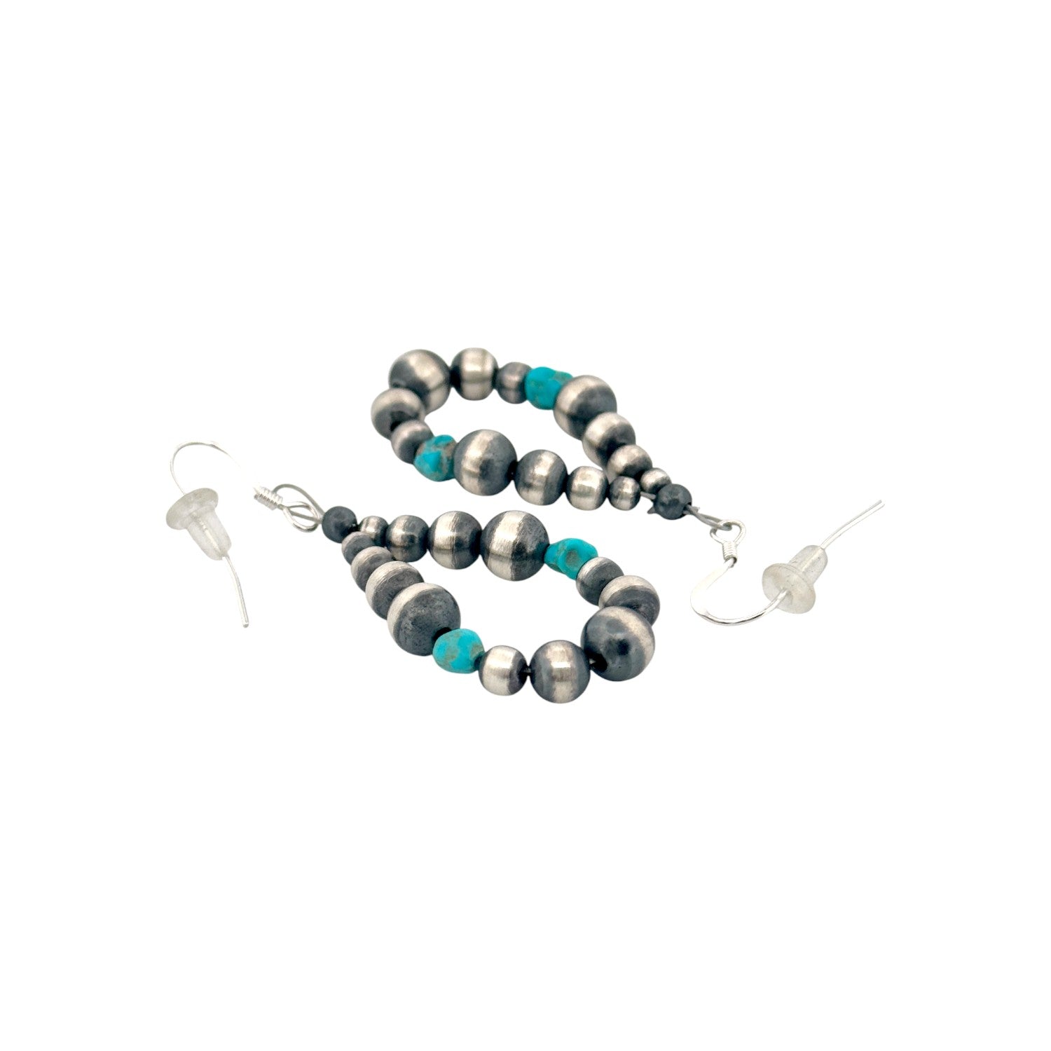 These elegant earrings feature machine-made sterling silver pearls paired with brilliant Kingman Turquoise stones. Each pair is lovingly hand-strung by a local Native artisan, blending precision and cultural artistry. The smooth silver beads highlight the rich blue hues of the turquoise, creating a classic Southwestern balance. Lightweight and refined, they’re perfect for both everyday wear and special occasions. A timeless showcase of Native craftsmanship and enduring beauty.